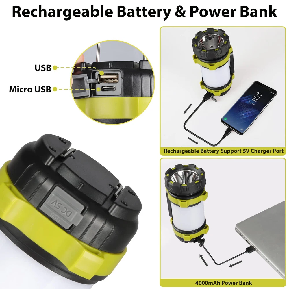High Lumens Flashlight & 6 Modes: The camping lantern with high/low brightness mode provide a brightness of up to 1000LM light over a beam distance of 300m to meet the effective distance need in life. The white side light with high/low brightness mode can as a lantern with 360° beam angle, provide you a full range of lighting in the dark. The red side light with stable/strobe mode can as a warning or lifesaver in an emergency, you can give out an SOS signal to get help from around. USB Rechargeable & 4000 Capacity Power Bank: With built-in rechargeable batteries, the lantern flashlights can be charged via a regular 5V USB charging cable (included), more convenient than other lanterns that need AA batteries. No need to waste money replacing batteries frequently. The lantern flashlight can also serve as a 4000mAh power bank to charge other smart devices in an emergency that no need to worry about losing contact due to a dead phone during the trip. IPX5 Waterproof & Drop-resistant & Durable: Constructed with durable ABS material and IPX5 waterproof design, the camping flashlight can provide maximum durability and water resistance whenever or wherever you go. The military-grade material and compact structure with good crash resistance can effectively prevent damage from the collision and drop. The IPX5 waterproof rating and the rubber cover of the USB port can easily resist water splash from all angles in any adverse weather conditions. Portable & Hanging & Lightweight: The led tent lantern lamp is a portable size (6.93 x 3.15in) and lightweight (0.77lb/pcs), smart construction and streamlined design allow you to take lantern on the go with ease. The easy-to-grip handle is especially suitable for long-time carrying in outdoor night activities. Each camp light also equipped with a two-way hook and lanyard, easy to hang on backpacks, tent or tree branches to free your hands. It can also be hung high for help in case of emergency. Easy operation & Wide Application: The camping lanterns battery operated is is easy-to-use with just a press of a button to brighten the area in just a second. The camping essentials light is your steadfast companion for any outdoor escapade or unexpected situation. Whether you're camping under the stars, hiking rugged trails, fishing at dawn, navigating a boat by moonlight, fixing your car in the dark, or braving a power outage, this dependable light source will guide your way. Please use a 5V charger for charging, in order to achieve better charging efficiency. When fully charged, the indicator light turns red to blue.