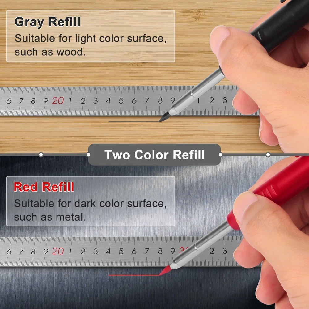 [Long Nib and Deep Hole Marker]: Our mechanical carpenter pencil with 45mm nib is designed for easy marking of deep holes or narrow areas. These construction pencils are the great choice for woodworking tools, construction tools, carpenter tools, contractor tools, wood carpentry tools and architect tools. [Extra Refills in 2 Colors for Versatile Marking]: The construction mechanical pencil comes with 12 extra 2.8mm refills, including 6 red and 6 black refills. The black refill is suitable for light surfaces, while the red wax is perfect for dark surfaces. Our carpenter mechanical pencil makes sure that you'll have an ample supply for extended use. [Built-in Sharpener]: Our construction pencil comes with a built-in sharpener to ensure the mechanical pencil tip is always sharp and ready for use. Never buy an extra pencil sharpener again. A great tool for any woodworker pencil, contractor pencils. The refill can easily be extended or retracted with a simple click of the pencils mechanical, allowing you to work more efficiently and accurately. [Portable Clip Design]: Our deep hole construction pencil features a portable clip design, easy to carry and attach to your pocket or tool box, so that you can keep the carpenter pencils mechanical close at hand, making it a convenient tool to have on the go. Great gifts choice for carpenters. [Stronger Pencil Lead]: The black refills are made of lead, sturdy and smooth. The red refills are made of wax, clear and light. These marking pencils are much thicker and stronger than normal pencils during the marking process of construction work, suitable for various surfaces, such as glasses, metal, boards, floors, walls, furniture, etc. The written marks can be easily wiped with a wet paper towel when needed. [Precise marking with 2.8 mm tip]: With a 2.8 mm tip, our deep hole pencil produce smooth and clear lines for finer and more precise scribing and marking. Perfect for all marking tasks in deep holes, corners, curved surfaces, etc. Our woodworking pencils set is an essential multi-tool pencil for sketching construction, marking tool for carpenters, pencil tool for architects. [Comfortable and Ergonomic Grip]: The mechanical construction pencils feature a comfort grip design that provides a comfortable hold. The groove of the pencil body provide the friction and reduce pain, allowing you to work for extended periods without discomfort. Our work pencil are the perfect tool for professionals and carpenters, such as bricklayers and tilers, enabling you to focus on your work without feeling any pressure. Great for marking cuts,drawing sketches and renderings.