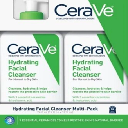 Developed with dermatologists, CeraVe Hydrating Facial Cleanser is a unique formula that cleanses, hydrates and helps restore the protective skin barrier with three essential ceramides (1, 3, 6-II). The formula also contains hyaluronic acid to help retain skin’s natural moisture. Holds National Eczema Association (NEA) Seal of Acceptance SUITABLE FOR: Daily cleansing morning (AM) and night (PM) for normal to dry skin, including sensitive skin, as a facial cleanser, body wash and/or hand soap. Unisex SUSTAINABILITY: This CeraVe product is Cradle to Cradle Certified at the silver level. Cradle to Cradle Certified is the world's most advanced science based multi attribute certification program for designing, making and verifying materials and products that are sage, circular and responsibly made. NEW PACKAGING - Our new CeraVe bottles, contain the same Developed with Dermatologists formulas you know and love and the same amount. The bottles are now made with LESS plastic* and 100% Recycled plastic (excluding the pump). *12 oz bottle size contains 21% less plastic than current bottle CeraVe is the #1 Dermatologist Recommended Skincare Brand CeraVe Hydrating Facial Cleanser, Daily Face and Body Wash for Normal to Dry Skin Removes face makeup, dirt, and excess oil, provides 24-hour hydration and leaves a moisturized, non-greasy feel. Moisturizing face wash with a lotion-like consistency feels smooth as it cleanses, even on sensitive, dry skin. Fragrance-free, paraben-free, non-drying and non-comedogenic (meaning it won't clog pores). Certified by the National Eczema Association Skin Cleanser for face and/or body and can be used as a hand wash. Suitable for daily cleansing morning (AM) and night (PM) for normal to dry skin. Daily face wash with hyaluronic acid, ceramides, and glycerin to help hydrate skin without stripping moisture. Hyaluronic Acid attracts hydration to the skin’s surface and helps the skin retain moisture. Ceramides are found naturally in the skin and make up 50% of the lipids in the skin barrier. All CeraVe products, formulated with three essential ceramides (1, 3, 6-II) to help maintain the skin’s natural barrier. CeraVe Skincare is developed with dermatologists and has products suitable for dry skin, sensitive skin, oily skin, acne-prone, and more.