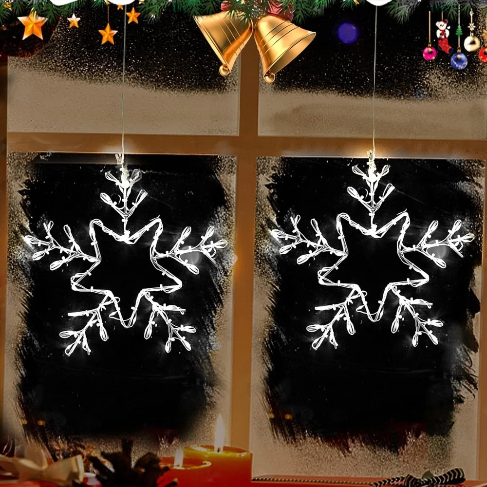 The large candy&bell window light adopts a combination of multiple color LED lighting designs, making the windows emit quiet light and adding a Christmas atmosphere to many places such as the living room, bedroom, corridor, and store. You will receive: 2 X window lights 4 X hooks 2 X battery boxs 2 X USB data cables Family Christmas window decoration: The large snowflake window lights adopt a blue LED lighting combination design, making the windows emit quiet light and adding a Christmas atmosphere to many places such as the living room, bedroom, corridor, store, and so on. Two power supply modes: powered by 3 AAA batteries (not included), with low power consumption. When replacing the battery, simply slide out the battery door and you can easily replace it. You can also use a USB data cable to provide you with a long-lasting and stable power supply. Best hanging Christmas lights:Classic Christmas shaped colored lights, without unnecessary worries or doubts when choosing gifts, can be used as holiday gifts, housewarming gifts, or birthday gifts. These decorative colored lights will become the best choice for family, friends, relatives, or colleagues. Reliable material: The iron frame structure makes the lighting fixtures more reliable and elegant, and it won't easily break down after long use; The LED is firmly tied to the frame, and the snowflake lights adopts high-end manufacturing technology, making it a better choice than plastic lights. Package includes: Christmas snowflake window decoration includes 2 snowflake lights, 4 transparent hooks, each snowflake light comes with a battery box (excluding batteries), you will be able to decorate the house and surprise your family and friends every year.