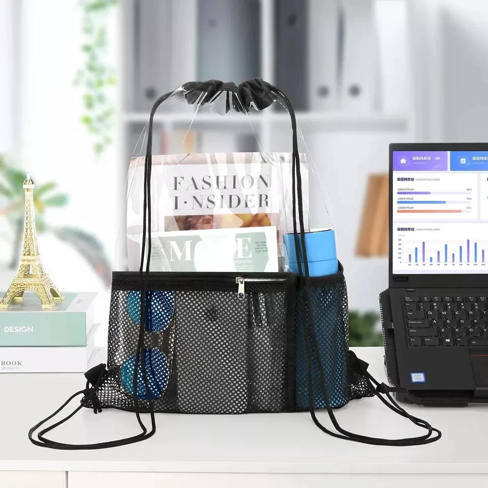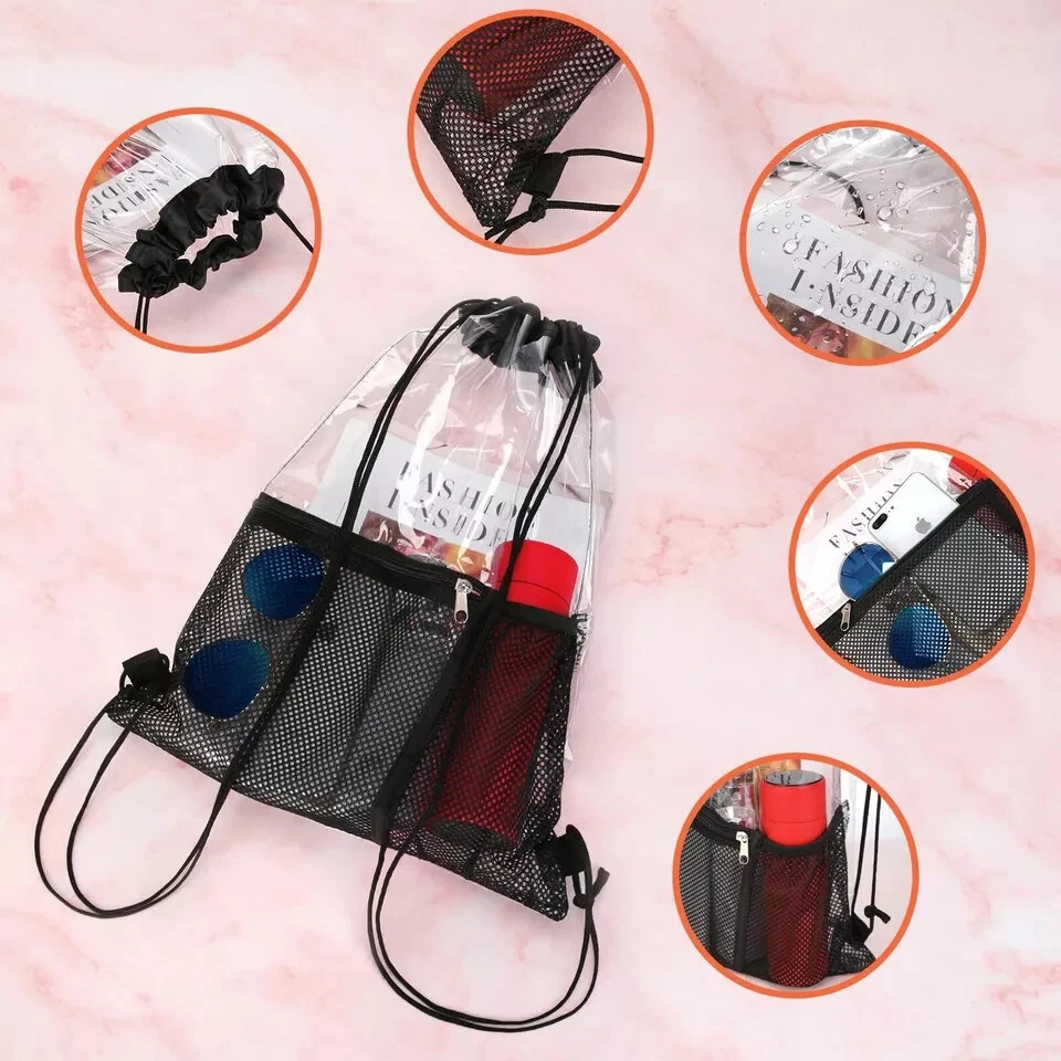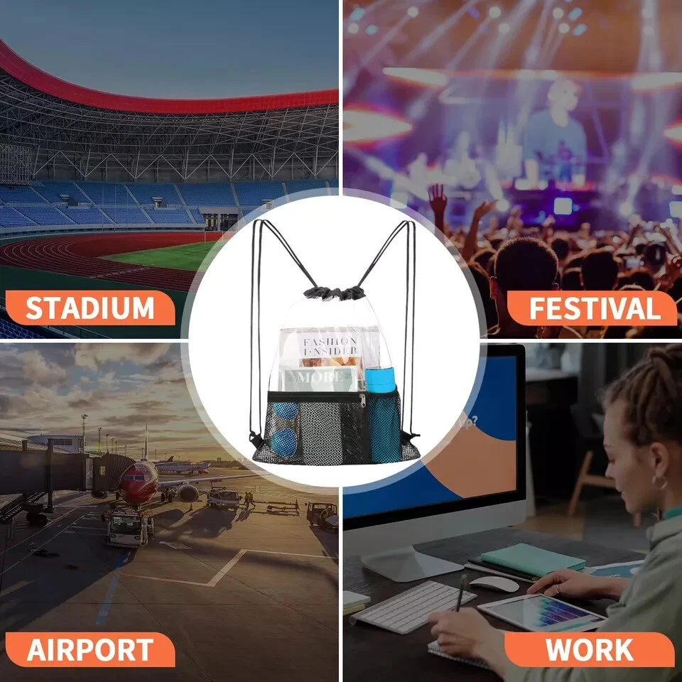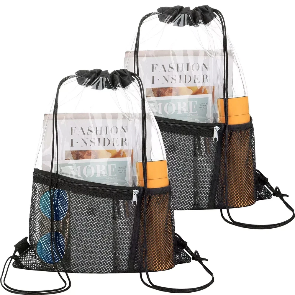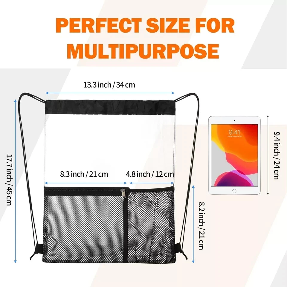 2 Pack Clear Drawstring Bag Stadium Approved PVC Drawstring Backpack for Concert Features: QUALITY MADE - Made of 0.4mm PVC which feels strong , but not so thick that it feels stiff and rigid. clear material and daily waterproof.The completely see-through bag allows you to get through security check easily. PERFECT SIZE - Size 17.7*13.3 inch/45*34cm, mesh pocket size 8.3*8.3inch/21*21cm. bottle pocket size 4.8*8.2inch/12*21cm. Big enough and convenient for your daily needs.Front accessory pocket and bottle pocket, Make you store things quickly. BREEZE THROUGH STADIUM SECURITY - If you’re a sports fan going to a game, the last thing you want to do is waste tons of time by having security dig through your normal bags; this transparent drawstring bag lets you breeze through security!Perfect for for work, gym, concerts, music festivals,sporting events,travel,correctional officer FIND ITEMS FASTER - With clear surface, this clear bag perfect for taking outside as you could find your important items quickly and check if something missing, much convenient when you running, travelling or going to the concert. Adjustable Drawstring Strap - String length can be adjusted through the knots, and long enough for most people Description: Description 2-Pack Clear Drawstring Bags with Front Accessory Pocket and Bottle Pocket This clear string bag is the perfect combination of comfort, convenience and style. Whether you are going to sporting events, amusement park, camping or family vacation, it will be your perfect choice This clear tote bag also can be widely used as Clear Concert Bag Clear Work Bag Clear Travel Bag Clear Toiletry Bag Clear Makeup Bag Clear Lunch Bag Clear Picnic Bag Clear Beach Bag Clear Security Bag PREMIUM UPGRADED FEATURES: -Made of high quality PVC material -Lightweight, Portable -Front accessory pocket and bottle pocket -Waterproof -Adjustable strap -Stadium SECURITY Approved Package includes:2 Pieces clear Drawstring bags