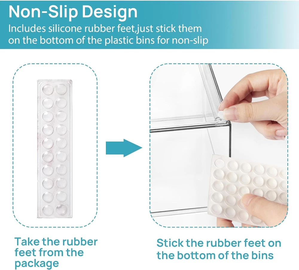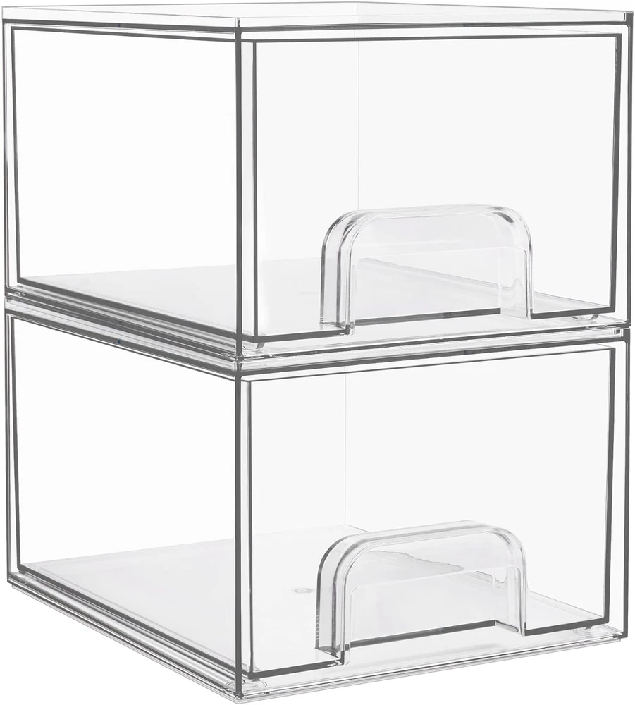 [Multi-Purpose Organizers] Our storage drawers help you to organize everywhere in your home, they can be used as organizers and storage for makeup, bathroom countertop, kitchen or laundry under sink, medicine cabinet, pantry, vanity. You can flexibly use our storage organizer for house organization and storage according to your needs. [Stackable Design] Come with two drawer storage organizers, each organizer measures 7.5"D x 6"W x 4.4"H. The storage containers are stackable, vertical storage will save a lot of space. You can also use them side by side. Put your small objects on top of acrylic bins to make your countertop space more tidy. [Built-in Handle and Non-Slip] The storage containers are designed with pull-out handles, it is convenient for you to store and take out items.Extra silicone pads are included, just stick them on the bottom of the outer box for non-slip,the outer box will not move when the drawer is pulled out,providing you with easy organization and storage. [Keep Your Home Organized] Our acrylic organizer bins help you to organize your home with style. They are clear, which help you to identify contents easily. Keep items contained, organized and dust-free and create a neat space of your bathrooms, laundry, bedrooms, offices, garages, toy rooms, craft rooms and playrooms, refrigerator, cupboards or pantry shelves. [Qualtity Construction and Easy to Clean] Made of durable BPA free shatter-resistant plastic. The sturdy, transparent and fashionable design is compatible with decoration of any rooms. PLEASE DO NOT PUT IN DISHWASHER. Easily clean with soap and warm water. Product Description " data-position="triggerHorizontal"> Dimensions 7.5"D x 6"W x 7.6"H " data-position="triggerHorizontal"> Dimensions 7.5"D x 12"W x 3.5"H " data-position="triggerHorizontal"> 1 UnderSink Organizer 2 Bathroom Organizer 3 Cabinet Organizer 4 Laundryroom Organizer 5 Pantry Organizer More Details Display Unique handle design Built in easy-grip side handles make the drawer easy to pull out. Non-slip Silicone Pads The silicone pads are included in package, just stick it on the bottom of the box for non-slip,the outerbox will stay in place when the drawer slides! Unique track design The track is smooth. It doesn't get stuck when you open or close it.They fit good amount or things and easy slide in and out. Update style The drawer and the outer box fit complete, will increase the use space of the drawer. Various Storage Drawers for House Organization and Storage Compare Vtopmart Stackable Drawers Add to Cart Add to Cart Add to Cart Add to Cart Add to Cart Add to Cart Add to Cart Customer Reviews 4.6 out of 5 stars 4,044 4.6 out of 5 stars 3,349 4.7 out of 5 stars 512 4.8 out of 5 stars 964 4.7 out of 5 stars 502 4.8 out of 5 stars 70 5.0 out of 5 stars 2 Price $26.99 $ 26 . 99 $29.99 $ 29 . 99 $34.99 $ 34 . 99 $26.99 $ 26 . 99 $26.99 $ 26 . 99 $41.99 $ 41 . 99 $37.99 $ 37 . 99 Size 7.5"D x 6"W x 4.4"H 7.5"D x 6"W x 6.6"H 7.5"D x 6"W x 7.6"H 7.5"D x 12"W x 3.5"H 7.5"D x 12"W x 7.8"H 7.5"D x 12"W x 15.4"H 7.5"D x 12"W x 14.4"H Package Quantity 4 PCS 4 PCS 4 PCS 2PCS 3PCS 5 PCS 4 PCS Material Plastic Plastic Plastic Plastic Plastic Plastic Plastic Included Non-slip Silicon Pads ✔ ✔ ✔ ✔ ✔ ✔ ✔ Dishwasher ✘ ✘ ✘ ✘ ✘ ✘ ✘ Great for Cosmectic,jars,small items Skin cream,foundation Skincare,lotion Makeup platter,face mask Makeup platter,nail polish Makeup,nail polish Skincare,lotion What material are these drawers made of? Hello,these storage drawers are made by Polyethylene (PET) material. What can these storage drawers hold? These drawers can be used for a variety of purposes. You can organize toiletries and care items in the bathroom sink or cabinet, such as sponges, cotton swabs, sunscreen, nail polish, tampons, hair accessories, medicines small items etc.... Are there non-slip pads provided so that the drawer will not slide during the pulling process? Yes.There are non-slip pads provided to keep the drawer not to slide during the pulling process, then you can use it easily.