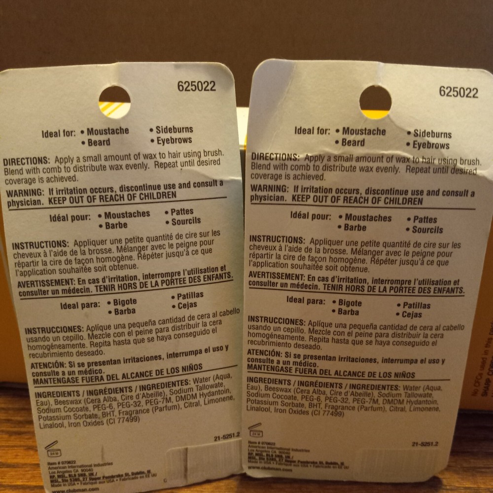 2 Pack Clubman Moustache Wax Black 0.5 oz Brand: Clubman Moustache Item: Mustache Wax Color: Black Size: 0.5 oz Each Pack Includes: 2 Packs --- (In Each Pack There Is 1 Mustache Wax & Comb) New In Package. Package Shows Some Wear