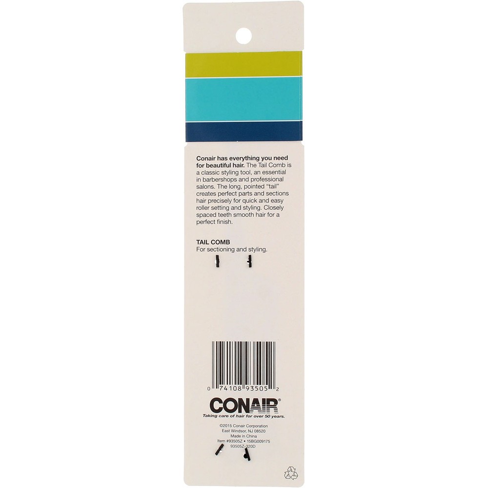 Product Description For sectioning styling. Chemical resistant. Conair has everything you need for beautiful hair. The Tail Comb is a classic styling tool an essential in barber shops and professional salons. The long pointed tail creates perfect parts and sections hair precisely for quick and easy roller setting and styling. Closely spaced teeth smooth hair for a perfect finish. Safe for use with chemical-based styling products. The Tail Comb is a classic styling tool, an essential in barber shops and professional salons The long pointed tail creates perfect parts and sections hair precisely for quick and easy roller setting and styling Con Tail Comb Size Ea Conair Tail Comb Product Description For sectioning styling. Chemical resistant. Conair has everything you need for beautiful hair. The Tail Comb is a classic styling tool an essential in barber shops and professional salons. The long pointed tail creates perfect parts and sections hair precisely for quick and easy roller setting and styling. Closely spaced teeth smooth hair for a perfect finish. Safe for use with chemical-based styling products. The Tail Comb is a classic styling tool, an essential in barber shops and professional salons The long pointed tail creates perfect parts and sections hair precisely for quick and easy roller setting and styling Con Tail Comb Size Ea Conair Tail Comb Warnings Disclaimer The product descriptions and instructions provided by vitabox.com are for informational purposes only and are qualified in their entirety by the information available from manufacturers of the products. You should carefully read all product packaging, and contact the manufacturer with any questions before using a product. While we endeavor to ensure that product descriptions are current, manufacturers sometimes change their products. We are not liable for inaccuracies or misstatements about products. We do not provide medical advice or recommendations. You should not use the information provided by vitabox.com for diagnosing or treating a health problem or disease. If you have or suspect that you have a medical problem, immediately contact your health care provider. Information and statements regarding dietary supplements have not been evaluated by the Food and Drug Administration or any other government agency and are not intended to diagnose, treat, cure, or prevent any disease. Disclaimer The product descriptions and instructions provided by vitabox.com are for informational purposes only and are qualified in their entirety by the information available from manufacturers of the products. You should carefully read all product packaging, and contact the manufacturer with any questions before using a product. While we endeavor to ensure that product descriptions are current, manufacturers sometimes change their products. We are not liable for inaccuracies or misstatements about products. We do not provide medical advice or recommendations. You should not use the information provided by vitabox.com for diagnosing or treating a health problem or disease. If you have or suspect that you have a medical problem, immediately contact your health care provider. Information and statements regarding dietary supplements have not been evaluated by the Food and Drug Administration or any other government agency and are not intended to diagnose, treat, cure, or prevent any disease.