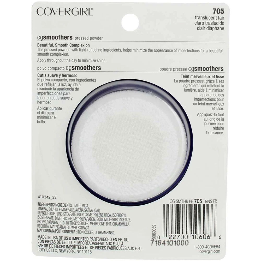 Product Description Add a flawless final touch to your look with COVERGIRL Smoothers Pressed Powder. This pressed powder with light-reflecting ingredients helps minimize the appearance of imperfections to give you a beautiful, smooth complexion. It also contains chamomile to help create a perfectly finished look that lasts. Ingredients Water, Cyclopentasiloxane, Glycerin, Talc, Sodium Chloride, Peg/Ppg-18/18 Dimethicone, Arachidyl Behenate, Sodium Dehydroacetate, Phenoxyethanol, Stearic Acid, Ethylene Brassylate, Trihydroxystearin, Trisodium Edta, Silica, Dimethicone, Synthetic Wax, Propylparaben, Barium Sulfate, Methicone, Aluminum Hydroxide, Laureth-7, Titanium Dioxide, Iron Oxides, Mica. Product Description Add a flawless final touch to your look with COVERGIRL Smoothers Pressed Powder. This pressed powder with light-reflecting ingredients helps minimize the appearance of imperfections to give you a beautiful, smooth complexion. It also contains chamomile to help create a perfectly finished look that lasts. Ingredients Water, Cyclopentasiloxane, Glycerin, Talc, Sodium Chloride, Peg/Ppg-18/18 Dimethicone, Arachidyl Behenate, Sodium Dehydroacetate, Phenoxyethanol, Stearic Acid, Ethylene Brassylate, Trihydroxystearin, Trisodium Edta, Silica, Dimethicone, Synthetic Wax, Propylparaben, Barium Sulfate, Methicone, Aluminum Hydroxide, Laureth-7, Titanium Dioxide, Iron Oxides, Mica. Disclaimer The product descriptions and instructions provided by vitabox.com are for informational purposes only and are qualified in their entirety by the information available from manufacturers of the products. You should carefully read all product packaging, and contact the manufacturer with any questions before using a product. While we endeavor to ensure that product descriptions are current, manufacturers sometimes change their products. We are not liable for inaccuracies or misstatements about products. We do not provide medical advice or recommendations. You should not use the information provided by vitabox.com for diagnosing or treating a health problem or disease. If you have or suspect that you have a medical problem, immediately contact your health care provider. Information and statements regarding dietary supplements have not been evaluated by the Food and Drug Administration or any other government agency and are not intended to diagnose, treat, cure, or prevent any disease.