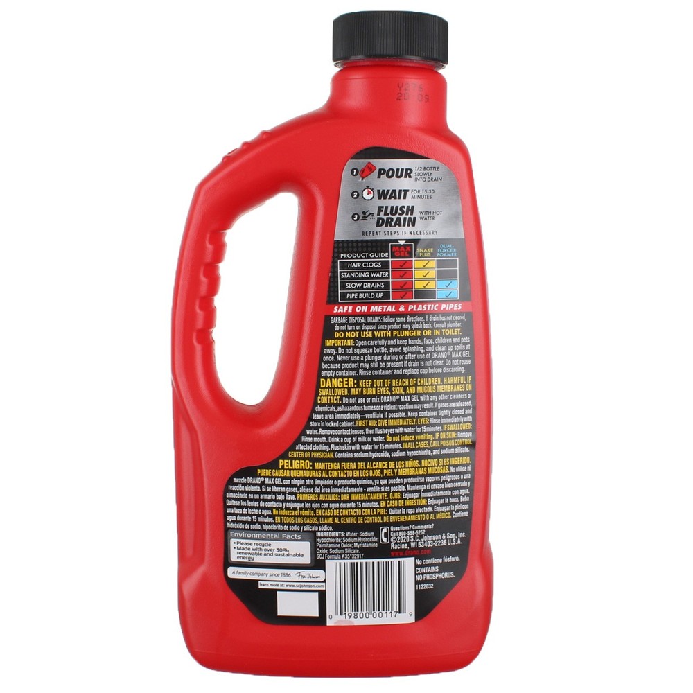 Product Description The thickened bleach formula in Drano Max Gel Clog Remover cuts right through standing water, clinging to your tough clogs to blast them fast. It works great to remove hair, soap scum, and other gunky clogs. It’s guaranteed to work the first time or your money back. Clogs happen, but with Drano you and your drains are unstoppable. Formulated thick to dissolve the tough clogs fast Cuts through standing water straight to the clog Safe on PVC, metal pipes, garbage disposals and septic systems Has a special ingredient that protects pipes from corrosion Safe for plastic, PVC, metal pipes, garbage disposals and septic systems Contains no phosphorus Unscented One 80 fluid ounce bottle. Ingredients Bleach, Water, Cleaning Agent, Caustic, Corrosion Inhibitor. Product Description The thickened bleach formula in Drano Max Gel Clog Remover cuts right through standing water, clinging to your tough clogs to blast them fast. It works great to remove hair, soap scum, and other gunky clogs. It‚Äôs guaranteed to work the first time or your money back. Clogs happen, but with Drano you and your drains are unstoppable. Formulated thick to dissolve the tough clogs fast Cuts through standing water straight to the clog Safe on PVC, metal pipes, garbage disposals and septic systems Has a special ingredient that protects pipes from corrosion Safe for plastic, PVC, metal pipes, garbage disposals and septic systems Contains no phosphorus Unscented One 80 fluid ounce bottle. Ingredients Bleach, Water, Cleaning Agent, Caustic, Corrosion Inhibitor. Disclaimer The product descriptions and instructions provided by vitabox.com are for informational purposes only and are qualified in their entirety by the information available from manufacturers of the products. You should carefully read all product packaging, and contact the manufacturer with any questions before using a product. While we endeavor to ensure that product descriptions are current, manufacturers sometimes change their products. We are not liable for inaccuracies or misstatements about products. We do not provide medical advice or recommendations. You should not use the information provided by vitabox.com for diagnosing or treating a health problem or disease. If you have or suspect that you have a medical problem, immediately contact your health care provider. Information and statements regarding dietary supplements have not been evaluated by the Food and Drug Administration or any other government agency and are not intended to diagnose, treat, cure, or prevent any disease.
