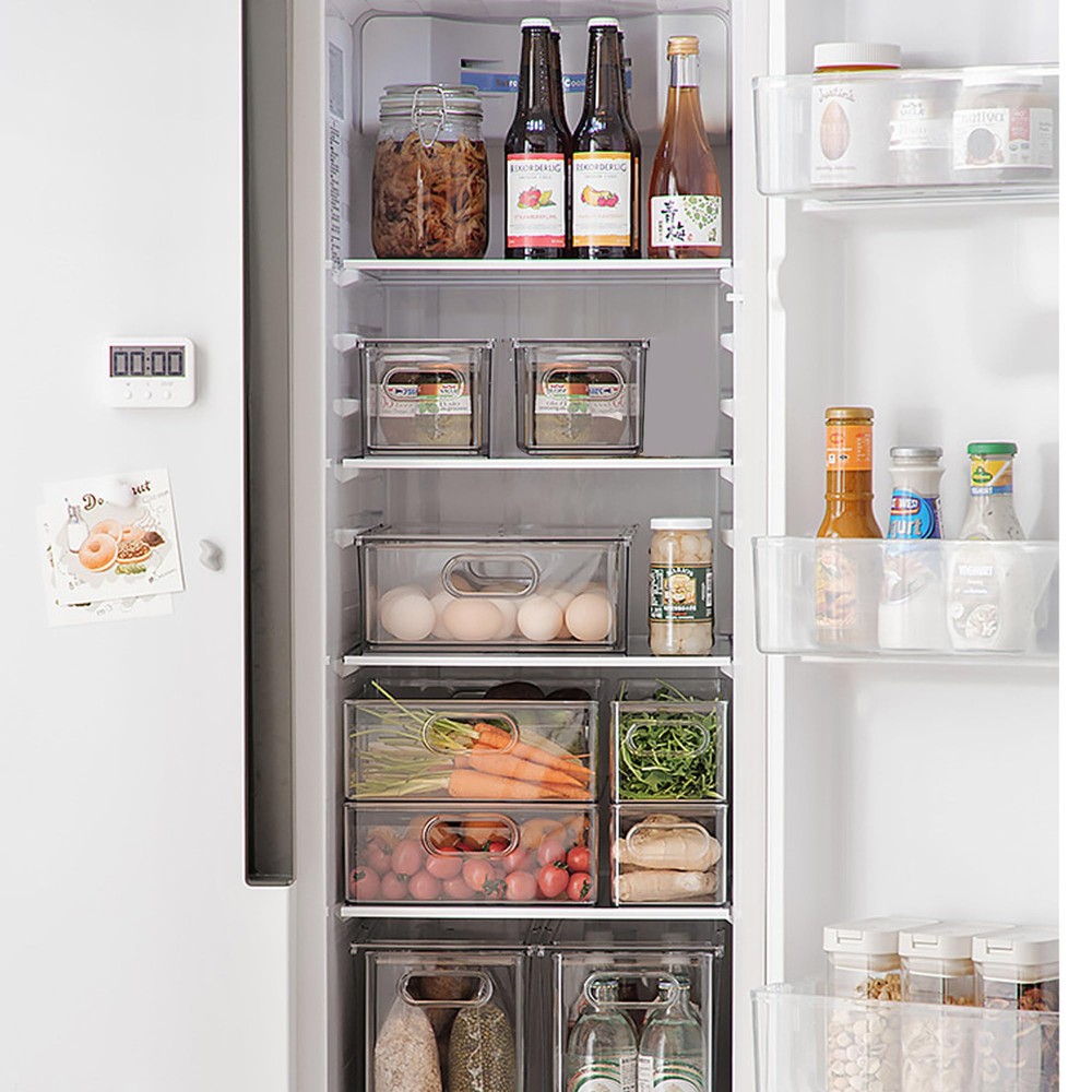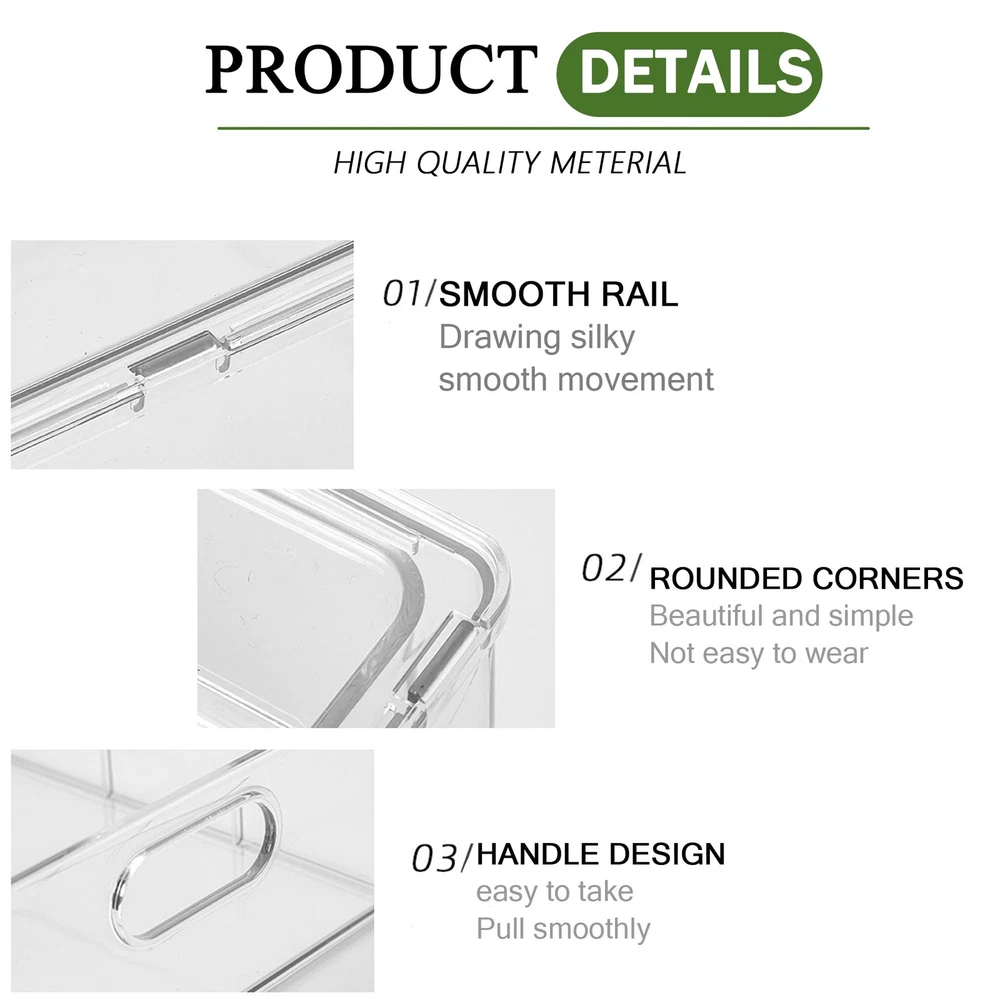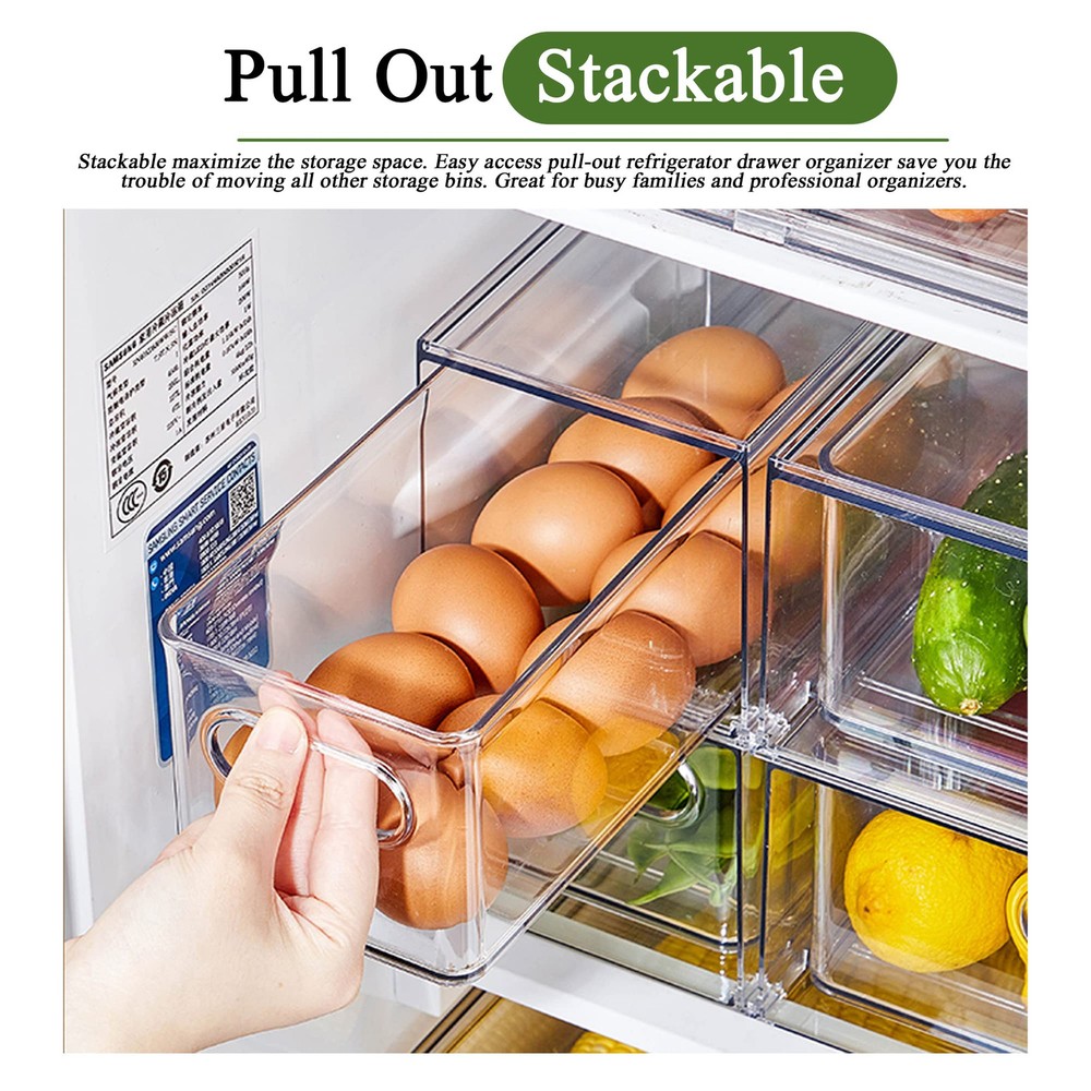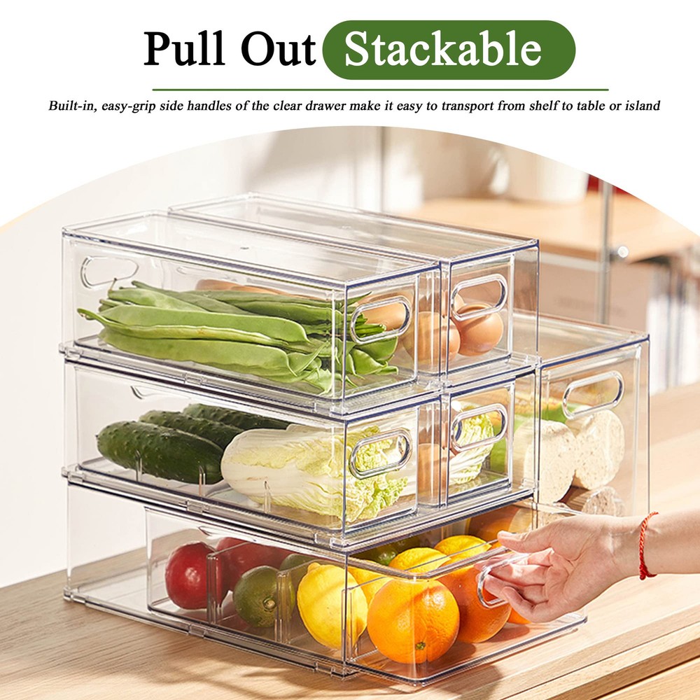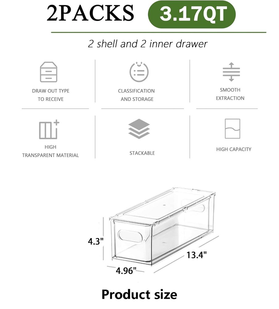 ใ๐๐๐๐ฅ๐ญ๐ก๐ฒ ๐๐ง๐ Sturdy ๐๐๐ญ๐๐ซ๐ข๐๐ฅใOur refrigerator organizer bins is made of more thicker, more sturdy, non-and tasteless PET materials than most similar products, this fridge organizer bins can resist high temperature and strong low temperature, very sturdy, so they can be used for a long time. Our fridge organizer is made of food-PET material without BPA, safe storage of food. Its high transparency design allow you to see clearly each of your groceries at all times to avoid food from going bad. Easily washed with warm water and soap. ใ๐๐ฎ๐ฅ๐ฅ ๐๐ฎ๐ญ & Stably ๐๐ญ๐๐๐ค๐๐๐ฅ๐ใOur clear storage bins are stackable drawer design. Built-in, easy-grip side handles make it easy to transport from shelf to table. Add more room and more by stacking these fridge organizer drawers to gain vertical storage. With anti-slip particles, installed at the bottom of these storage bins, can ensure stability when stacked, and don't tip over. ใ๐๐๐ซ๐ฌ๐๐ญ๐ข๐ฅ๐ ๐๐ฌ๐ใOur multi-functional stackable storage drawer can not only be placed in refrigerators, freezers, cabinets, for storing vegetables, fruits, eggs, cheese, milk, condiments, meat or canned drinks, etc. They are also very suitable for office, bedrooms, bathrooms storing toys, cosmetics and any small items in life. These storage bins can be used in any room of home. ใ๐๐ง๐ก๐๐ง๐๐ ๐๐๐ซ๐ญ๐ข๐๐๐ฅ ๐๐ฉ๐๐๐ ๐๐ญ๐ข๐ฅ๐ข๐ณ๐๐ญ๐ข๐จ๐งใCreate storage on top for deli, fruits or dairy products by placing the fridge organizer bins side by side or stacking. Clear view make everything you need can be easily find without removing the refrigerator organizing drawers. Use individually or together to have a custom storage system. Keep items contained, organized and dust-free making it easier to take them out. ( Note: this is a small size, 2 medium fridge drawers 13.4x 4.96 x 4.3 inches.). ใ๐๐๐๐ค๐๐ ๐ ๐ข๐ง๐๐ฅ๐ฎ๐๐ใ Measures 1 Package includes 2 shell and 2 inner drawer. identical 3.17-quart (13.4"L x 4.96"W x 4.3"H)drawer storage boxes can meet all your needs.Do not place the plastic storage bins in dishwasher.(Please confirm the size is suitable for your fridge.)