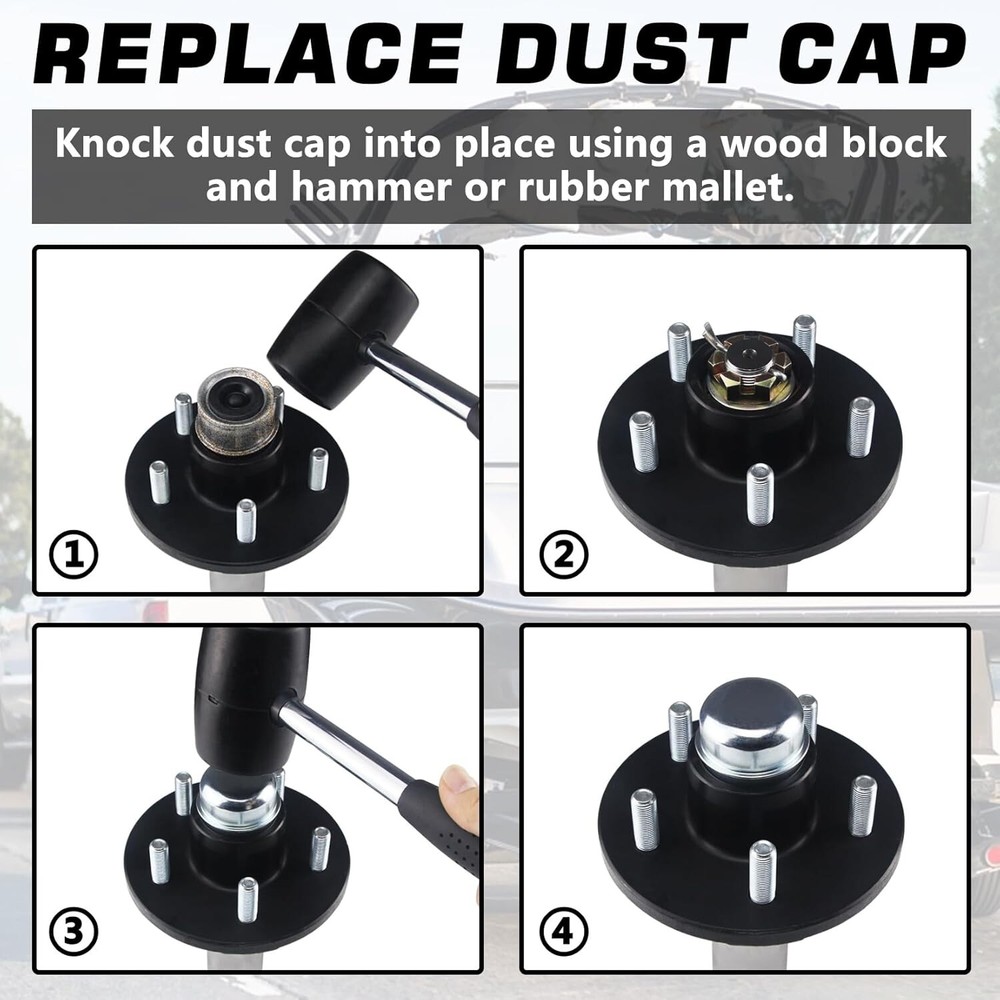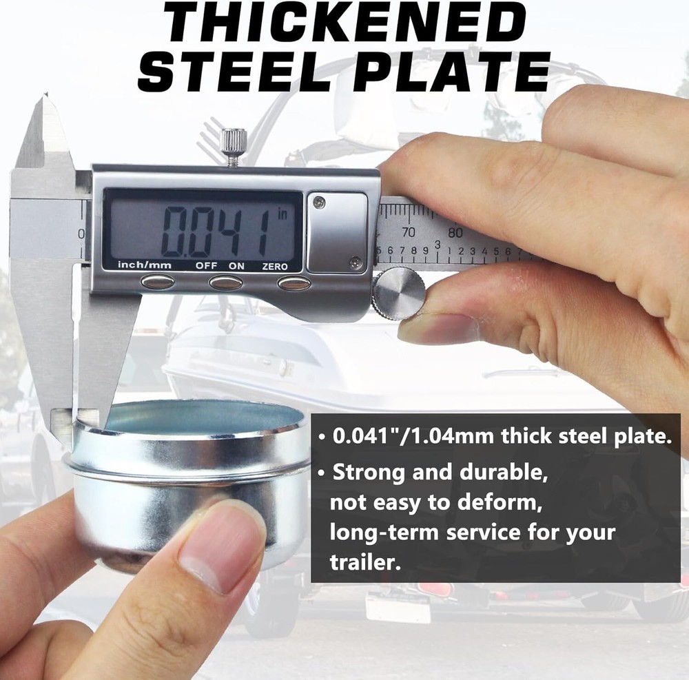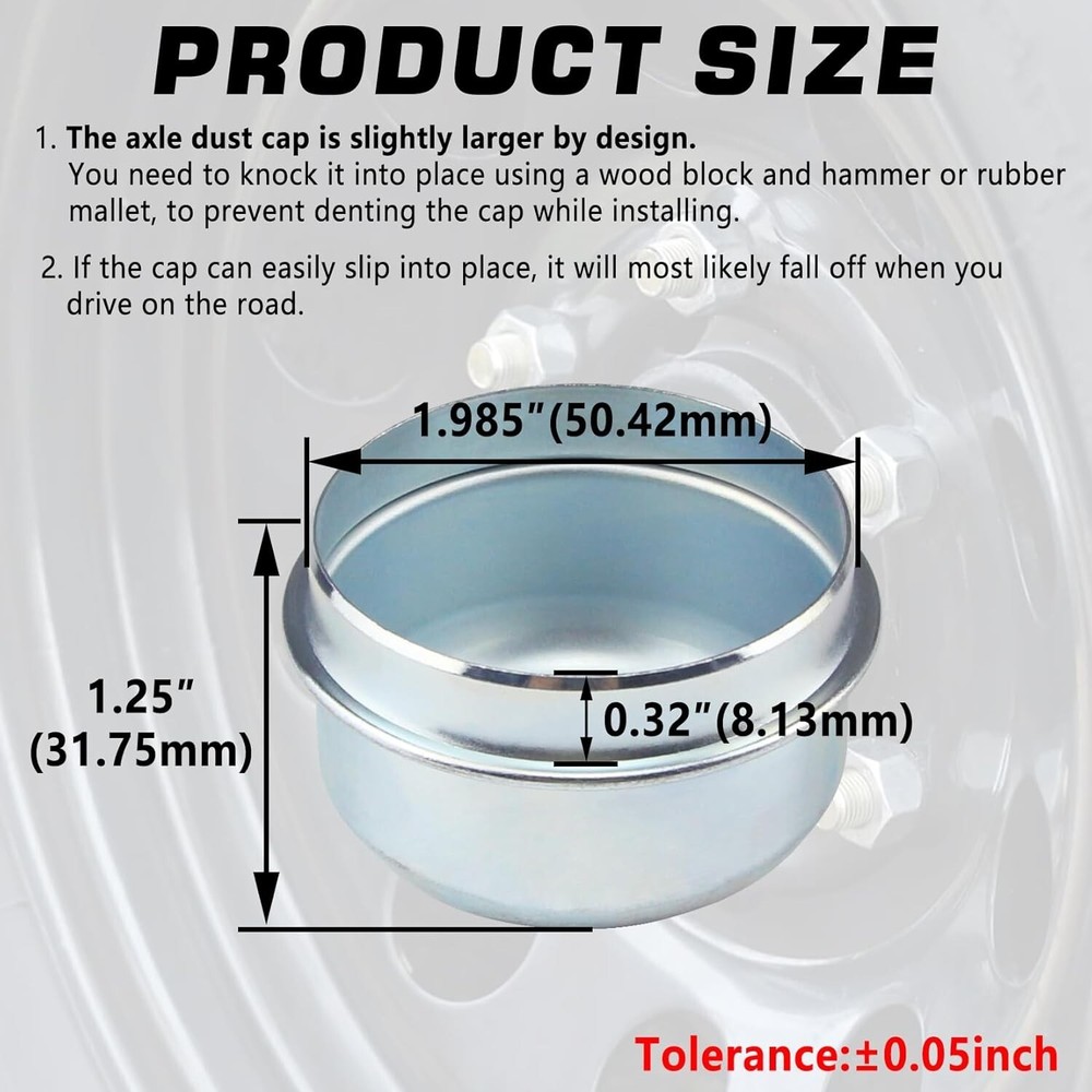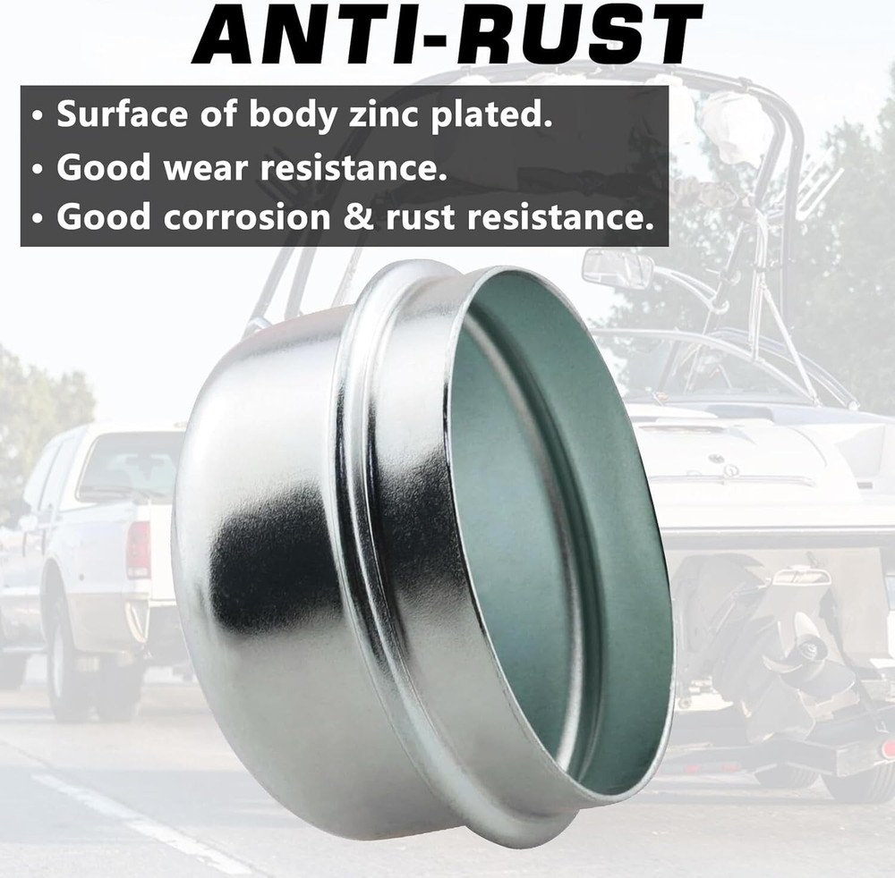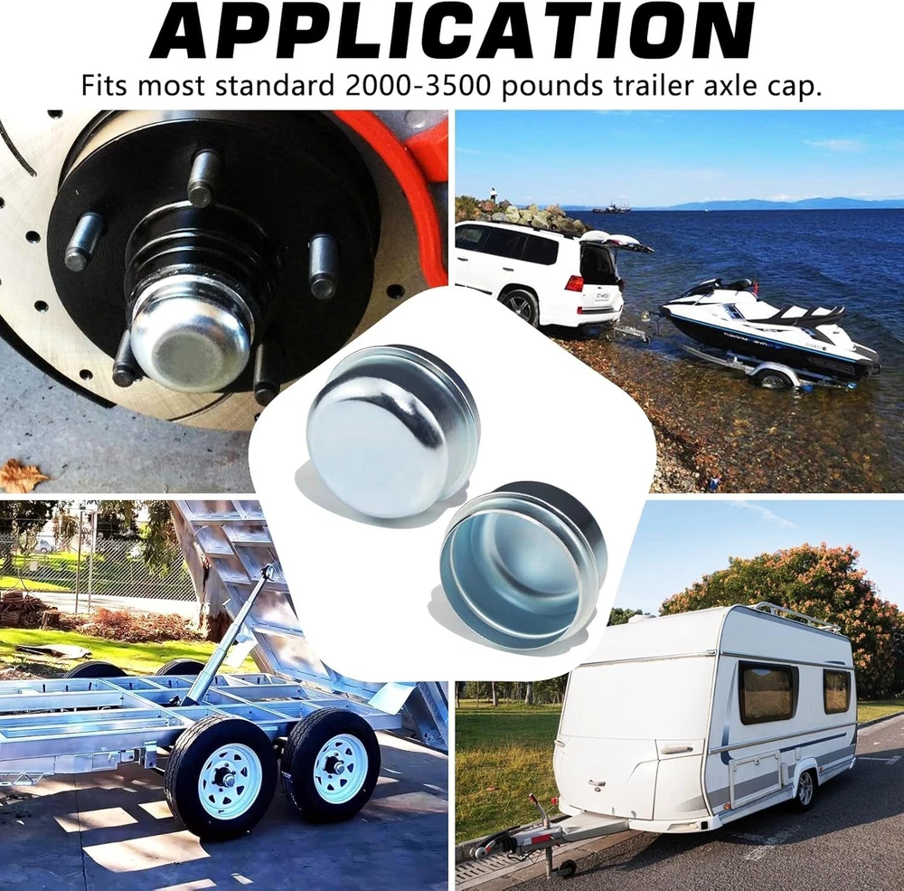 2 Pack Grease Cover Dust Cap Wheel Center Caps for Trailer Axle Hub Boat Camper Color:1.98'' Caps 2pcs The trailer axle cap is designed to avoid the trailer axle from dust, preserve the grease, protect bearings, and as decoration. Easy to install and maintain. Quantity: 2Pcs dust caps. OD: 1.98 inch/50.4mm. Please check the size information and compatibility carefully before placing an order. These trailers dust caps are made of high quality carbon steel, strong and durable, not easy to deform. Surface zinc-plated, looks very nice, anti-corrosion & anti-rust, long-term service for your trailer. Fits dexter and most standard 2000 -3500 pounds trailer wheel hub. Fits standard brake & idler trailer axles for most 4 lug & 5 lug axles with 1.98 inch diameter cap. For whatever reason, if you are not satisfied, you can contact us for replacement or refund. Please rest assured purchase. In order to install firmly, the axle dust cap is slightly larger by design. You need to knock it into place using a wood block and hammer or rubber mallet, to prevent denting the cap while installing. Return Policy: We offer a 30 day return policy from the receiving date. Please contact us for a Free Return Label. Please use our return label so it will go back to our supplier and we can do a refund or replacement afterwards. Feedback: Your satisfaction is very important to us! If you have any problem with your order, please contact us and we will do our very best to make you satisfied. As long as you are happy with your purchase, please leave a positive feedback for us. We will always leave you a positive feedback in return. If you have any problem with your purchase, please do not leave a negative feedback. Please Contact us ... and your issue will be solved quickly and positively We are a small family-owned business trying to make a living, not a huge company that does not care ... We will ALWAYS do our best for you!