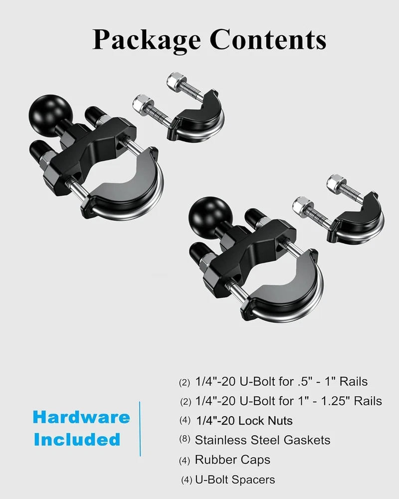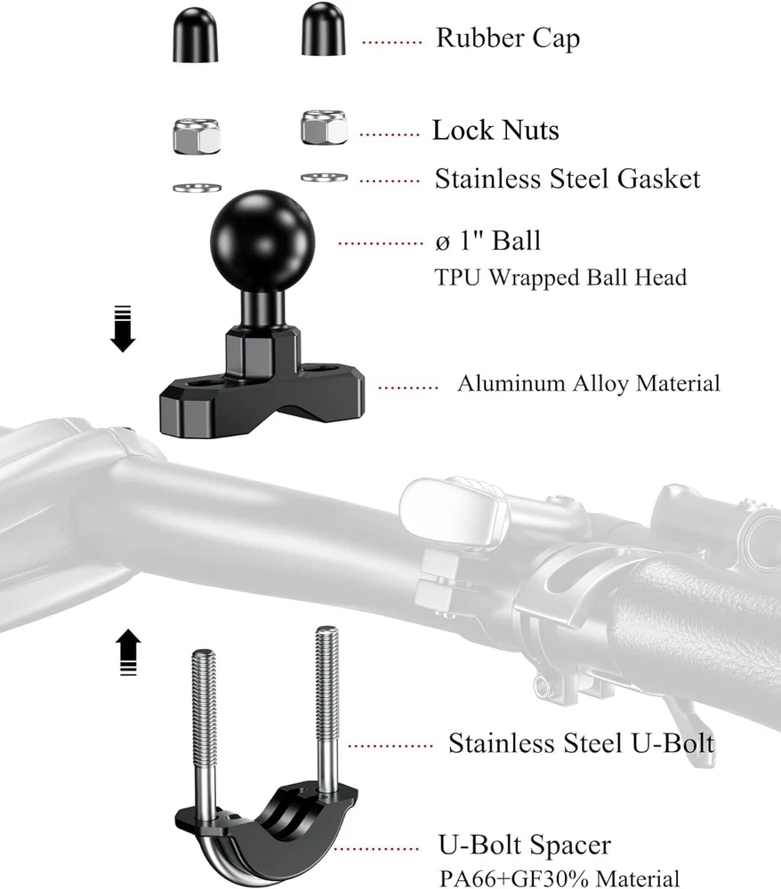 Store New Arrivals Add to Favorite View Feedback Contact 2 Pack, Handlebar U-Bolt Mount Base with 1'' TPU Ball for Rails 0.5'' to 1.25'' in Diameter, Compatible with RAM Mounts B Size 1 Inch Ball Double Socket Arm & Bike Motorcycle Phone Holder Description Mounting Type Handlebar, rear-view mirror, round rail Color Black Material Type Aluminum alloy ball base, Stainless steel U-Bolt, TPU over-molding ball head Water Resistance Level Waterproof Compatible Devices RAM Mounts B size 1 inch ball double socket arm Model Number R21-2St Compatible with Vehicle Type Motorcycle Model Name R21 Additional Features with 1 inch ball joint Compatible Phone Models Compatible with RAM Mounts B Size 1 inch Ball Double Socket Arm This handlebar U-bolt mount with 1 inch ball. The 1" ball joint is attached to the aluminum alloy base. TPU over-molded ball head, non-slip and wear-resistant. This 1" ball handlebar mount is secured to the handlebar with a high quality stainless steel U-Bolt. Durable and reliable in the most demanding environments Compatible with RAM & BRCOVAN any B size 1 inch ball double socket arm. Suitable for mounting to round, square and profiled rails and rear-view mirror bars with outside diameters from 0.5'' to 1.25'' Hardware Included: (2) 1/4"-20 U-Bolt for 0.5" - 1" Rails, (2) 1/4"-20 U-Bolt for 1" - 1.25" Rails, (4) 1/4"-20 Lock Nuts, (4) Rubber Caps, (4) U-Bolt Spacers, (8) Stainless Steel Spacers Product Description This 1" ball handlebar mount fits rails from 0.5'' to 1.25'' in diameter. Compatible with RAM MOUNTS & BCOVAN B size double socket arm. Set of two Hardware Included: (2) 1/4"-20 U-Bolt for 0.5" - 1" Rails, (2) 1/4"-20 U-Bolt for 1" - 1.25" Rails, (4) 1/4"-20 lock Nuts, (4) Rubber Caps, (4) U-Bolt Spacers, (8) Stainless Steel Spacers. ABOUT US We offer the best prices around on high quality products. Our E-store includes media such as books, movies, music and games while offering electronics, toys, sporting apparel, clothing, tools, general home, garden items and more. SHIPPING We are always working hard to ensure your package arrives as soon as possible. Please understand that some factors like weather, high postal traffic, and the performance of shipping companies are outside of our control. We offer free shipping to the lower 48 states and ship within 2 business days of payment, usually sooner. We do not accept P.O. Boxes. Please provide a physical address. For shipping outside of the continental USA, we only use eBay's Global Shipping Program.The item is shipped to KY and then sent to the rest of the world. International customers are responsible for all duties and taxes. Continue to check out in order to calculate costs for shipping the item to your country. Messages regarding eBay's Global Shipping Program MUST be directed at eBay EXCLUSIVELY. RETURNS We offer a 30-Day Return Policy on items which you are not completely satisfied with. You have the option for a full-refund or an exchange of the item. No returns are available on items shipped outside of the USA. PAYMENT We accept PayPal. CONTACT US This page content is yet to come Please ad us to your favorite seller and visit again later Thank You CUSTOMER SATISFACTION We try our very best to make sure every customer is completely satisfied. If there's a problem, message us! We're happy to help. WE ACCEPT Copyright © 2021 AutoDS. | All Rights Reserved