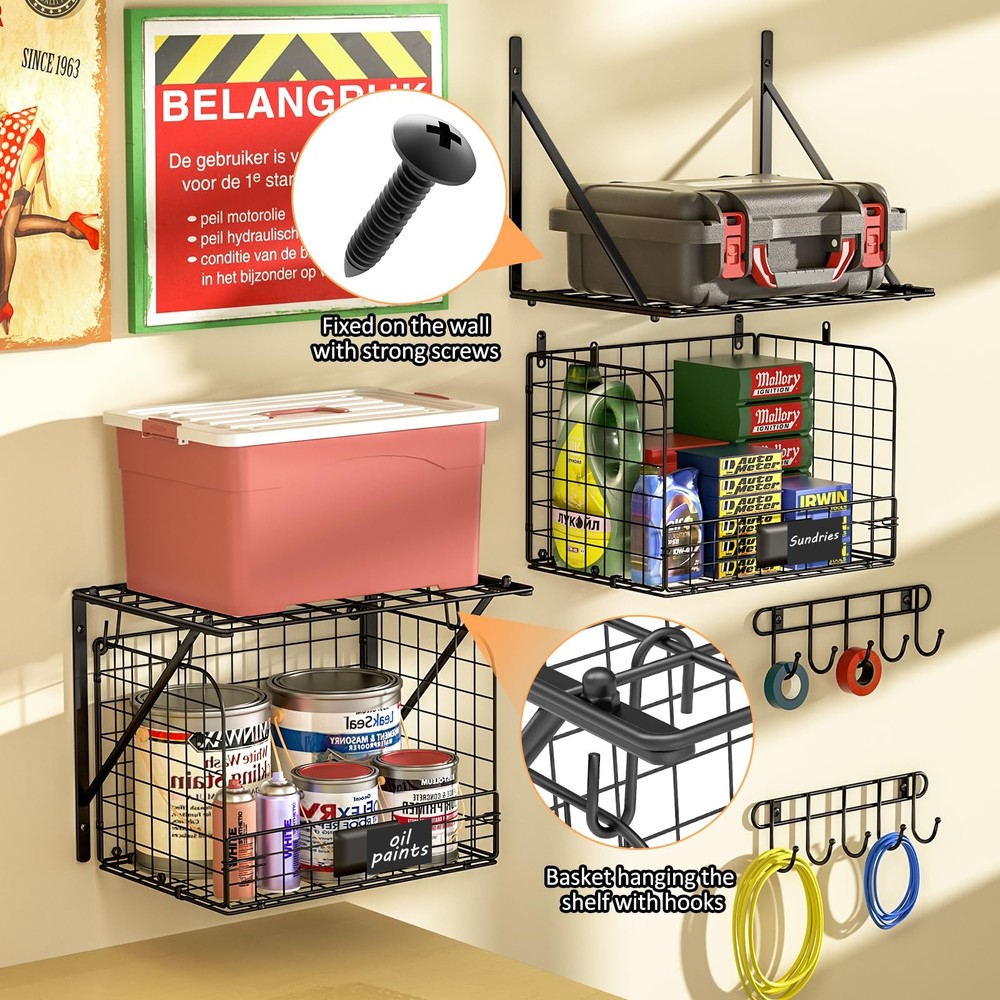 DIY INSTALLATION: Our heavy-duty garage shelving can be easily installed in various configurations to suit your specific space requirements, providing you with versatile storage solutions. You have the flexibility to choose whether the baskets are interlocked or separate, and whether they hang on the shelf or mounted on a wall. Whether you need storage in your garage, workshop, yard, or garden, our DIY installation offers the ideal solution to meet your needs. LARGE STORAGE CAPACITY: The package includes 2 shelves, 2 wire baskets, 2 hook racks, and 4 hooks. This unique storage combination has a large enough capacity to store a lot of garage supplies. Making full use of this shelving capacity to make your home look cleaner and tidier. VERSATILE GARAGE TOOL ORGANIZER: This organizer is designed to hold many of tools, including various garden tools, yard tools, garage tools, and even cleaning supplies like shovels, brooms, and string trimmers, among others. If you don't want to make more holes on the wall, you can use hooks to hang the baskets on the shelf. Our hooks are sturdy enough to withstand the weight of both the basket and its contents. STRONG LOAD CAPACITY: These heavy duty garage shelving are constructed from durable metal material, featuring a stable structure that resists shaking and a rust-resistant coating on the surface. Moreover, the shelf are securely mounted on the wall using robust screws, providing stable support and the capability to accommodate a substantial number of items. EASY TO ASSEMBLE:This garage storage shelves come with clear and detailed instructions and necessary parts, you will never get stuck with the assembly jobs for this wire wall shelf. Once completed, you can organize all your garage heavy duty items,then making your room tidier and cleaner.