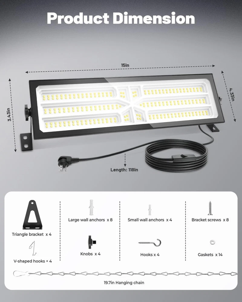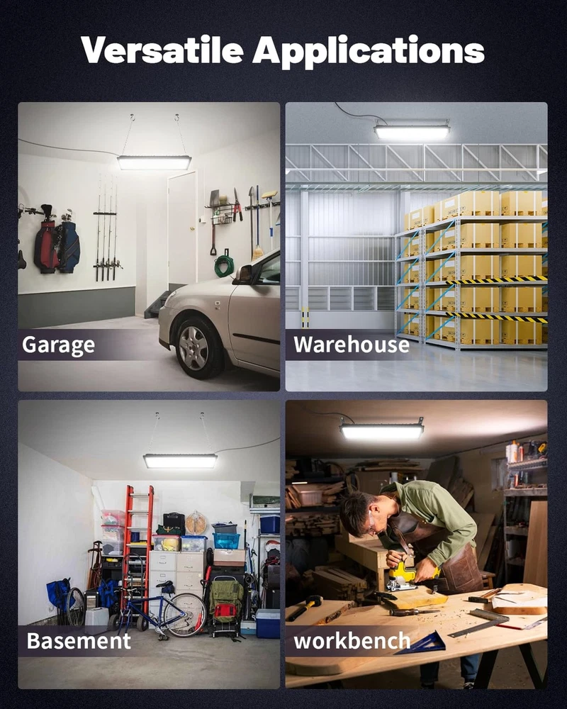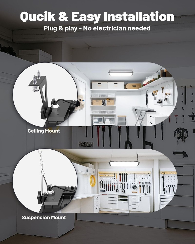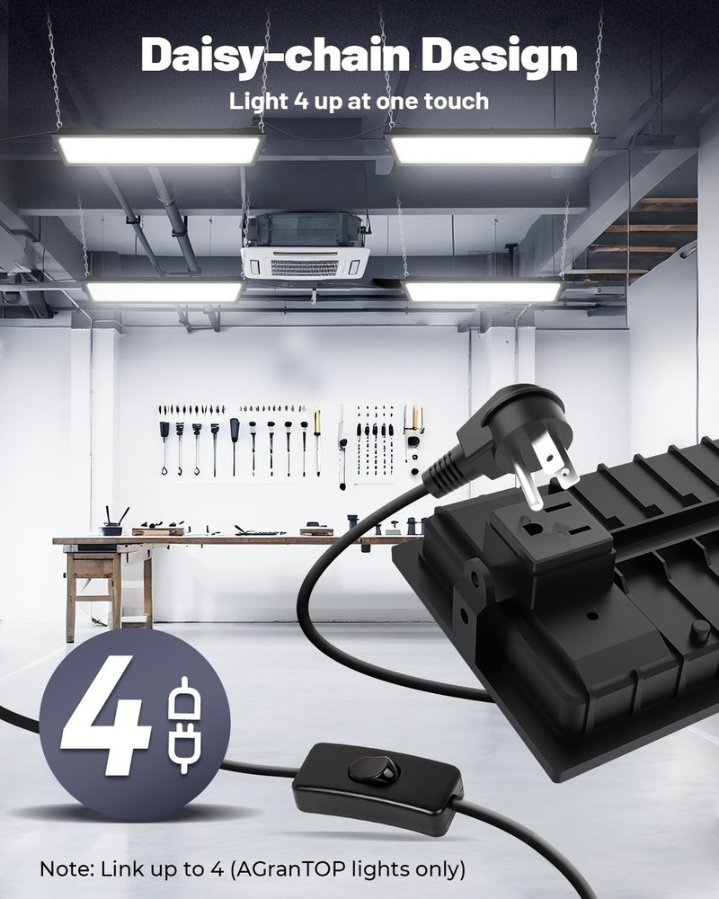 2 Pack Linkable LED Shop Light (Built-in Outlet) - 100W 15000LM Aluminum Plug in Garage Light w/ 9.84ft Power Cord and On/Off Switch, 6000K Shop Lights for Garage, Workshop Product Details Number of Items: 2 Brand: AGranTOP MPN: AGSLUS02 UPC: Does not apply EAN: Does not apply Brand: AGranTOP Color: Black Material: Aluminum, Tempered Glass Style: Modern Light fixture form: Floodlight Brand: ‎AGranTOP Color: ‎Black Material: ‎Aluminum, Tempered Glass Style: ‎Modern Light fixture form: ‎Floodlight Room Type: ‎Basement, Garage, Storage Room, Warehouse, Workshop Product Dimensions: ‎15"L x 4.3"W x 3.4"H Specific Uses For Product: ‎Garage, Patio, Shop, Warehouse, Workshop Indoor/Outdoor Usage: ‎Indoor Power Source: ‎Corded Electric Installation Type: ‎Flush Mount Special Feature: ‎Adjustable Height, Anti-Rust, Energy Efficient, Play in and Play Control Method: ‎Push Button Light Source Type: ‎LED Finish Type: ‎Painted Shade Material: ‎Aluminum Number of Light Sources: ‎222 Voltage: ‎120 Volts Theme: ‎Fantasy, Space, Sport Light Color: ‎White Shape: ‎Rectangular Included Components: ‎Bulb, Instruction Manual, LED Lens, LED Reflector, Mounting Hardware Warranty Type: ‎Limited Lighting Method: ‎LED Item Weight: ‎1.9 Kilograms Number of Items: ‎2 Wattage: ‎100 watts Controller Type: ‎Push Button Switch Type: ‎Push Button Unit Count: ‎2.0 Count Water Resistance Level: ‎Not Water Resistant Brightness: ‎15000 Lumen Efficiency: ‎High Efficiency Mounting Type: ‎Ceiling Mount Shade Color: ‎Black Fixture Type: ‎Non Removable Assembly Required: ‎No Manufacturer: ‎AGranTOP Color Temperature: ‎6000 Kelvin Size: ‎2 Pack Light Output Maximum: ‎15000 Lumens Recommended Uses For Product: ‎Commercial, Industrial Model Name: ‎Shop Light Set Name: ‎2 Pack Part Number: ‎AGSLUS02 Item Weight: ‎4.18 pounds Item model number: ‎AGSLUS02 Finish types: ‎Painted Special Features: ‎Adjustable Height, Anti-Rust, Energy Efficient, Play in and Play Batteries Required?: ‎No Date First Available: August 8, 2024 ULTRA BRIGHT AND ENERGY EFFICIENT: The LED shop light utilizes 222 pcs upgraded energy-saving chips, delivering a total output of 100W with 15000LM and a 6000K daylight color temperature. It provides exceptional indoor lighting while significantly reducing energy consumption, saving over 80% on electricity LINKABLE DESIGN & ON/OFF SWITCH: Each plug in shop light features its own socket, allowing you to easily link up to four lights (AGranTOP lights only,not applicable to other electrical appliances) together for brighter and wider illumination. Plus you can control them with a convenient in-line switch EASY INSTALLATION: The light comes with a 180 adjustable bracket for effortless installation on ceilings, walls, floors, and more. Also, you can hang it from the included hanging chain. With a plug-and-play design and an extra-long 9.84 ft power cord, there's no need for complex wiring or professional electricians BUILT TO LAST: Constructed with a die-cast aluminum housing and high-strength glass, this plug in garage light is built to withstand tough environments. The aluminum heat sink promotes efficient heat dissipation, extending the lights lifespan to an impressive 50,000 hours, providing long-lasting, reliable performance WIDER COVERAGE: Equipped with a premium reflective film and a wide 120 beam angle, this LED light bar ensures no dark spots, ghosting, or glare, effectively illuminating your entire space. Measuring 15 inches in length and 4.3 inches in width, it offers broader coverage compared to standard floodlights VERSATILE APPLICATIONS: This light is perfect for a wide range of settings, including garages, workshops, workbenches, attics, sheds, storage rooms, equipment rooms, tool rooms, basements, utility rooms, laundry rooms, parking lots, and residences. It can also serve as a work light