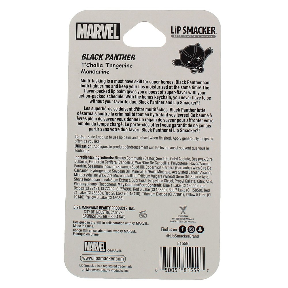 Product Description Multi-tasking is a must have skill for super heroes. Black Panther can both fight crime and keep your lips moisturized at the same time! The flavor-packed lip balm gives you a boost of super-flavor with your action-packed schedule. With the bonus keychain, you never have to be without your favorite duo, Black Panther and Lip Smacker! Marvel Super Hero packaging Character inspired flavor Convenient keychain Moisturizing, smoothing, soft shine! Ingredients Ingredients: Ricinus Communis (Castor) Seed Oil, Cetyl Acetate, Beeswax/Cire D'Abeille, Euphorbia Cerifera (Candelilla) Wax/Cire De Candelilla, Flavor/Aroma, Polybutene, Paraffin, Sesamum Indicum (Sesame) Seed Oil, Copernicia Cerifera (Carnauba) Wax/Cire De Carnauba, Hydrogenated Soybean Oil, Mineral Oil/Huile Minérale, Acetylated Lanolin Alcohol, Microcrystalline Wax/Cire Microcristalline, Triticum Vulgare (Wheat) Germ Oil, Stearic Acid, Sucralose, Propylene Glycol, Propyl Gallate, Citric Acid, Phenoxyethanol, Tocopherol, May Contain/Peut Contenir: Red 6 (Ci 15850), Yellow 5 Lake (Ci 19140). Instructions Slide knob up to use lips balm and retract when finished. Apply generously to lips as often as you like. Product Description Multi-tasking is a must have skill for super heroes. Black Panther can both fight crime and keep your lips moisturized at the same time! The flavor-packed lip balm gives you a boost of super-flavor with your action-packed schedule. With the bonus keychain, you never have to be without your favorite duo, Black Panther and Lip Smacker! Marvel Super Hero packaging Character inspired flavor Convenient keychain Moisturizing, smoothing, soft shine! Ingredients Ingredients: Ricinus Communis (Castor) Seed Oil, Cetyl Acetate, Beeswax/Cire D'Abeille, Euphorbia Cerifera (Candelilla) Wax/Cire De Candelilla, Flavor/Aroma, Polybutene, Paraffin, Sesamum Indicum (Sesame) Seed Oil, Copernicia Cerifera (Carnauba) Wax/Cire De Carnauba, Hydrogenated Soybean Oil, Mineral Oil/Huile Min√©rale, Acetylated Lanolin Alcohol, Microcrystalline Wax/Cire Microcristalline, Triticum Vulgare (Wheat) Germ Oil, Stearic Acid, Sucralose, Propylene Glycol, Propyl Gallate, Citric Acid, Phenoxyethanol, Tocopherol, May Contain/Peut Contenir: Red 6 (Ci 15850), Yellow 5 Lake (Ci 19140). Instructions Slide knob up to use lips balm and retract when finished. Apply generously to lips as often as you like. Suggested Use To Use: Apply to lips as often as you like. Recommended for ages 6 and up. Disclaimer The product descriptions and instructions provided by vitabox.com are for informational purposes only and are qualified in their entirety by the information available from manufacturers of the products. You should carefully read all product packaging, and contact the manufacturer with any questions before using a product. While we endeavor to ensure that product descriptions are current, manufacturers sometimes change their products. We are not liable for inaccuracies or misstatements about products. We do not provide medical advice or recommendations. You should not use the information provided by vitabox.com for diagnosing or treating a health problem or disease. If you have or suspect that you have a medical problem, immediately contact your health care provider. Information and statements regarding dietary supplements have not been evaluated by the Food and Drug Administration or any other government agency and are not intended to diagnose, treat, cure, or prevent any disease.