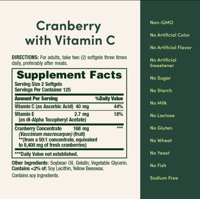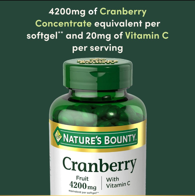 2 Pack - Nature's Bounty Cranberry Plus Vitamin C Softgels 4200mg, 250 CT Cranberries help support the integrity of bladder walls to promote urinary health in both men and women. This product also contains vitamin C that plays a role in supporting immune function. Made from the finest cranberry concentrate available. Supports urinary tract health: Cranberries contain compounds that can help prevent bacteria from sticking to the walls of the urinary tract, which can help reduce the risk of urinary tract infections (UTIs). Provides vitamin C: Vitamin C is an antioxidant that helps the body fight off infection. It is also important for the production of collagen, which is a protein that helps keep the skin, bones, and gums healthy. Easy to swallow: The softgels are small and easy to swallow, making them a convenient way to get your daily dose of cranberry and vitamin C. Gluten-free: The product is gluten-free, so you can be sure that it is made with high-quality ingredients. Non-GMO: The product is non-GMO, so you can be sure that it is made with high-quality ingredients. Made in the USA: The product is made in the USA, so you can be sure that it meets the highest quality standard. Ingredients: Other Ingredients: Gelatin, Soybean Oil, Vegetable Glycerin. Contains 2% of: Soy Lecithin, Yellow Beeswax. Contains Soy Ingredients. Directions: For adults, take two (2) softgels three times daily, preferably after meals. Warnings: If you are pregnant, nursing, taking any medications, planning any medical or surgical procedure or have any medical condition, consult your doctor before use. Discontinue use and consult your doctor if any adverse reactions occur. Keep out of reach of children. Store at room temperature. Do not use if seal under cap is broken or missing.