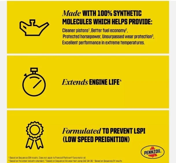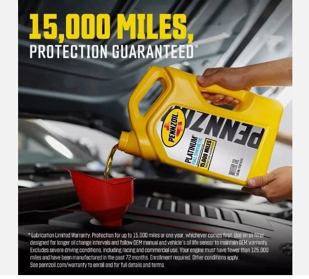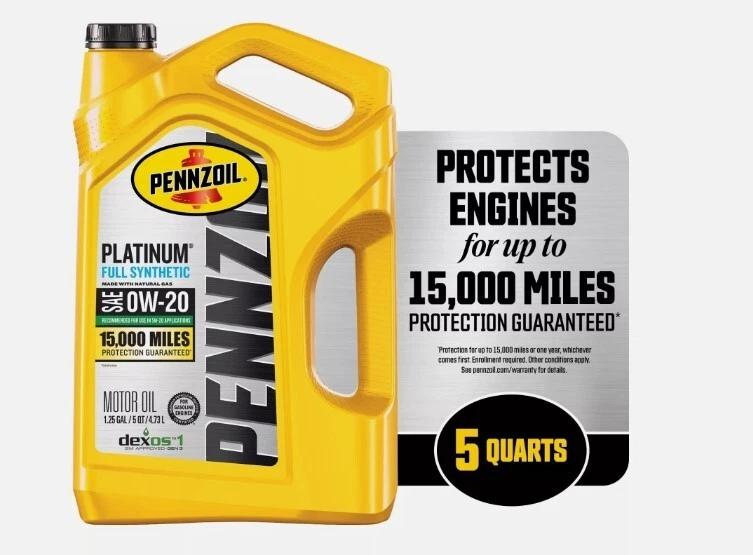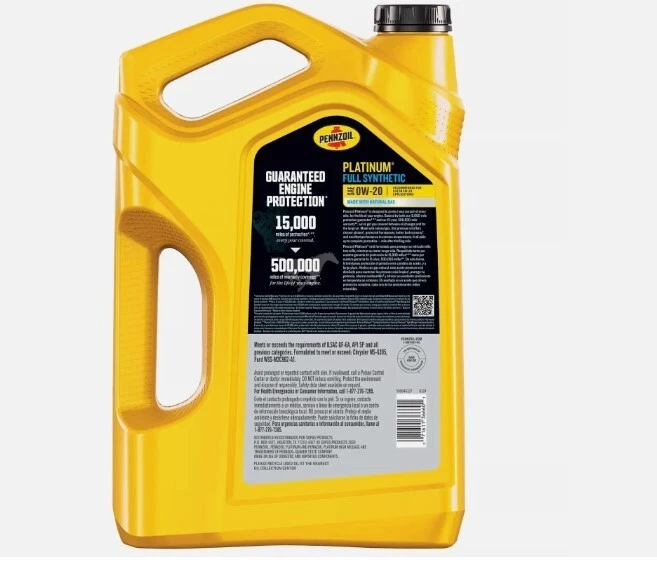2 Pack Pennzoil Platinum Full Synthetic 0W-20 Motor Oil, 5-Quart, Free N Fast Shipping USA Product details Pennzoil Platinum Full Synthetic 0W-20 is designed to maximize engine protection and is backed by a 15,000-mile protection guarantee* to protect your pursuit of every mile. Made with natural gas, it is formulated for complete protection for top engine performance. Pennzoil Platinum offers cleaner pistons (based on Sequence IIIH results; does not apply to SAE 0W-16 or Pennzoil Platinum Euro motor oil), helps protect engines from loss of power, delivers better fuel economy (based on the latest industry standard), provides unsurpassed wear protection (based on Sequence IVA wear test using SAE 5W-30), and provides excellent performance in extreme temperatures. Pennzoil Platinum Full Synthetic 0W-20 provides the same engine protection as a 5W-20 and is suitable for use in vehicles currently using SAE 5W-20. (*Pennzoil Platinum Lubrication Limited Warranty: Protection for up to 15,000 miles or one year, whichever comes first. Use an oil filter designed for longer oil change intervals and follow OEM manual and vehicle’s oil life sensor to maintain OEM warranty. Excludes severe driving conditions, including racing and commercial use. Your engine must have fewer than 125,000 miles and have been manufactured in the past 72 months. Enrollment required. Other conditions apply. See pennzoil.com/warranty to enroll and for full details and terms.) Full synthetic 0W-20 motor oil that is made with natural gas and designed to maximize engine protection Backed by a 15,000-mile protection guarantee* to protect your pursuit of every mile Provides better fuel economy (based on the latest industry standards) Keeps pistons cleaner than the toughest industry standard (based on Sequence IIIH results) Provides unsurpassed wear protection (based on Sequence IVA wear test using SAE 5W-30) Formulated to provide faster low-temperature oil flow and protection in extreme heat Helps protect engines from loss of power Meets or exceeds the following OEM requirements: Chrysler MS-6395; GM dexos1 Gen. 3; Ford WSS-M2C9262-A Meets or exceeds the requirements of the following industry specifications: API SP, API SP-Resource Conserving, and all previous categories; ILSAC GF-6A For a full list of equipment approvals and recommendations, please consult your local Shell Technical Help Desk and always consult your owner’s manual Specifications Features Enhanced Wear Protection, Protects In Extreme Heat, Extended Engine Life, Protect Critical Engine Parts, Synthetic Technology Brand Pennzoil Motor Oil Viscosity 0W - 20 Motor Oil Type Full Synthetic Motor Oils Number of Engine Cycles 4 Cycle Manufacturer Part Number 550046127 Model 550046127 Manufacturer PENNZOIL QUAKER STATE COMPANY Assembled Product Dimensions (L x W x H) 8.20 x 4.50 x 12.66 Inches Warranty information *Pennzoil Platinum Lubrication Limited Warranty: Protection for up to 15,000 miles or one year, whichever comes first. Use an oil filter designed for longer oil change intervals and follow OEM manual and vehicle’s oil life sensor to maintain OEM warranty. Excludes severe driving conditions, including racing and commercial use. Your engine must have fewer than 125,000 miles and have been manufactured in the past 72 months. Enrollment required. Other conditions apply. See pennzoil.com/warranty to enroll and for full details and terms. Please be aware that the warranty terms on items offered for sale by third party Marketplace sellers may differ from those displayed in this section (if any). To confirm warranty terms on an item offered for sale by a third party Marketplace seller, please use the 'Contact seller' feature on the third party Marketplace seller's information page and request the item's warranty terms prior to purchase.
