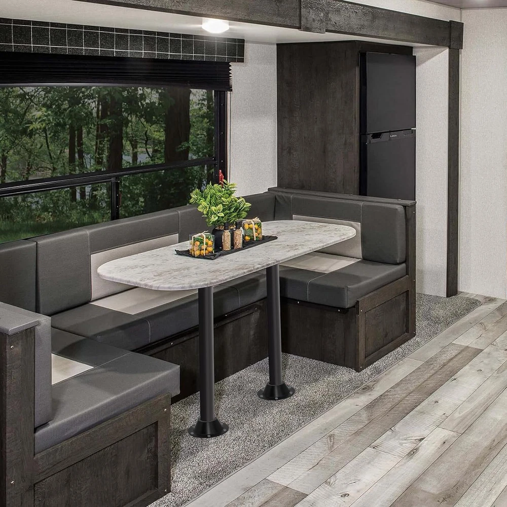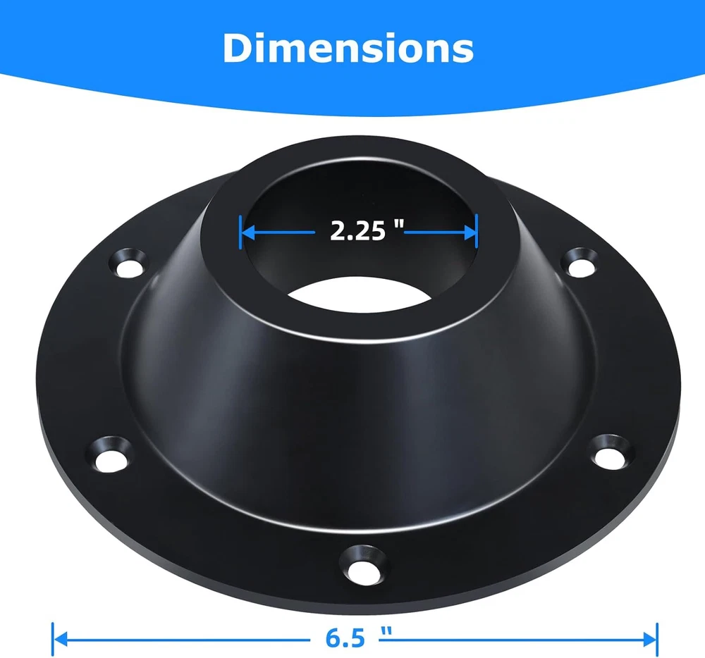 Standard RV Table Base: 6.5 inches outer diameter and 2.25 inches inner diameter, the 2 piece RV table base mount is specially designed for both ends of the table pole. Fit for most standard RV tables with pedestal or centered bases. Rust and Corrosion-Resistant: The RV table base mount is made of durable chrome-plated aluminum, featuring corrosion-resistant and scratch-resistant. Polished surface leave the floor underneath intact. Stable Mount: Camper table base mount comes with 6 screws to holds the leg securely, provide more stability and stronger support for your RV dinette table. Easy to Install: Include 2 pack camper table leg base, a pack of screws. The short screws for mounting to the table while the long screws for mounting to the floor. Complete RV Table Bases: Our RV pedestal table base flanges includes aluminum RV table base mount x 2, long Screws x 8, short screws x 8. All the RV table bracket accessories are included to satisfy your straight installation. Product Description JYINCPED RV/Camper Table Base Mount Bracket with 6 Mounting Holes, No More Wobbly Table in Your Camper JYINCPED RV pedestal table leg base flange is designed with 6 pre-drilled mounting holes to holds the leg securely for extra strength and security to hold the table up. Compatibility RV table and floor mounting base for pedestal or centered base table. Universal fit for RV, travel trailer, and camper dinette table Specification Outer diameter: 6.5" Inner diameter: 2.25" Package Include 2 x RV Table Base 8 x Long Screws 8 x Short Screws