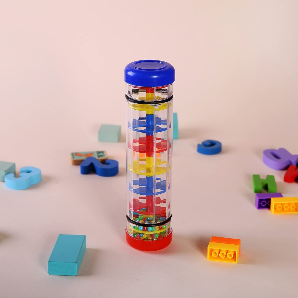Turn this rainmaker over and stimulate senses with vibrant trickling beads and soothing raindrop sounds. Great musical sensory development toy for babies, toddlers and kids. Package includes 2 pack rain sticks, 8 inch long Mfg Recommended age: 3 year and up Soothing and captivating raindrop sound Colorful enchanting sight Fun and entertaining for your baby Early education for learning and discovering colors, sounds and movements Package includes 2 pack rain sticks