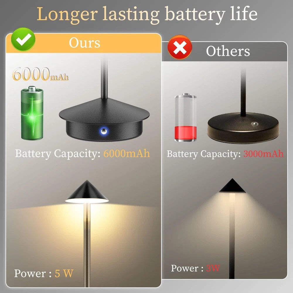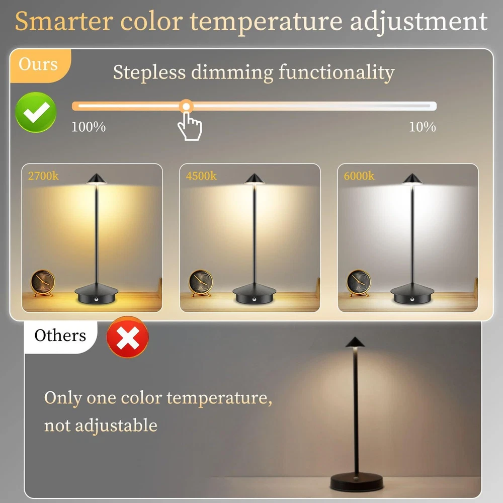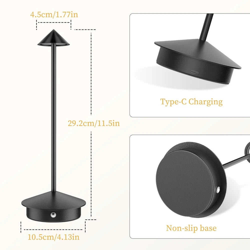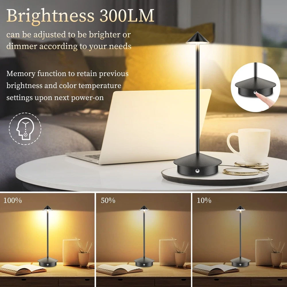 Wireless Bedside Companion: Say goodbye to tangled cords. This bedside lamp offers hassle-free, well-lit reading experiences. Whether you're reading a book or working on important documents, this lamp provides the perfect lighting companion Rechargeable Desk Lamp Material: Aluminum Metal; Power: 5W; Luminous Flux: 300 lumens; Connect to any USB port for versatile use. Say goodbye to traditional wiring limitations and enjoy the flexibility of this lamp in various scenarios.Switch between warm, natural, and white light with a simple press. Long-press to adjust brightness, creating a comfortable and cozy ambiance. This lamp is not just functional but also a beautiful piece of art Battery-Powered Convenience: Built-in 6000mAh rechargeable battery ensures 11-36 hours of continuous illumination, depending on the brightness level. Perfect for camping and Bedrooms, study rooms, offices, living rooms, dining rooms, coffee shops, hotel rooms, and even outdoor spaces. Enjoy cordless lighting anywhere you need it High-Quality Construction: Crafted from durable metal aluminum alloy with a non-slip silicone bottom and IP54 rating to protect against accidental splashes. This lamp is designed to last and withstand daily use Lamp : Package includes 2 Lamp, 2 USB-C Charging Cable, and 1 User Manual