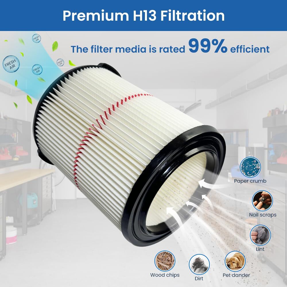 【Fit for】Perfect replacement cmxzvbe38754 filter for craftsman shop vac .The filter fits for CRAFTSMAN shop Wet/Dry 5 gallon to 20 gallon vacs made 1988 and after 【Easy to Install】 Filter Fastening System allows quick and easy wet dry vacuum filter changes ,no tools required. 【Premium Material】Single One layer pleated paper filter construction,the filter media is rated 99% efficient.Filter material can be washed and reused for better filtering of debris. 【Multiple Usage】The CMXZVBE38754 filter for Craftsman wet dry vac is widely used for removing dust and debris from basements, garages, workshops, or cars. 【Warm Tips】Please replace these filters once every 3-6 months; Depending on use and air quality, frequent filter changes may be necessary.