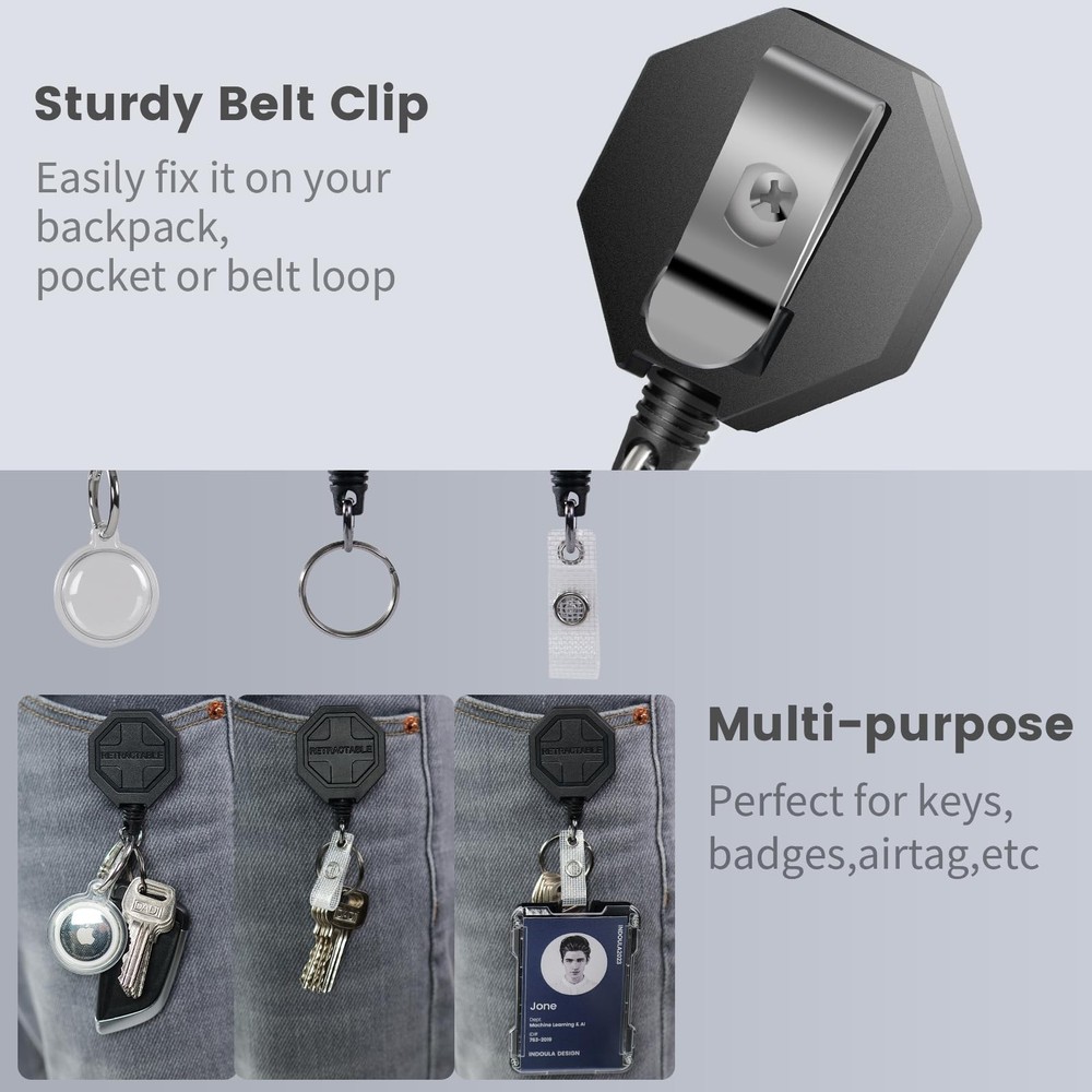 2 pcs Retractable keychain with 2 pcs black airtag holder/case 【Secure & Durable Combo】:retractable keychain and Airtag holder combo offers detachable design - use them together or separately! The steel cord and metal clip securely hold keys, badges without slipping. 【8 oz Retraction】:Engineered with a reinforced spring mechanism, this heavy duty badge reel supports most items (8oz/227g) like badges and most keys. The anti-slip cord stays taut even with frequent pulls. 【31.5" Extended Cord】:With a 31.5" steel cord, easily access doors, lockers, or scanners without removing your keys. The smooth retraction system prevents tangling, ideal for backpacks, belts or lanyards. 【Multi-Use & Versatile】:Attach the Airtag holder to valuables (bags, wallets) for anti-loss tracking, or clip the retractable keychain to belts/backpacks. Both units feature a swivel hook for 360° rotation - adapts to any angle! 【Trusted by Professionals】:2 pack set includes everything for work or travel: 2 retractable keychains + 2 Airtag cases. airTag retractable keychains backed by a 12-month - trusted by hospital staff, teachers, Office workers and outdoor enthusiasts.