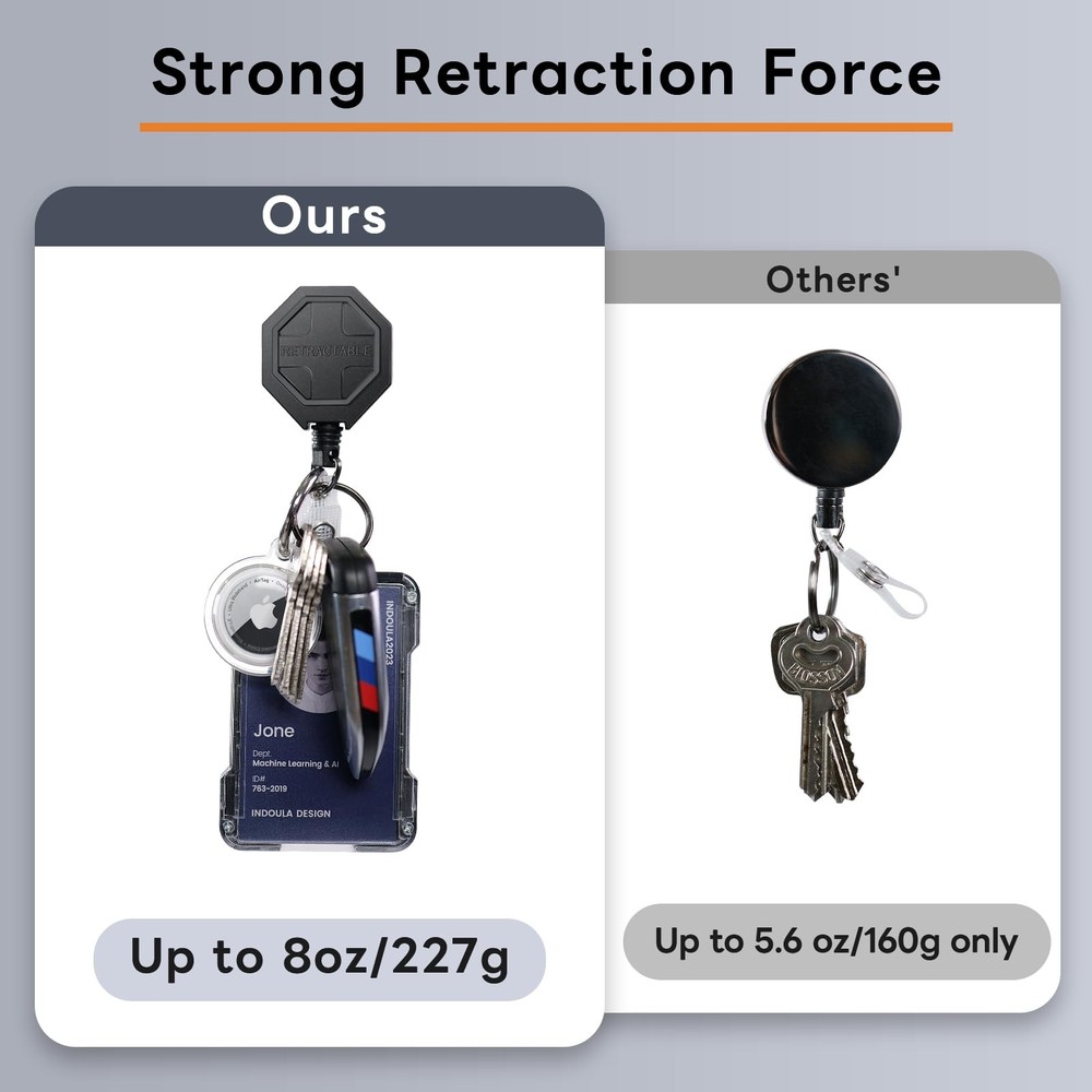 This retractable keychain combo is a game-changer! The heavy-duty steel cord and clip keep my keys secure while the smooth retraction works flawlessly. Love the detachable AirTag holder—perfect for tracking essentials. The extended reach is super handy, and the build feels solid after weeks of use. No more fumbling for keys—it’s sturdy, functional, and totally worth it!