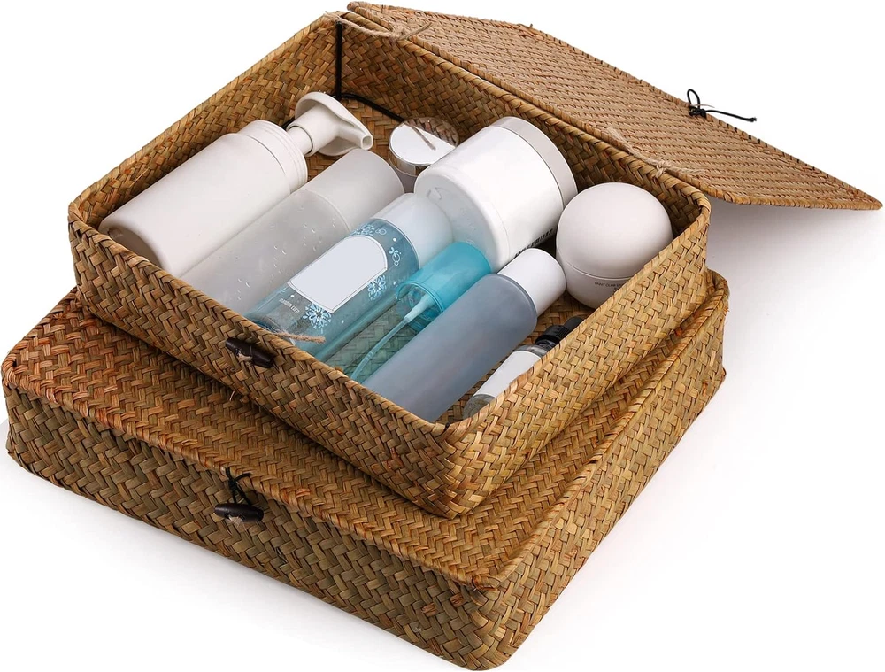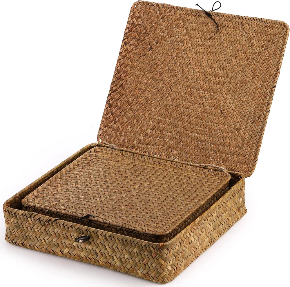 Store New Arrivals Add to Favorite View Feedback Contact 2 Pack Seagrass Baskets with Lid, Wicker Storage Baskets Flat Rattan Storage Bins, Woven Organizer Baskets for Shelf, Closet, Bedroom Description Item model number Seagrass Basket Style Rustic Country of Origin China With Lid Yes Number of Pieces 2 Room Type All Finish Natural Product Dimensions 3"D x 11"W x 3"H Material Sea Grass Handle Material Seagrass Finish Type Natural Closure Type Buckle Batteries Required? No Item Weight 1.28 pounds Special Features Lid, Stackable Special Feature Lid, Stackable Part Number Seagrass Basket Color Natural Shape Rectangular Batteries Included? No Recommended Uses For Product Storage Elsjoy 2 pack seagrass storage baskets come in 2 sizes, Large 12.5"L x 11"W x 3"H, Small 11.5"L x 9.5"W x 2.5"H. Natural seaweed baskets eliminate clutter, also add a touch of elegance and natural scent to your home. ๐๐๐ญ๐ฎ๐ซ๐๐ฅ ๐๐๐๐ ๐ซ๐๐ฌ๐ฌ: Storage basket set is made from 100% natural seagrass, ensuring years of durability and sustainability. Each basket comes with a light grass fragrance and subtle color variations that make it unique. ๐๐จ๐ฅ๐ข๐ ๐๐จ๐ง๐ฌ๐ญ๐ซ๐ฎ๐๐ญ๐ข๐จ๐ง: Wicker basket has a flat rectangular shape which makes it easy to place in any corner or space around your home. It is supported by a metal frame for solid hold and durability. ๐๐๐ฌ๐ฒ ๐ญ๐จ ๐๐ฌ๐: Stackable, portable & lidded. Moves easily from one room to another. The smaller basket can be stacked inside or on top of the big one, or they can be used individually. The lid can be easily opened by untying the knot. ๐๐๐ซ๐ฌ๐๐ญ๐ข๐ฅ๐: Woven basket set is ideal for storing CDs, books, remote controls, snacks, and anything else in the living room. Suitable for keeping clothes, skin care products, magazines in the bedroom, toiletries, towels in the bathroom. ๐๐จ๐ญ๐: ๐๐๐ญ๐ฎ๐ซ๐๐ฅ ๐ฌ๐๐๐ ๐ซ๐๐ฌ๐ฌ ๐ฏ๐๐ซ๐ข๐๐ฌ ๐ข๐ง ๐๐จ๐ฅ๐จ๐ซ ๐ญ๐จ๐ง๐, ๐๐ซ๐จ๐ฆ ๐ฅ๐ข๐ ๐ก๐ญ ๐ญ๐จ ๐๐๐ซ๐ค, ๐ฌ๐จ ๐ญ๐ก๐ ๐๐๐ฌ๐ค๐๐ญ ๐ฆ๐๐ฒ ๐๐ฉ๐ฉ๐๐๐ซ ๐ฌ๐ฅ๐ข๐ ๐ก๐ญ๐ฅ๐ฒ ๐๐ข๐๐๐๐ซ๐๐ง๐ญ ๐๐ซ๐จ๐ฆ ๐ญ๐ก๐ ๐ฉ๐ข๐๐ญ๐ฎ๐ซ๐. Product Description Elsjoy Set of 2 Seagrass Woven Baskets They are handwoven by artisans and make the perfect rustic home decor piece. Woven storage bins are made from 100% seagrass. These woven seaweed baskets not only provide storage functionality, but also offer a natural scent. Seagrass baskets with lids are the perfect way to organize and keep your important items dust-free. You will enjoy the rustic elegance and warmth they bring to your home. Set of large and small baskets for organizing snacks, skin-care products, toys, books, clothes, toiletries, etc. You can easily stack them up and use them in a bedroom, living room, study room, bathroom, office, closets, and cabinets. Easy to Use Toggle Accented with a wood button on the toggle closure, which gives it a natural touch. Stackable Stack them on the counter, inside cabinets, and in closets to maximize storage space. Metal It is supported by a metal bracket inside that prevents it from deforming. Versatile Toiletries Clothes Small Items Get your home organized with seagrass baskets Seagrass baskets are made with fine craftsmanship for easy storage. The container is lightweight and convenient to use every day. Simple wiping down with a damp towel will keep them looking good. You don't have to worry about polluting the environment either, since they quickly biodegrade. ABOUT US We offer the best prices around on high quality products. Our E-store includes media such as books, movies, music and games while offering electronics, toys, sporting apparel, clothing, tools, general home, garden items and more. SHIPPING We are always working hard to ensure your package arrives as soon as possible. Please understand that some factors like weather, high postal traffic, and the performance of shipping companies are outside of our control. We offer free shipping to the lower 48 states and ship within 2 business days of payment, usually sooner. We do not accept P.O. Boxes. Please provide a physical address. For shipping outside of the continental USA, we only use eBay's Global Shipping Program.The item is shipped to KY and then sent to the rest of the world. International customers are responsible for all duties and taxes. Continue to check out in order to calculate costs for shipping the item to your country. Messages regarding eBay's Global Shipping Program MUST be directed at eBay EXCLUSIVELY. RETURNS We offer a 30-Day Return Policy on items which you are not completely satisfied with. You have the option for a full-refund or an exchange of the item. No returns are available on items shipped outside of the USA. PAYMENT We accept PayPal. CONTACT US This page content is yet to come Please ad us to your favorite seller and visit again later Thank You CUSTOMER SATISFACTION We try our very best to make sure every customer is completely satisfied. If there's a problem, message us! We're happy to help. WE ACCEPT Copyright ยฉ 2021 AutoDS. | All Rights Reserved