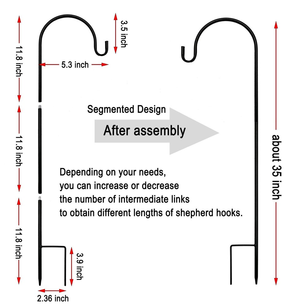 Inside curved hook make sure your follower planter or other light weight hangings does not slip or blow off the hook even in a strong wind. By hanging lanternsYou can create a fuss glow in no time, bring gorgeous lighting to your pathway in your garden or front door to light up the night as the guests head out. Just bring your heavy plant basket filled with your favorite follower to the shepherd hook makes your garden more attractive. The use of shepherd hooks with kiss follower ball or mason jar can soften up aisles and walkways for a wedding. MATERIAL: The double black heavy duty garden shepherds hook with a 35 inch tall, one piece wrought iron metal garden hanging hooks, much thicker than other garden shepherds’ hooks. WIDELY USED: Beautify your outdoor living space by hanging flower pots, solar lights, lanterns, flower baskets, garden lights, mason jars, string lights, wind chimes, ornaments, bird feeders, bird baths, planters. Great for outdoor wedding aisle and ideal for any garden decorations. PERFECT MATCH: With a traditional look and dark finish, the shepherd’s hook complements anything that you choose to hang on it. Blends seamlessly into its surroundings and goes great with most other colors. HEIGHT ADJUSTABLE:You only need to assemble the three sections of the shepherding hook by hand, depending on your needs, you can increase or decrease the number of intermediate links to obtain different lengths of shepherd hooks. EASY TO USE: Hooked garden stakes will last year after year as the smooth powder coating prevents rusting and the black color remains lovely. Place items directly in the ground and start enjoying them immediately. You can also disassemble it when you are not using it, saving your space.
