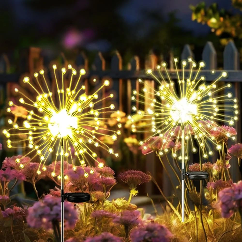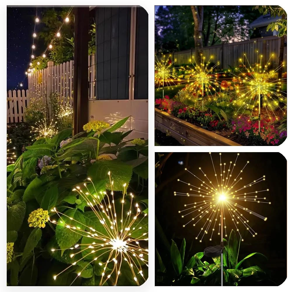 【Solar Firework Lights: 8 Modes, 150 LED Starburst】Each pack contains 2 lights with eight easily operated modes via a button. These solar-powered firework lights feature a dazzling starburst design with 150 energy-efficient LED lights, creating a captivating and radiant display. Decorate your playhouse, balcony, patio, or planters as you like. It is an ideal choice with high quality and durability. 【Effortless Installation & DIY Any Shape】 Simply stake the light into the ground and let the solar panel charge during the day for automatic illumination at night. Made of flexible copper wire and bright LED beads, these lights allow you to DIY any shape you desire. Whether it's a starburst, flower, heart, spiral, or spherical design, the possibilities are endless. These lights are perfect for gardening enthusiasts and make great decorations for various holidays such as Halloween, Christmas, Thanksgiving, and New Year's Day. 【Long Working Hours】Equipped with 150 durable low-heat LED lights and an upgraded solar panel (2V 250mAh), these lights feature a built-in 1.2V/600mAh high-capacity AA battery. They charge for 6-8 hours under standard sunlight during the day and provide 10-12 hours of illumination at night when fully charged. 【Waterproof Solar Lights Outdoor】 These lights are IP65 waterproof, making them suitable for outdoor use and able to withstand any bad weather. They are corrosion-resistant and highly transparent, featuring sturdy aluminum poles and premium waterproof capabilities to ensure they continue to charge normally even after exposure to wind and rain. 【Note】 When you receive the solar lights, please remove the insulation strip from the solar panel. Cover the solar panel with your hand to simulate darkness and check if the lights turn on. If the lights illuminate, place them in a sunny area without any shadows to absorb full direct sunlight. If the lights do not turn on, please reset the battery or allow at least 3 days and nights of charging and discharging for the battery to reach its full capacity. If you have any questions about the solar lights, please contact us and we will resolve the issue as soon as possible.