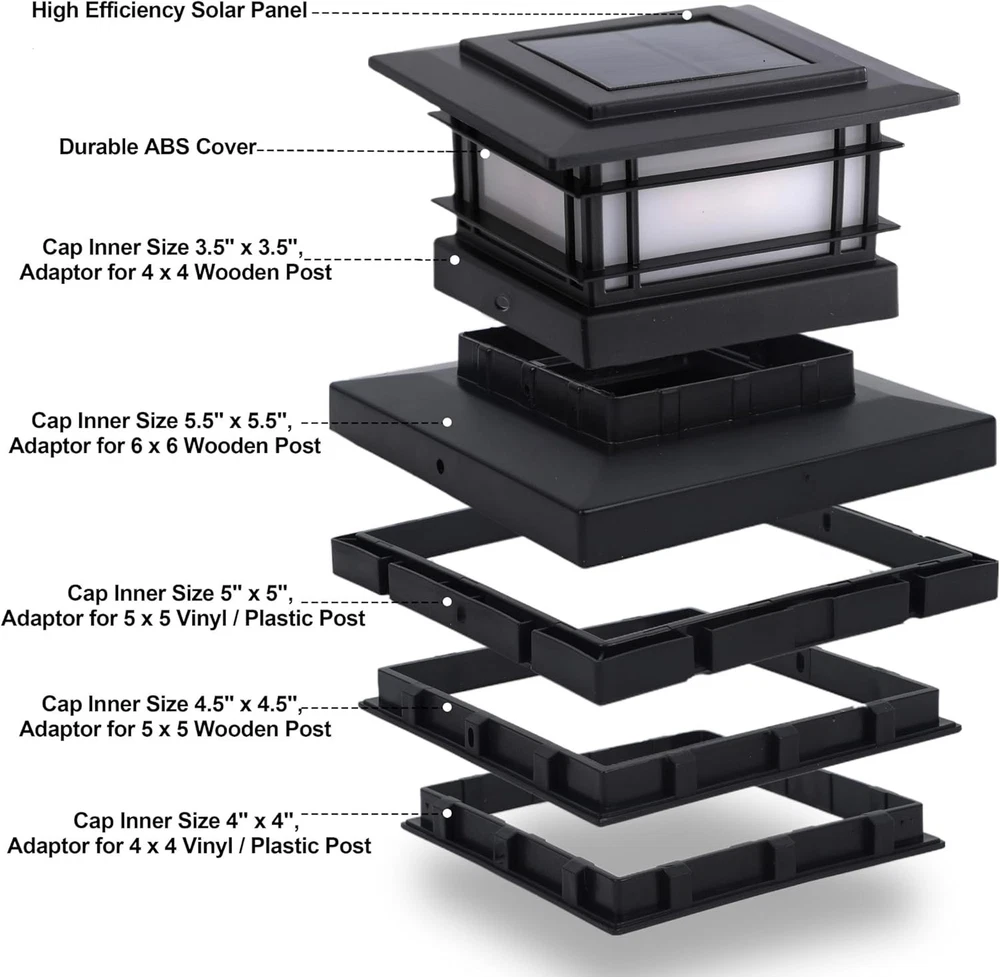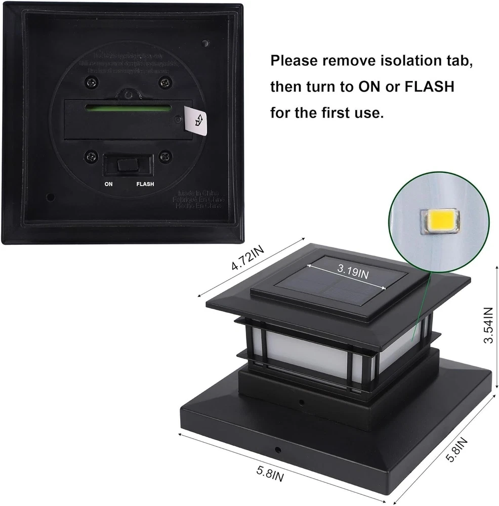 2 Pack Solar Post Cap Lights Outdoor with Flickering Flame Light, Fence Post Solar Lights Fit for 4x4 5x5 6x6 Vinyl/Wooden Posts, High Brightness SMD LED Lighting Decor for Garden Deck Patio PLASTIC DANCING FLAME SOLAR POST LIGHTS: 2 pack modern post cap lights powered by solar, each with 72 pcs yellow SMD LED, they are the perfect decorative outdoor lighting and no electricity required. Solar LED flickering flameless candles lights, add a 360 degree viewing angle illuminate charming to your garden, decorate your fence, deck, porch or yard. Measurement: x x inches DANCING FLAMES LIGHTS: A safe alternative to the real flame effect - 72 pcs high brightness SMD LEDs cast a safe, soft and gentle glow, produces a very calm and impressive atmosphere. When night comes, it lights up and the LED flame light leaping, which will bring you a beautiful scenery. There are 2 LIGHTING MODE - FLAME and ON, if you want flame effect, please turn to FLAME. Please note that they are designed for outdoor decoration, maybe not bright enough, but the light is soft and gentle SOLAR POWERED: This beautiful solar light is NOT electricity needed. Powered by solar, charged in full and direct sunlight for 6-8 hours. There is a tab at the back of the solar panel, please remove it and turn to ON or FLASH before charging, so that this solar LED lights will automatically turn on at night and turn off at dawn. For your convenience, each include 1000MAH NI-MH AA rechargeable battery EASY TO ASSEMBLE: Complete with detailed instructions. Our fence post solar lights come with different sizes of bases, which are compatible with any standard true size "", 4"x4", "", 5"x5", "" wood / vinyl / plastic post cap. These solar garden lights can be done in a few minutes, comes with mounting kit, simply screw the solar cap lights into highest point on the railing OUTDOOR DECORATIVE LIGHTS: These 2 pack garden flickering flame post lights can work normally under kinds of weather with the waterproof rating of , no worries about little rain, snow, frost, or sleet. They can be placed in the front, backyard, along driveway, walkway, sidewalk, around your patio or porch, adds a modern look for your outdoor lighting. In stormy weather, keep the solar lights indoors to avoid damaging the solar panels