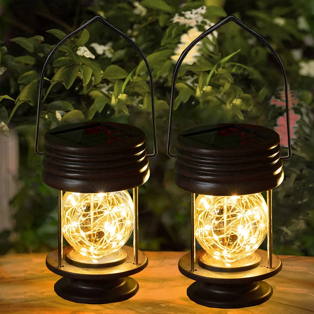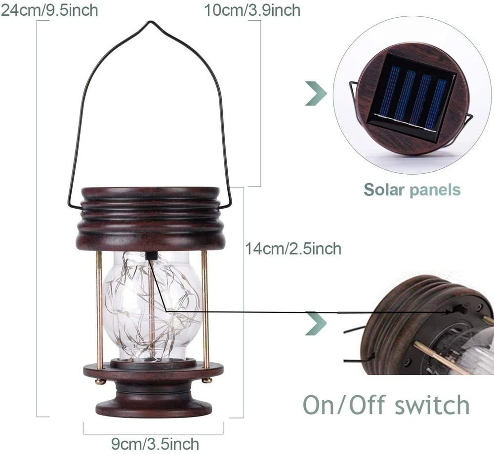【Upgrade Vintage Lantern】- Combined with traditional vintage tabletop lantern & fashion 20 led string lights. The lantern looks like putting the starry sky into a crystal ball at night 【Solar Powered Lanterns】- No wiring required, automatically lighting from dusk and off at dawn. The solar powered lantern gives you the flexibility to hang them anywhere without the need for an electrical outlet, which makes them great for places where power is not readily available 【Waterproof Solar Lantern】- IP44 waterproof , withstand all kinds of weather, without worrying about rain, snow, frost or sleet, suitable for outdoor use, allowing you not to worry about the ambiance of your outdoor area effortlessly from where you are 【Easy Charging& Using 】- Please make sure the button "ON" before using and charging. Measures 5.5 inches, but working time up to 8 hours. Small size and light weight, easy for you to carry and use on the go. 【Versitile Decorative Lantern 】- This solar lantern can be placed on ground used as an table lamp, or hung in somewhere as a hanging decor light, patio umbrella light, porch light etc. It's a perfect decoration to your patio, courtyard or garden