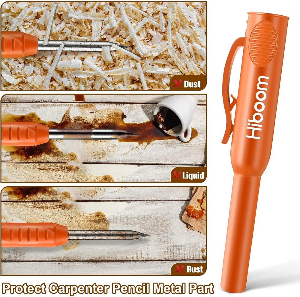 About this item Deep Hole Marker for Wide Application: the deep hole carpenter pencil marker can draw on various materials surface like metal, wood, paper and cement, which is suitable for architect, woodworkers, designers for daily work; Ideal gift for Father's Day Pencil Cap with Non Slot Clip: the carpenter pencil cap has a non slot design for firmly attaching to pocket, carpenter bag, book and tool belt, which is portable for carpenter's daily work Pencil Cap to Protect Carpenter Pencil: the solid carpenter pencil cap is a better tool to protect pencil metal part from dust, liquid and rust, making your construction work easier Built in Sharpener: carpenter pencil top is equipped with mini pencil sharpener; Rotate marking pencil top to take out pencil sharpener, you can sharpen pencil refills anytime Package Includes: the solid carpenter pencil set contains 2 mechanical construction pencil (built-in sharpener), 2 carpenter pencil caps and 3 box refills(3 red refills, 6 yellow refills, 9 gray refills), which can meet your woodworking marking needs for daily life