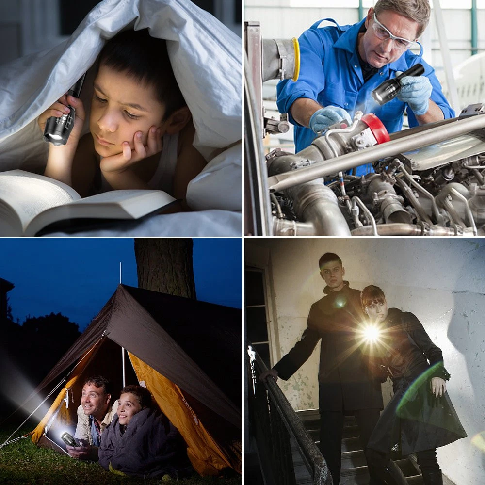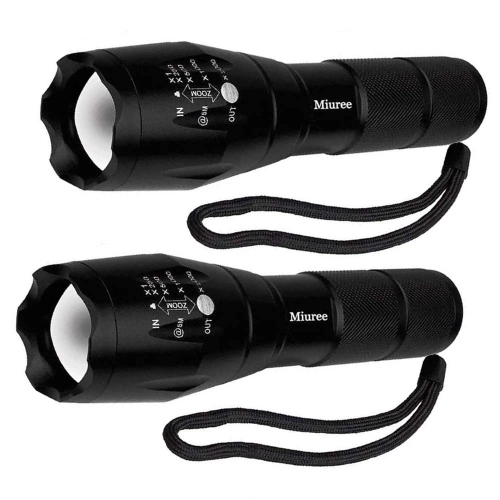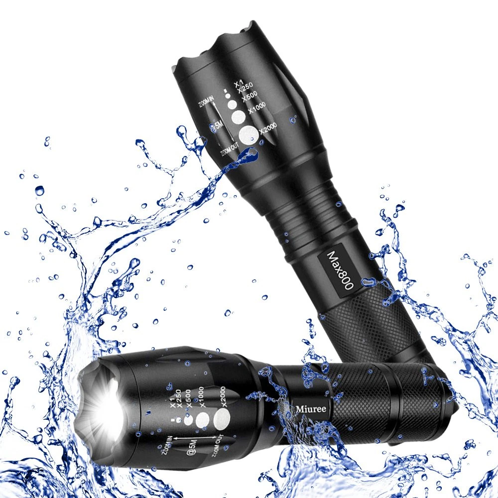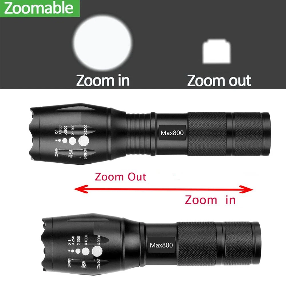 Max800 Elite high-powered tactical Flashlight 5 modes & zoom function . High performance flashlight! military grade zoom flashlight made of high-grade air craft aluminum can be seen up to 5 nautical miles away. Compact & lightweight extending over 6 inch long with LED's that will last up to 100,000 hours! requires FLASHLIGHT FEATURES: LED flashlights with lightweight titanium alloy shells Tactical head can be used for breaking glass 5 lighting modes: Full, medium, and low brightness, strobe, and SOS Adjustable lens allows for various levels of beam focus Hard press to turn on/off and soft press to toggle between modes Estimated LED lifespan: 100,000 hours Each flashlight requires 3 AAA batteries (not included) Package: 2x Flashlight (Battery not included) 1x Operation Guide Perfect for camping, household ,workshop ,automobile and emergency roadside repairs. ADJUSTABLE FOCUS: Intense Spotlight for long range observation can up to 600 feet, Circle Floodlight for large area illumination ADVANCED DESIGN: led flashlight is made from air-craft grade aluminum .Skid-Proof design & Water Resistant design (Impressive performance among handheld flashlights) PROTABLE: 5.4 inches L x 1.6 inches width. led flashlight is small enough to fit in your pocket, handbag, or car compartment, so you can take it with you wherever, whenver POWERE SOURCE: 3pcs AAA Battery (not included)