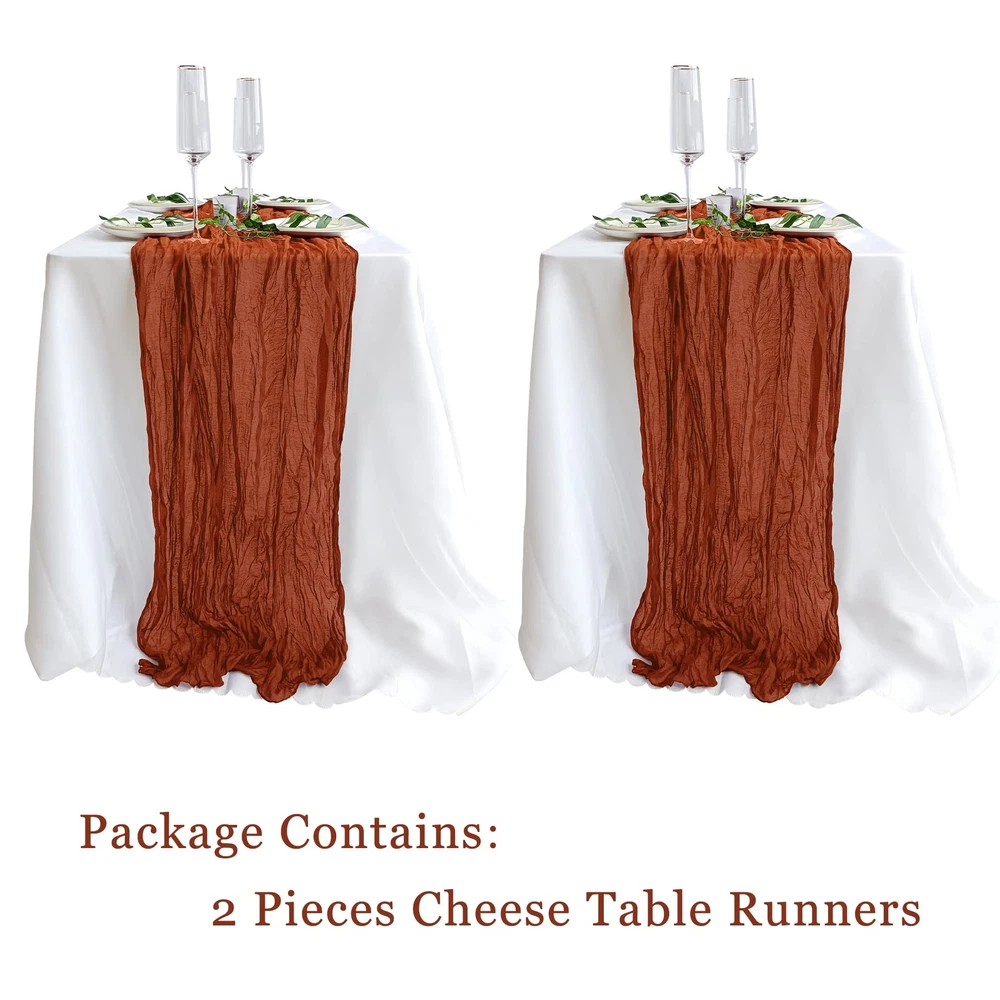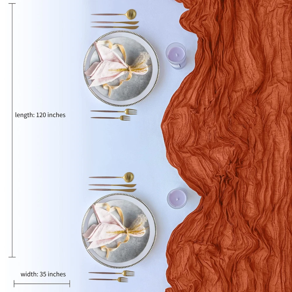 ---Super Soft Touch--- 1. Made of high-quality cotton gauze,with wrinkled 2. Our cotton gauze tablecloth has reduced the linear density of the fabric to get higher light transmittance than other fabrics,with a sewn finish edges, not easy to loose thread ---Rustic Boho Farmhouse Style--- 1. Soft material with wrinkle can bring a casual style and add a pure and elegant style to wedding 2. Fits in Boho farmhouse wedding or theme party, beach ceremony, Valentine's Day , birthday party, Thanksgiving, bridal shower and baby shower ---Care Instructions--- 1. You can choose machine wash or hand washing. Do not dry clean and do not bleach 2. The fabric is delicate and can be prone to tearing. Please be careful to use! --- Product Detail --- 1. Dimensions: 35inch×120inch 2. Colors: Terracotta 3. Package Includes : 2 Pieces Cheese Table Runners 🎀Extra Long Table Runners: Package includes 2 pieces terracotta table runners with wrinkled texture , 35” width and 120” length, each 10 feet long enough to fit most occasions decorations. 🎀Premium Material: Our cheesecloth table runners are made of 100% natural cotton gauze and the fabric is soft and as light as a butterfly wing. 🎀Stylish Table Decor: Give your tables a rustic and gorgeous look with our cheese cloth table runner. Display romantic atmosphere by adding flowers, plants, candles to create enjoyable dining table vibes. 🎀Wide Applications: These versatile high quality table runners brighten up table and add vintage style for home and wedding decor, such as wedding backdrops and reception, arches drapery, baby and bridal shower, centerpiece, Thanksgiving, fall, family gathering and so on. 🎀Care Instructions: Hand wash or machine wash. Edges are designed with a sewn finish, not easily loose thread and no shrinkage after washing. Do not dry clean and do not bleach.