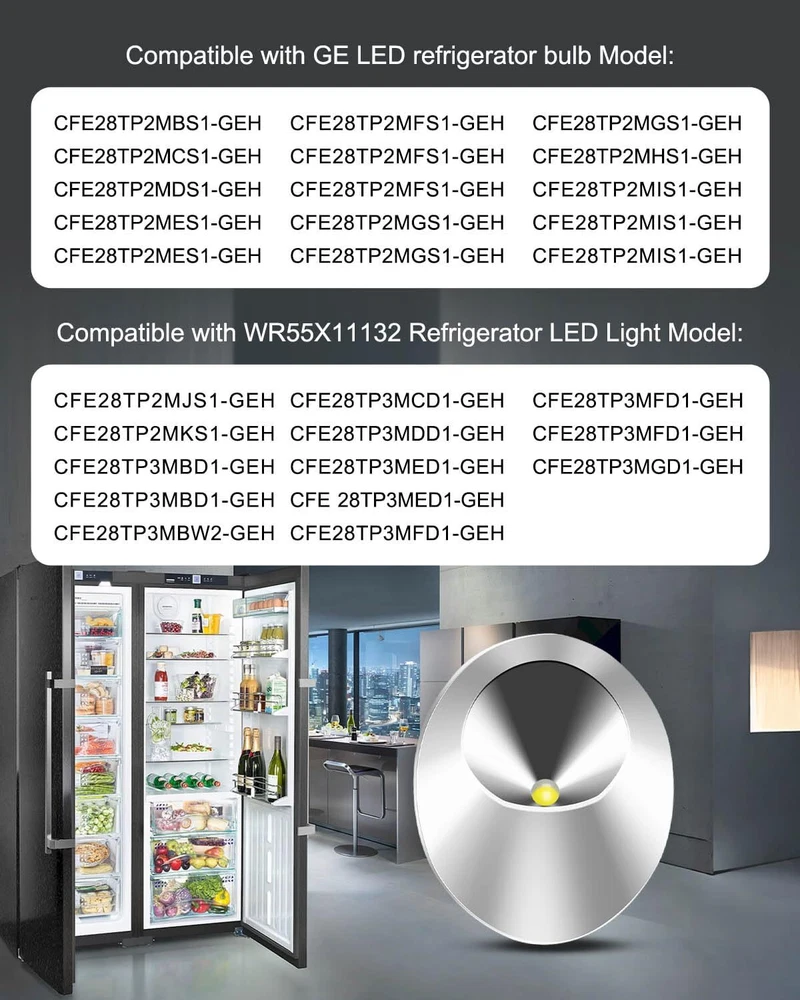 Refrigerator Led Light and Cover Assembly Replace WR55X26487 WR55X30603 WR55X30602 WR55X26486 3033142 AP5646375 PS4704284 Effectively solve the refrigerator LED light dim, flicker, bulb damage or light chip damage Long life, reduce the frequency of replacement, so that you enjoy bright lighting for a long time The LED light line is soft and bright, making the items inside the refrigerator easier to see and providing a comfortable use experience LED lights do not generate too much heat, which helps to keep the internal temperature of the refrigerator stable and keep the food fresh Small and lightweight, suitable for installation in the refrigerator interior lighting device, does not take up too much space, to meet the needs of users on the refrigerator interior space Compatible with GE LED refrigerator bulb Model: Compatible with CFE28TP2MBS1-GEH / CFE28TP2MCS1-GEH / CFE28TP2MDS1-GEH / CFE28TP2MES1-GEH / CFE28TP2MES1-GEH / CFE28TP2MFS1-GEH / CFE28TP2MFS1-GEH / CFE28TP2MFS1-GEH / CFE28TP2MGS1 -GEH / CFE28TP2MGS1-GEH / CFE28TP2MGS1- GEH / CFE28TP2MHS1-GEH / CFE28TP2MIS1-GEH / CFE28TP2MIS1-GEH / CFE28TP2MIS1-GEH Compatible with WR55X11132 Refrigerator LED Light Model: Compatible with CFE28TP2MJS1-GEH / CFE28TP2MKS1-GEH / CFE28TP3MBD1-GEH / CFE28TP3MBD1-GEH / CFE28TP3MBW2-GEH / CFE28TP3MCD1-GEH / CFE28TP3MDD1-GEH / CFE28TP3MED1-GEH / CFE 28TP3MED1-GEH / CFE28TP3MFD1-GEH / CFE28TP3MFD1-GEH / CFE28TP3MFD1-GEH / CFE28TP3MGD1-GEH Replaces Part Number: Refrigerator LED light bulb and cover assembly replaces WR55X11132 WR55X25754 AP142 PS4704284 Durable and Reliable: Made of high-quality ABS plastic, with excellent low temperature resistance, anti-aging and waterproof, long service life, reduce the frequency of replacement, so that you can enjoy a clear and bright lighting effect for a long time Easy to Install: No complicated steps, plug and play, direct replacement, quick restoration of bright and soft lighting, so that you can clearly see the items in the refrigerator at any time, improve the use experience