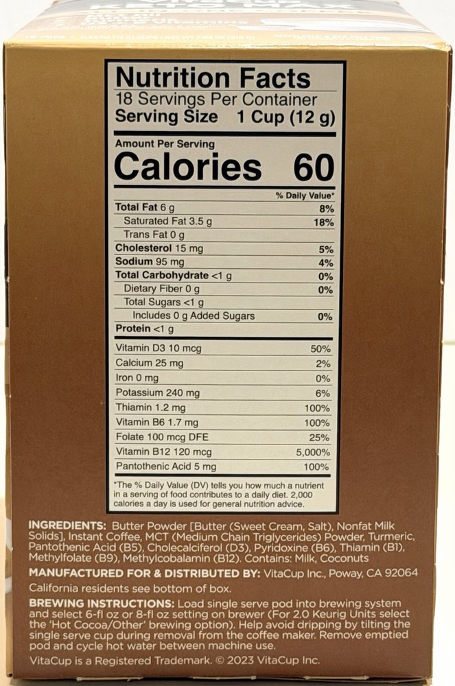 All keto ingredients mixed in, skip the measuring. Sustained energy and focus from one morning cup. Creamy, satisfying taste keeps you full longer. ALL IN ONE KETO: Don’t waste time and money buying individual ingredients to make your keto coffee. KetoMax takes the work out of it for you with butter + coconut MCT oil + vitamins, in a ready to drink formula. DARK ROAST COFFEE: Sip on premium 100% Arabica beans from Chiapas, Mexico for a super clean energy boost. We put in the hard work so your coffee can work hard for you. DIETITIAN FORMULATED: Each VitaCup blend is dietitian-formulated and packed with the nutrients your body needs to function at its best. KetoMax is made with functional ingredients and is free from gluten & soy! DAILY DOSE OF VITAMINS: Each cup of coffee contains an essential blend of vitamins and nutrients, allowing you to simplify your morning routine with one less step. KetoMax contains vitamins B1, B5, B6, B9, B12 & D3.