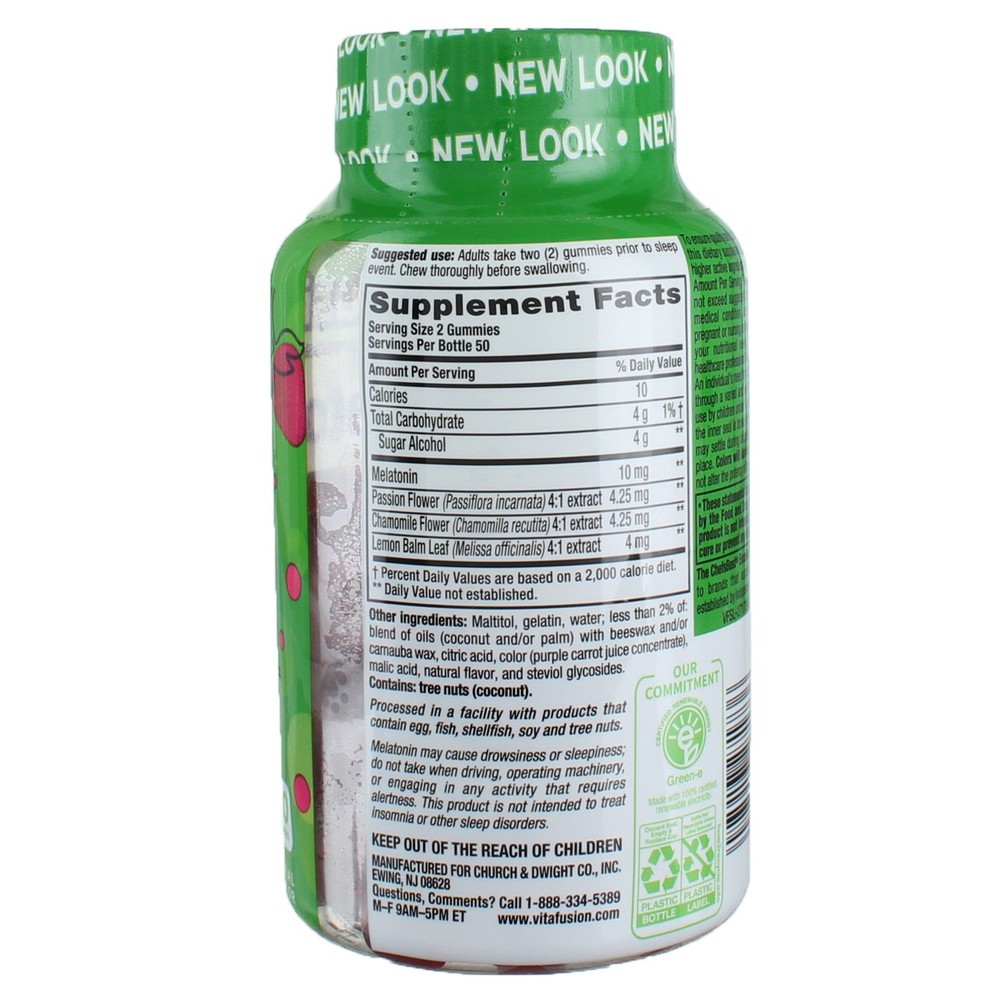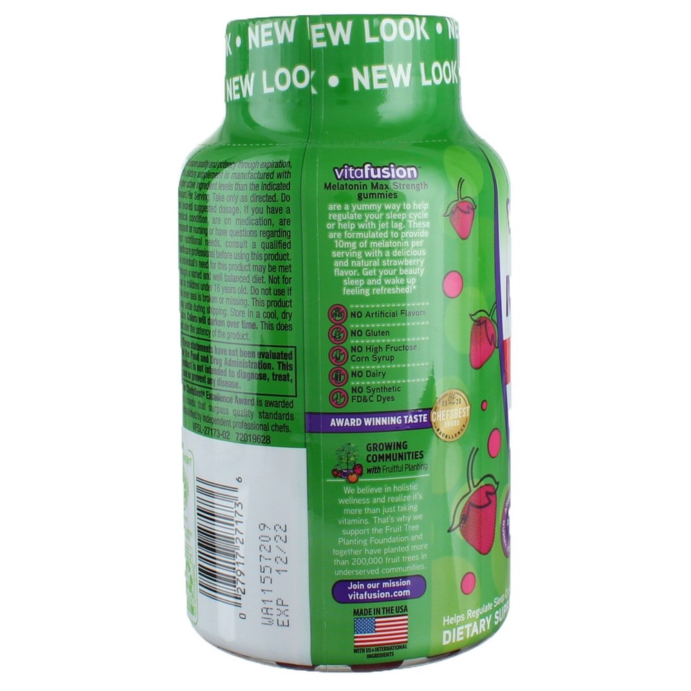 Product Description Wake up ready to take on the day with vitafusion Max Strength Melatonin Sleep Support Gummy Supplement [1]. It's a yummy gummy made with a natural strawberry flavor that helps you get your beauty sleep and wake up feeling refreshed. [1] Each two-gummy serving supports sleep and helps with jet lag recovery. [1] It's specially formulated to provide 10 mg of melatonin per serving. What you won't get: no gluten, no dairy, no synthetic (FD&C) dyes, no artificial flavors and no high fructose corn syrup. At vitafusion, we believe taste and nutrition can be fused together to deliver the best vitamin experience, ensuring it's an easy and delicious part of your day. For over 12 years, we've been helping people to live happy and healthy lives with our gummy vitamins and supplements. Anything is possible when great nutrition is your foundation. Take a fruitful step toward a healthier, happier world with America's #1 gummy vitamin brand. Vitamin Better! [1] These statements have not been evaluated by the Food and Drug Administration. This product is not intended to diagnose, treat, cure or prevent any disease. Gluten Free A product that has an unqualified independent third-party certification, or carries an on-pack statement relating to the finished product being gluten-free. Helps regulate sleep cycle Helps with jet lag Natural Strawberry Flavor Maximum Strength melatonin with 10mg per serving Contains NO artificial flavors, NO high fructose corn syrup, NO gluten, NO dairy, and NO synthetic (FD&C) dyes Ingredients Other Ingredients: Maltitol, Gelatin, Water, Less Than 2% Of: Blend Of Oils (Coconut And/Or Palm) With Beeswax And/Or Carnauba Wax, Citric Acid, Color (Purple Carrot Juice Concentrate), Malic Acid, Natural Flavor, And Steviol Glycosides. Product Description Wake up ready to take on the day with vitafusion Max Strength Melatonin Sleep Support Gummy Supplement [1]. It's a yummy gummy made with a natural strawberry flavor that helps you get your beauty sleep and wake up feeling refreshed. [1] Each two-gummy serving supports sleep and helps with jet lag recovery. [1] It's specially formulated to provide 10 mg of melatonin per serving. What you won't get: no gluten, no dairy, no synthetic (FD&C) dyes, no artificial flavors and no high fructose corn syrup. At vitafusion, we believe taste and nutrition can be fused together to deliver the best vitamin experience, ensuring it's an easy and delicious part of your day. For over 12 years, we've been helping people to live happy and healthy lives with our gummy vitamins and supplements. Anything is possible when great nutrition is your foundation. Take a fruitful step toward a healthier, happier world with America's #1 gummy vitamin brand. Vitamin Better! [1] These statements have not been evaluated by the Food and Drug Administration. This product is not intended to diagnose, treat, cure or prevent any disease. Gluten Free A product that has an unqualified independent third-party certification, or carries an on-pack statement relating to the finished product being gluten-free. Helps regulate sleep cycle Helps with jet lag Natural Strawberry Flavor Maximum Strength melatonin with 10mg per serving Contains NO artificial flavors, NO high fructose corn syrup, NO gluten, NO dairy, and NO synthetic (FD&C) dyes Ingredients Other Ingredients: Maltitol, Gelatin, Water, Less Than 2% Of: Blend Of Oils (Coconut And/Or Palm) With Beeswax And/Or Carnauba Wax, Citric Acid, Color (Purple Carrot Juice Concentrate), Malic Acid, Natural Flavor, And Steviol Glycosides. Allergens May Contain: Eggs, Soy, Tree Nuts, Shellfish, Fish Suggested Use Suggested Age: 18 Years and Up Warnings Product Warning: Consult a doctor if you are pregnant or nursing, consult a doctor if you have a medical condition prior to use Allergens & Warnings: Contains: tree nuts (coconut). Processed in a facility with products that contain egg, fish, shellfish, soy and tree nuts. Melatonin may cause drowsiness or sleepiness; do not take when driving, operating machinery, or engaging in any activity that requires alertness. This product is not intended to treat insomnia or other sleep disorders. To ensure quality and potency through expiration, this dietary supplement is manufactured with higher active ingredient levels than the indicated Amount Per Serving. Take only as directed. Do not exceed suggested dosage. If you have kidney diseases, a medical condition, are on medication, are pregnant or nursing or have questions regarding your nutritional needs, consult a qualified healthcare professional before using this product. An individual's need for this product may be met through a varied and well balanced diet. Do not use if the inner seal is broken or missing. This product may settle during shipping. Do not expose to excessive heat or moisture. Colors may darken over time. This does not after the potency of the product. In case of accidental ingestion by children, get medical help or contact a Poison Control Center right away. Keep out of the reach of children. Disclaimer The product descriptions and instructions provided by vitabox.com are for informational purposes only and are qualified in their entirety by the information available from manufacturers of the products. You should carefully read all product packaging, and contact the manufacturer with any questions before using a product. While we endeavor to ensure that product descriptions are current, manufacturers sometimes change their products. We are not liable for inaccuracies or misstatements about products. We do not provide medical advice or recommendations. You should not use the information provided by vitabox.com for diagnosing or treating a health problem or disease. If you have or suspect that you have a medical problem, immediately contact your health care provider. Information and statements regarding dietary supplements have not been evaluated by the Food and Drug Administration or any other government agency 