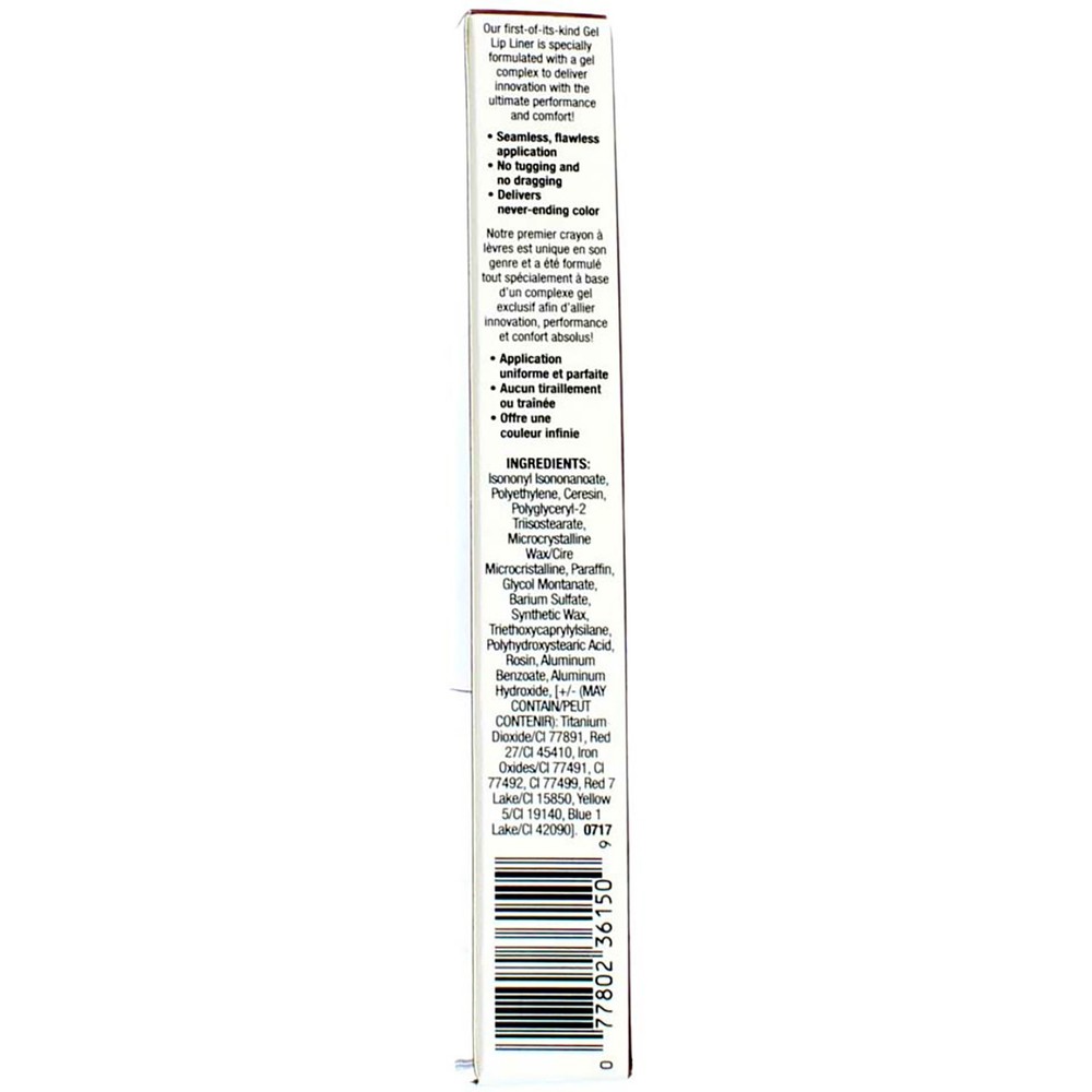 Product Description Tell your lips to get in line for pout perfection. A lip liner like no other made with a special polymer formula it seamlessly glides onto lips and leaves color that goes on for days. Wear alone or under lipstick for color that won't budge. Like ever. Seamlessly glides onto lips and leaves lasting color Smooth, flawless application Specially formulated with proprietary polymer and ester complex Product Description Tell your lips to get in line for pout perfection. A lip liner like no other made with a special polymer formula it seamlessly glides onto lips and leaves color that goes on for days. Wear alone or under lipstick for color that won't budge. Like ever. Seamlessly glides onto lips and leaves lasting color Smooth, flawless application Specially formulated with proprietary polymer and ester complex Disclaimer The product descriptions and instructions provided by vitabox.com are for informational purposes only and are qualified in their entirety by the information available from manufacturers of the products. You should carefully read all product packaging, and contact the manufacturer with any questions before using a product. While we endeavor to ensure that product descriptions are current, manufacturers sometimes change their products. We are not liable for inaccuracies or misstatements about products. We do not provide medical advice or recommendations. You should not use the information provided by vitabox.com for diagnosing or treating a health problem or disease. If you have or suspect that you have a medical problem, immediately contact your health care provider. Information and statements regarding dietary supplements have not been evaluated by the Food and Drug Administration or any other government agency and are not intended to diagnose, treat, cure, or prevent any disease.