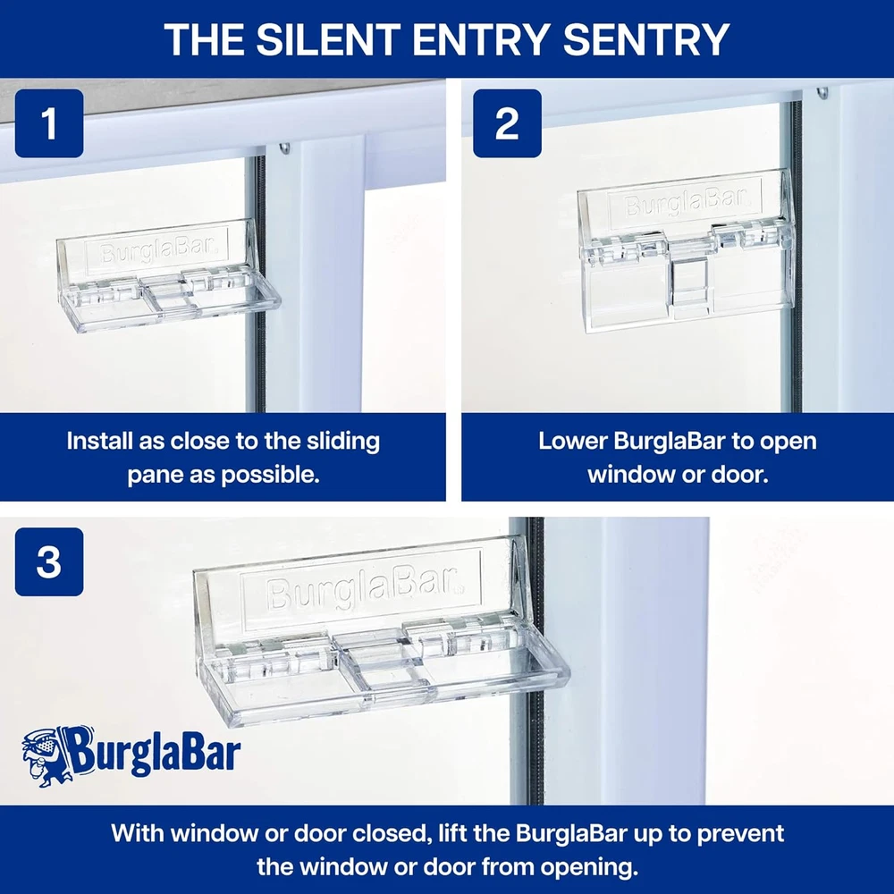 Enhance Your Home Security: Instantly add additional security to patio doors and windows with this unique hinge-style sliding glass door lock; Not only does this door security device keep your space safe, it can also be used to childproof your home Easy To Install: The Burglabar patio door lock is simple to install - no tools required - and its crystal-clear design easily blends in; This versatile child-proof door lock can be used as a sliding door security bar or a sliding window lock Adjusts To Your Door: Our sliding glass door security bar can easily be adjusted to fit different doors sizes; Secure your home with a Burglabar security bar for sliding glass doors and windows and enjoy added peace of mind Sturdy & Reliable: These durable security door locks come equipped with strong adhesive that adheres to glass like a weld for maximum strength; When properly applied, our sliding door and window security bars provide additional safety and security 20 Years of Experience: The creators of the original Addalock and Burglabar, Rishon Enterprises Inc. is dedicated to promoting safety, security, and privacy; Protect your spaces, whether at home or away, with our safety locks for doors Product Description Unlocked Position Open Sliding Doors/Windows Locked Position