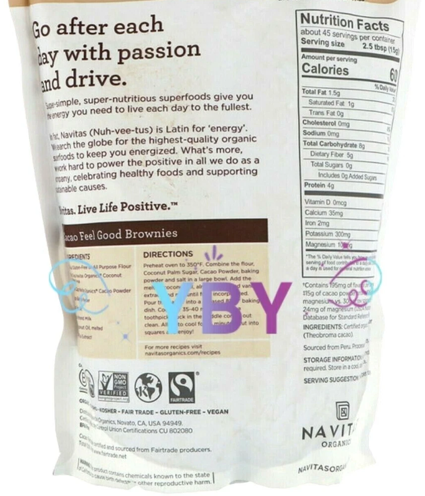 2 Packs Navitas Organics Organic Cacao Powder 24 OZ Each Pack USDA Organic Premium | Plant-Based Superfood Nature's Dark Chocolate Antioxidants (Flavanols)† No Added Sugar or Preservatives Kosher Gluten Free Vegan BPA Free Cacao: Fairtrade Certified and Sourced from Fairtrade Producers. Total 100% Replace Cocoa 1:1 From Unroasted Cacao Beans Homemade Mochas, Brownies & Cakes Pack of 2 (24 oz each pack) NET WT 24 OZ 680 G EACH PACK Feel free to ask any questions regarding to this item