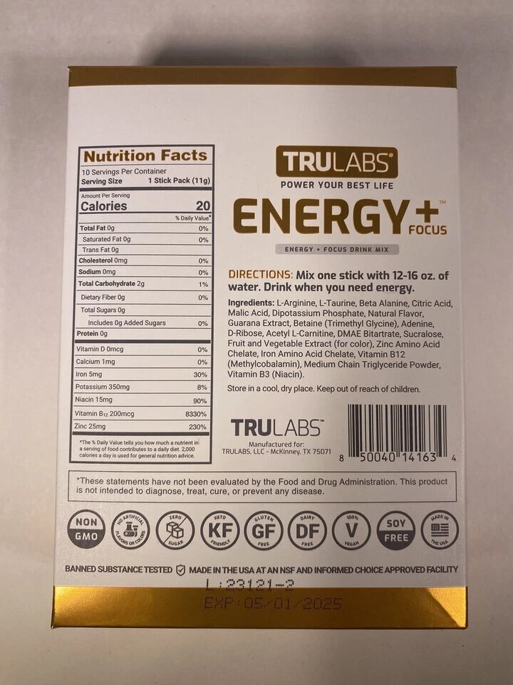 gtin13:0850040141269Dosage:read the labelNumber of Pills:10Department:Men, Unisex, WomenItem Weight:57 gActive Ingredients:Acetyl-L-Carnitine, CaffeineWhen to Take:After Meal, After Workout, Before WorkoutFlavor:Orange, PineappleVolume:2.03 ozType:DrinkExpiration Date:05/2025Country/Region of Manufacture:United StatesMPN:NANutrition Facts Label:YesType of Diet:Bodybuilding, Fitness, VeganBrand:TRULABSIngredients:see labelUPC:0850040141269Features:Soy-Free, Sugar-Free, Dairy Free, Keto, Non GMO, VeganMain Purpose:Endurance/EnergyFormulation:PowderSupply:Up to 1 Month