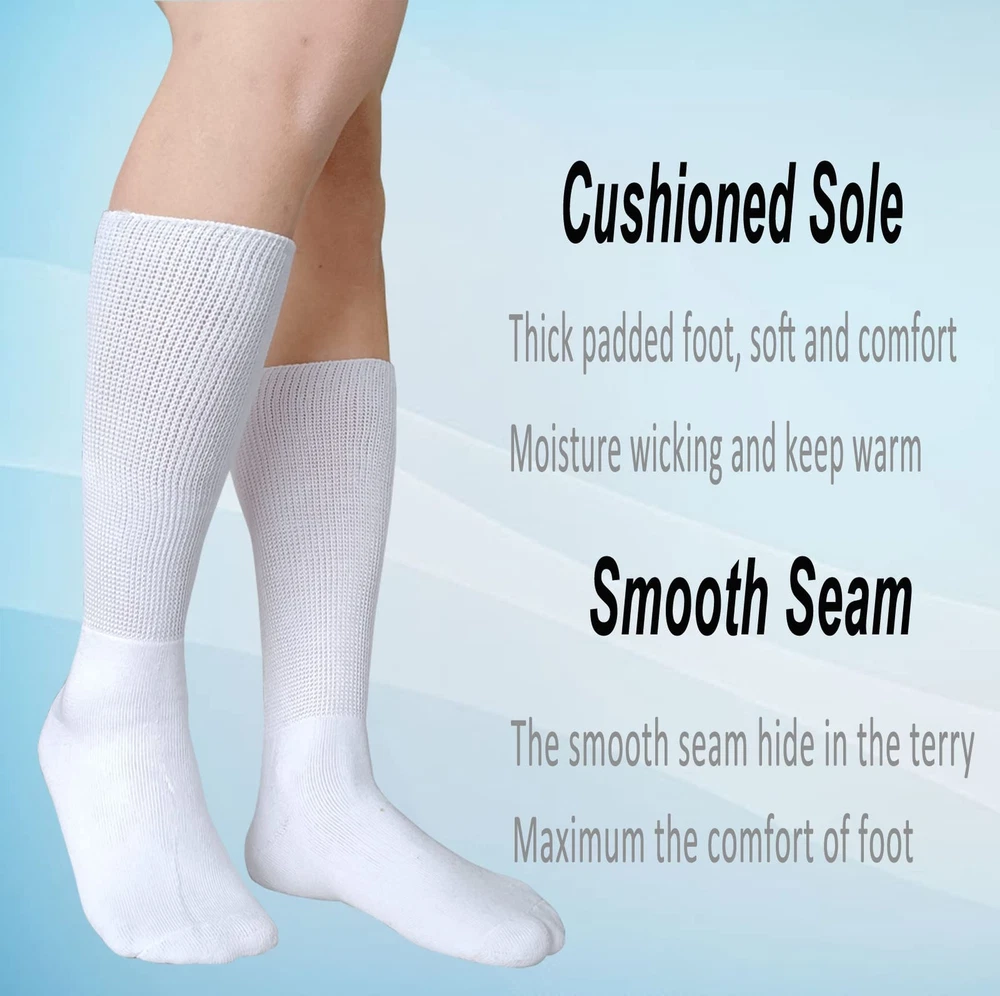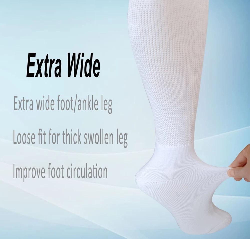 Description 2 Pairs Extra Wide Bariatric Socks Non Binding Extra Wide Diabetic Socks For Women Men- Viasox Lymphedema Cast Socks, Over Calves Medical Super Width Socks for Swollen Edema Foot Ankle Leg ★Diabetic Socks Non Binding: Super wide calf can stretch up to 30" wide, Super Stretchy, Super Comfort non binding socks, it is special idea socks for neuropathy bariatric diabetic swollen feet or leg. ★One Size For Men Women: The unisex extra wide diabetic socks fit for socks size Mens 10-13,Womens 9-11 or plus size. It is loose fit and stay up, leave no marks on leg. ★Thick Warm And Soft Diabetic Socks Over Calves: The people who are Suffering from circulation problem always feel cold at feet. These non binding edema socks will non constrict to circulation and the cushioned foot will keep feet warm. The thickly soft cushioned foot make your feet comfortable and happy. ★Extra Wide Socks For Diabetic Swollen Foot Leg Cast Cover: The material is soft and moisture wicking, loose fit to wide calf or cast leg, friendly to elderly or people wear casts or bandages, it is easy to put on and take off, but stay up. It is premium diabetic socks for lymphedema, bariatric, swollen edema wider or thick foot or cast leg, surgical leg, sensitive foot, medical hospital socks. ★Package & Washing instruction: 2 pairs of white extra wide over calf socks, machine wash and dry in lower temperature, do not bleach ★Diabetic Socks Non Binding: Super wide calf can stretch up to 30" wide, Super Stretchy, Super Comfort non binding socks, it is special idea socks for neuropathy bariatric diabetic swollen feet or leg. ★One Size For Men Women: The unisex extra wide diabetic socks fit for socks size Mens 10-13,Womens 9-11 or plus size. It is loose fit and stay up, leave no marks on leg. ★Thick Warm And Soft Diabetic Socks Over Calves: The people who are Suffering from circulation problem always feel cold at feet. These non binding edema socks will non constrict to circulation and the cushioned foot will keep feet warm. The thickly soft cushioned foot make your feet comfortable and happy. ★Extra Wide Socks For Diabetic Swollen Foot Leg Cast Cover: The material is soft and moisture wicking, loose fit to wide calf or cast leg, friendly to elderly or people wear casts or bandages, it is easy to put on and take off, but stay up. It is premium diabetic socks for lymphedema, bariatric, swollen edema wider or thick foot or cast leg, surgical leg, sensitive foot, medical hospital socks. ★Package & Washing instruction: 2 pairs of white extra wide over calf socks, machine wash and dry in lower temperature, do not bleach