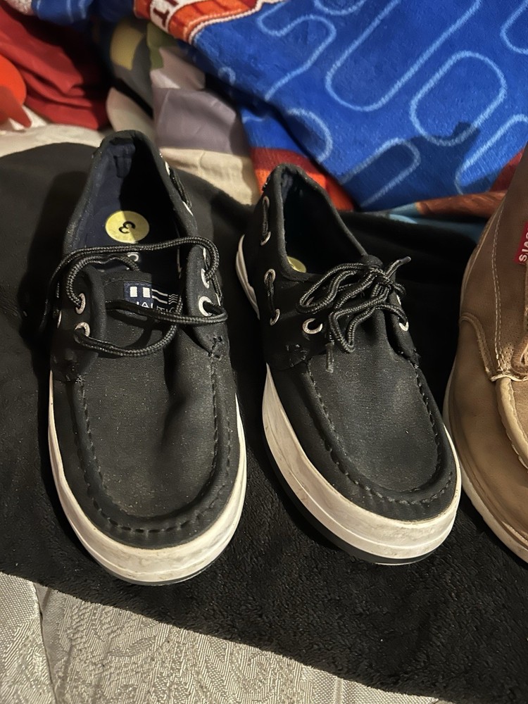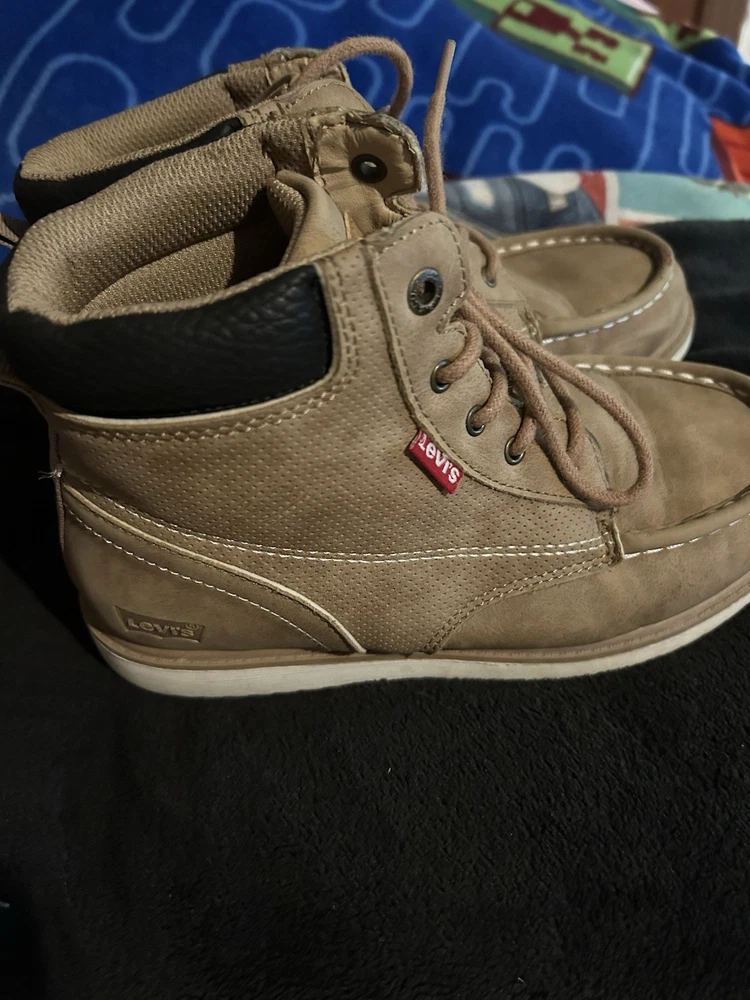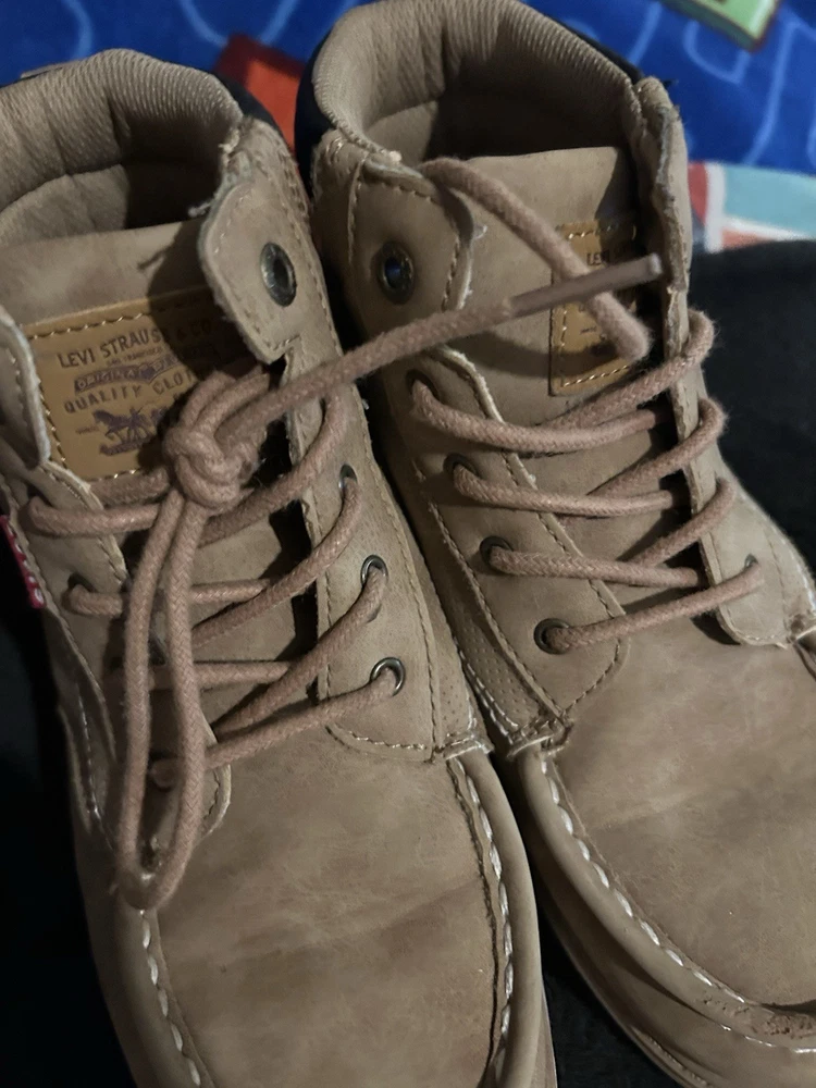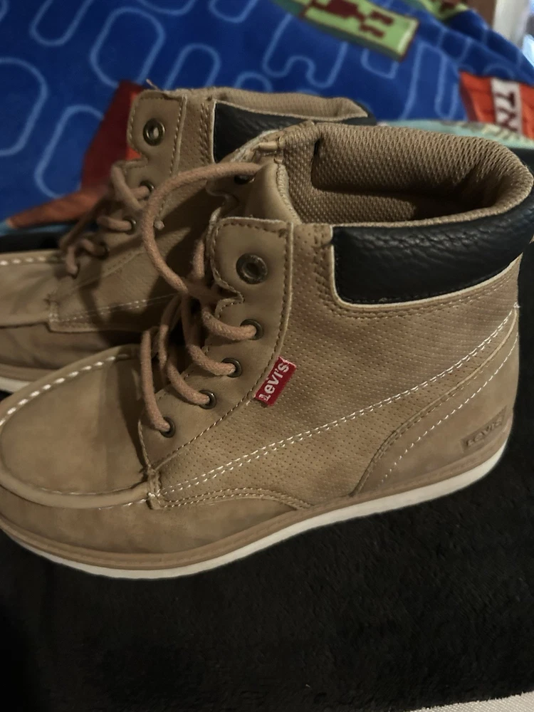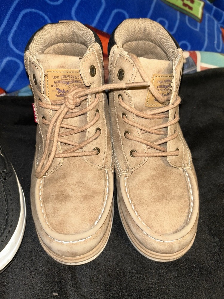 The product is a set of boys' shoes, specifically boots from the brands Levi and Nautica. The boots are in size 3 and are designed specifically for boys. These shoes are stylish and fashionable, perfect for young boys who want to stay trendy. The Levi boots offer a rugged and casual style, while the Nautica shoes are more sporty and versatile. This set would be great for a variety of casual outfits and occasions, making it a versatile addition to any boy's wardrobe. No returns no refunds
