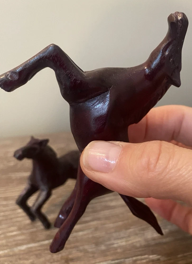 Two pairs of vintage toy horses made of hard plastic or resin. These realistic and detailed figurines are perfect for fans of cowboy and western themes, as well as vintage and antique toy collectors. With their nostalgic appeal and unique design, these vintage toy horses are sure to bring joy to any collection.