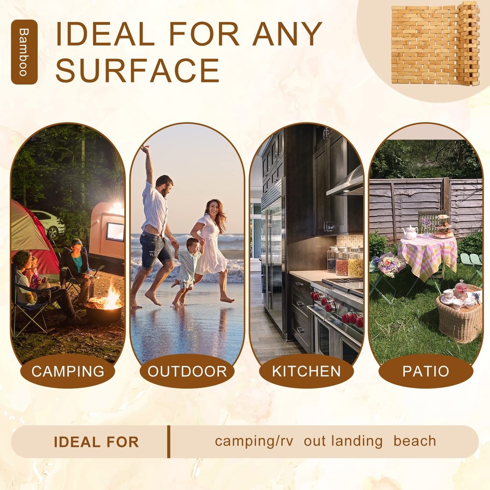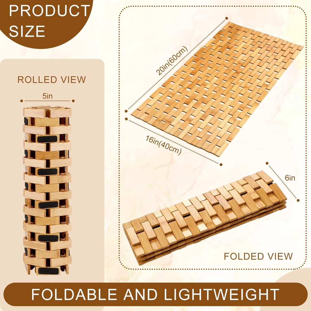 Features: You will be provided with 2 pieces of non skid bamboo bathroom mats in the package, sufficient in quantities and distinctive in design, which are enough for your daily use and replacement needs in daily life. Bamboo bath tub mat can be a practical and decorative addition to your home and suitable for indoor and outdoor use, it will be a suitable gift option for most occasions for your friends, family, neighbors, coworkers and so on. Specifications: Material: bamboo and silicone Color: carbonized color Size: about 24 x 16 inches/ 60 x 40 cm Package includes: 2 x Shower mats for bathroom Notes: Manual measurement, please allow slight errors on size. The color may exist a slight difference due to different screen displays. Foldable Design: our bamboo bathtub mat is measured about 24 x 16 inches/ 60 x 40 cm, which is proper in size and light in weight, and can be folded to carry and store, so you can put it in a bag or car, without taking up too much space Long Time Service: our non slip bath mats for bathroom are mainly made of quality bamboo material, which is safe and reliable, strong in hardness and sturdy, not easy to break, deform, fade or wear, can be applied for a long time Nice Accessories for Fabric Rugs: you can place a fabric rug on top of our bamboo floor mat to keep your rug dry and prevent bad odors from developing due to its multiple lattice openings allowing airflow and water to escape Non Slip Silicone Mat: waterproof bathroom floor mat has a quality silicone material on the bottom, which can grip various floors, including tile and wood, etc., preventing the bath mat from shifting and slipping, protecting you and your family from safety and comfort Wide Range of Uses: wooden bath mats are suitable for placing on bathroom, kitchen, living room, bedroom, doorway, deck, poolside, outdoor camping, beach, under the grill, patio, deck, garages, entryways, office and so on, will easy to draw people's attention