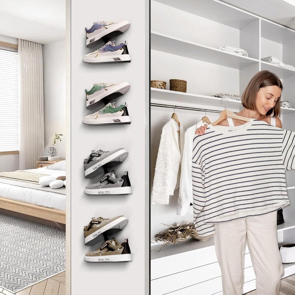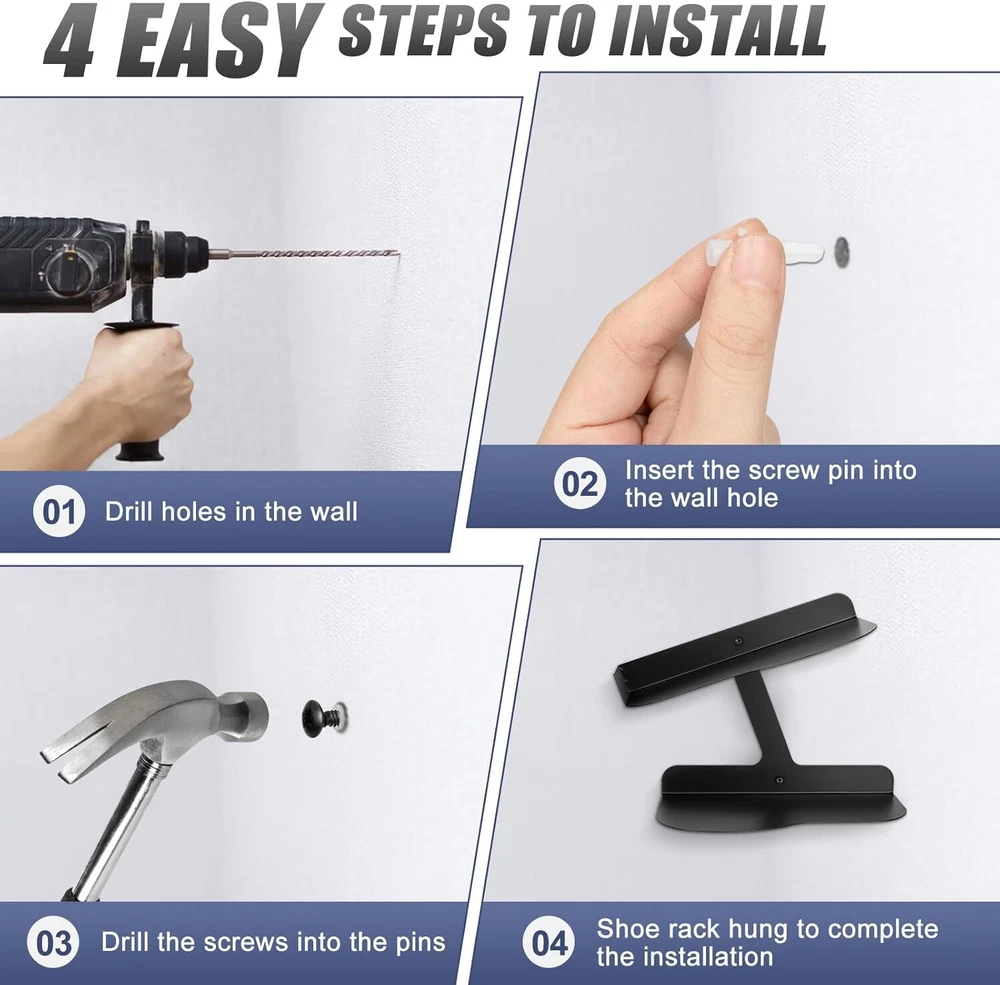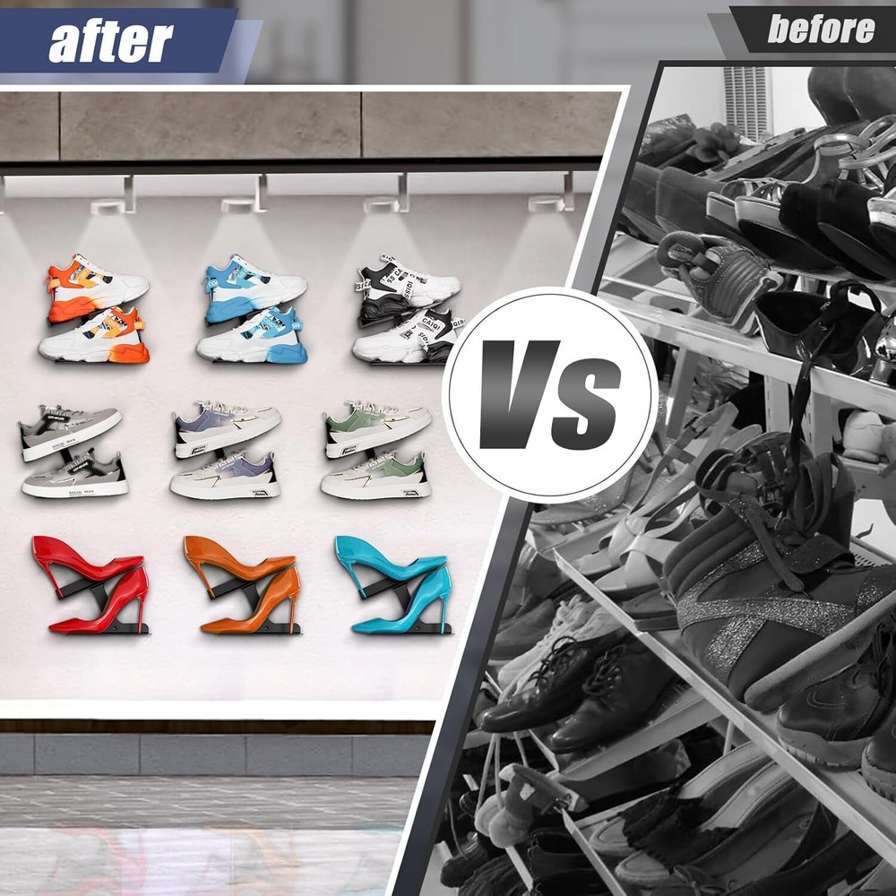 Stylish and Slimple Design: Shoe display high quality and sturdy iron material can safely suspend our beloved shoes and make our shoes become artwork on the wall, H-type up and down shoe rack design can neatly and orderly display the shoes in different angles and maximise the use of wall space. Your friends will be fascinated by your new trainer collection unit Professional Design: Floating shoe display the front end of the shoe rack is widened to increase the contact area between the soles and the rack, which is compatible with shoes of more sizes (6-13). h-shaped shoe rack, divided into upper and lower storage, the upper panel is upturned by 20°, Shoes with a toe not exceeding 3.74" and a heel not exceeding 6.5" and an anti-slip stopper is designed at the heel to prevent it from slipping off, and the lower panel is a straight line design, which allows us to display our shoes at different angles. Quality Materials: The wall suspended shoe rack is made of high quality iron welding process, the whole body is made of iron, sturdy and durable, smooth and rounded edges, beautiful and durable, suitable for all standard sports shoes / different sizes of shoes Easy Installation: Shoe shelf for wall box contains 1 black shoe wall shelf, 2 screws and 2 dowel pins, and detailed installation instructions, so you can get a perfect suspension shoe mount in minutes Suitable for all kinds of walls: Floating shoe shelvescan be easily used in shoe collection showroom, shoe shop exhibition, living room, bedroom, game room, dormitory, corridor and other scenes. If you pay attention to quality and style, our suspended shoe rack will be your best choice