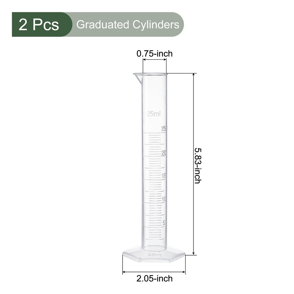 Document MULTIPURPOSE - Our graduated cylinders are great for lab, class, experiment, and daily use, suitable for teachers, technicians, etc.WHAT YOU GET - The package comes with 2pcs 25ml graduated cylinders, in size of 19 x 148 mm / 0.75 x 5.83 inch, [Tube diameter x total height].The base size is 44 x 52mm / 1.73 x 2.05 inch.The tolerance ±0.5ml at 20℃.RELIABLE MATERIAL - This graduated cylinder is made of clear plastic, which is durable and reusable.SPECIAL DESIGNED - Hexagonal base keep the cylinder tube firm and steady.Clear scale on the tube body, for a precise measurement. And the scale will not be faded.Round edge and a tapered pour spout, benefit for filling and pouring, easy to see and use.KINDLY NOTE - This product cannot be used as a reaction container. Please avoid heating, concentrated acids or bases while using it. 2 Pcs Measuring Graduated Cylinders,Great for Lab, Daily Use (Clear White, 25ml) MULTIPURPOSE - Our graduated cylinders are great for lab, class, experiment, and daily use, suitable for teachers, technicians, etc. WHAT YOU GET - The package comes with 2pcs 25ml graduated cylinders, in size of 19 x 148 mm / 0.75 x 5.83 inch, [Tube diameter x total height]. The base size is 44 x 52mm / 1.73 x 2.05 inch. The tolerance ±0.5ml at 20℃. RELIABLE MATERIAL - This graduated cylinder is made of clear plastic, which is durable and reusable. SPECIAL DESIGNED - Hexagonal base keep the cylinder tube firm and steady. Clear scale on the tube body, for a precise measurement. And the scale will not be faded. Round edge and a tapered pour spout, benefit for filling and pouring, easy to see and use. KINDLY NOTE - This product cannot be used as a reaction container. Please avoid heating, concentrated acids or bases while using it. Hot Item Payment 1.We accept eBay payment . 2.Payment must be received within 7 business days of auction closing. Shipping 1.We ship to your eBay or Paypal address. Please make sure your eBay and Paypal address is correct before you pay. 2.Items will be shipped within 1-3 business day when we received payment. 3.Delivery time depends on destination and other factors. Description Policy 2 Pcs Measuring Graduated Cylinders,Great for Lab, Daily Use (Clear White, 25ml) MULTIPURPOSE - Our graduated cylinders are great for lab, class, experiment, and daily use, suitable for teachers, technicians, etc. WHAT YOU GET - The package comes with 2pcs 25ml graduated cylinders, in size of 19 x 148 mm / 0.75 x 5.83 inch, [Tube diameter x total height]. The base size is 44 x 52mm / 1.73 x 2.05 inch. The tolerance ±0.5ml at 20℃. RELIABLE MATERIAL - This graduated cylinder is made of clear plastic, which is durable and reusable. SPECIAL DESIGNED - Hexagonal base keep the cylinder tube firm and steady. Clear scale on the tube body, for a precise measurement. And the scale will not be faded. Round edge and a tapered pour spout, benefit for filling and pouring, easy to see and use. KINDLY NOTE - This product cannot be used as a reaction container. Please avoid heating, concentrated acids or bases while using it. Hot Item Payment 1.We accept eBay payment . 2.Payment must be received within 7 business days of auction closing. Shipping 1.We ship to your eBay or Paypal address. Please make sure your eBay and Paypal address is correct before you pay. 2.Items will be shipped within 1-3 business day when we received payment. 3.Delivery time depends on destination and other factors.