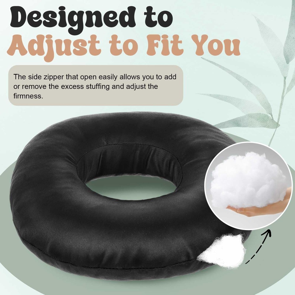Features: The ear pillows donut can be easily cleaned by hand or in a washing machine with cold water due to its special shape and beautiful black color. It encourages you to maintain maximum hygiene and extend the pillow's longevity. Featuring dimensions of about 11 x 11 x 3.2 inches/ 28 x 28 x 8 cm, it doesn't occupy too much space in your bag or bed, making it a convenient and practical companion for your healing journey. Given its design and comfortable material, this ear hole piecing pillow is absolutely necessary for travel. Specifications: Inner material: polyester, satin Color: black Size: about 11 x 11 x 3.2 inches/ 28 x 28 x 8 cm Package includes: 2 x Ear hole piecing pillows Notes: Manual measurement, please allow slight errors on size. The color may exist a slight difference due to different screen displays. Our product is not suitable for sensitive skin. Test whether there is any allergy on a small part of your skin before use. Please stop applying if there is any discomfort. It is recommended not to use our product continuously, and please be careful to gently remove the product to avoid skin injury. Dual Pack Ear Piercing Pillows: these 2 pieces satin ear hole piecing pillows are ideal for anyone with newly pierced ears seeking relief and quicker healing; The polyester filled pillows relieve ear pain by preventing friction and irritation during sleep, leading to a reduction in redness and no headaches upon waking; For ear cartilage, cochlear studs or ear lobe piercings, these pillows support comfortable sleep and reduce pressure on the ear piercings for effective healing The Nighttime Companion for Piercing Enthusiasts: ideal for those with multiple ear piercings or those who prefer sleeping on their side, this ear pillows donut reduces pain and caters to newly pierced ears immaculately; Ideal for those recovering from ear surgery, wearers of earrings, aids or even ear pain sufferers; Not just for pierced ear enthusiasts and side sleepers, but also for those who prefer sleeping with earplugs in The Healing Ear Piercing Pillow: whether you suffer from bedsores, or earaches, this ear piercing pillow is sure to become your bedtime friend; Its doughnut shape and central opening allow for a comfortable resting place, reducing the pain of friction or compression; Plus, it's for back sleepers who like tying their hair in a ponytail or bun Experience Comfort with Polyester Fill: this ear hole piecing pillow for side sleep provides soft, cloud like luxury for undisturbed sleep every night; Its reliable polyester filling does not deflect under pressure; Moreover, the pillow's design prevents direct contact between the ear and bed surface, preventing headaches or neck pain making your ear piercing journey more comfortable Designed with an Adjustable Strength: this piecing pillow is light but durable, shaped to accommodate the ear, and provides ample support for the head; The pillow's side zipper allows for effortless removal of excess filling to adjust to your liking; Sized to not occupy much space on your bed or travel bag, this black pillow can also support injured piercings, prevent neck strain, and reduces irritation/pressure on your piercing while adding to your comfort