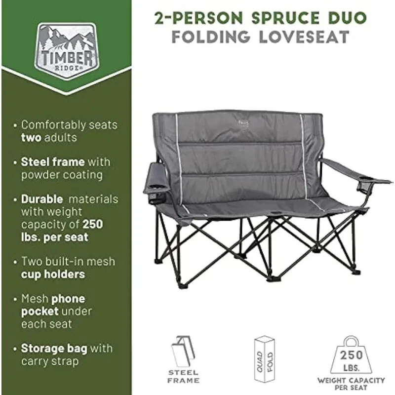 Color Grey Product Dimensions 17.7"D x 41.3"W x 33.1"H Size Support Up to 500 lbs, Back Style Solid Back About this item DOUBLE CAMPING CHAIR - Double chair is ideal for couples or friends who want to sit together. Portable outdoor loveseat design meets the needs of 2 person outdoors while being very easy to transport and store LOWER HEIGHT DESIGN - This camping couch is typically lower in seat height than traditional camping chairs, which allows for a more relaxed seating position, that is ideal for people who want to sit close to the ground and feel more connected to nature while camping LIGHTWEIGHT CAMPING LOVESEAT- The lawn chairs folding feature a lightweight and durable steel frame that provides enough sturdy support, 10.8 lbs lightweight and portable design for easy transportation and storage in outdoors scenarios DIMENSIONS- The camping couch's set up size is 17.72" x 41.34" x 32.28", folding size is 11.02" x 9.45" x 32.28". Max load is 500 lbs.Versatile design can be used as a lawn chair, camping couch, outdoor chair, or sports chair for adult in a variety of activities MANUFACTURER'S WARRANTY- Timber Ridge camping chair offers 1 year warranty, no matter double camping chair is damaged during use or in the process of transportation, the after-sales team is ready to serve you
