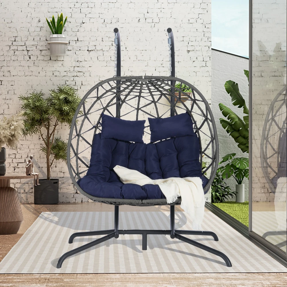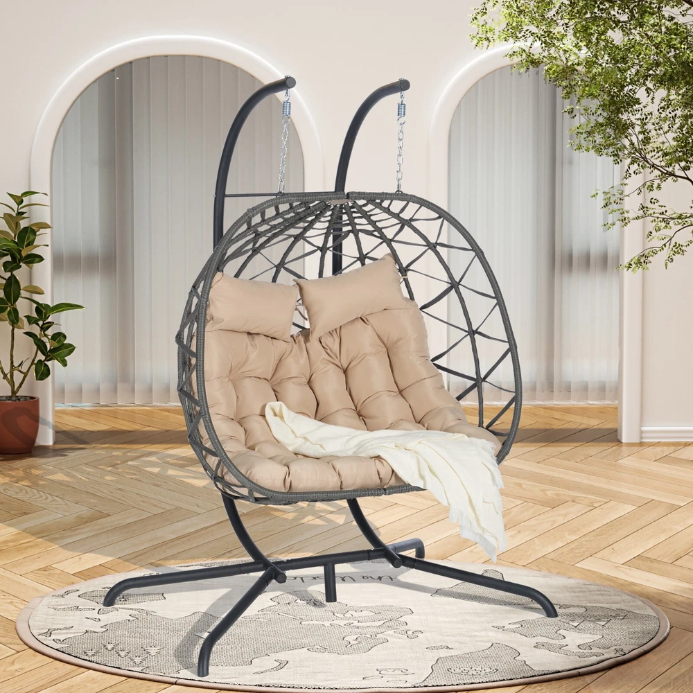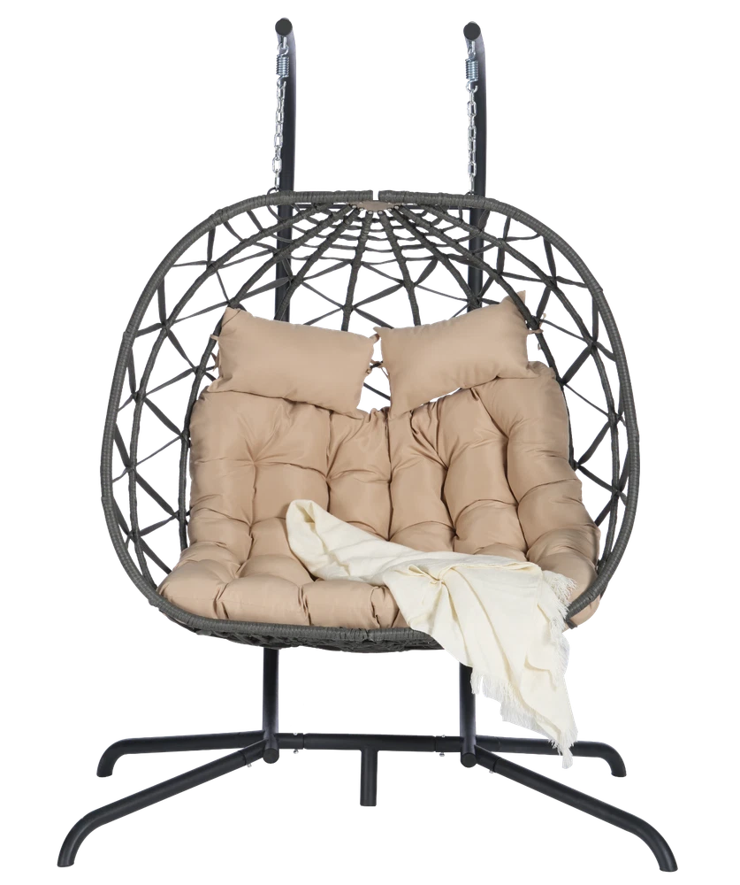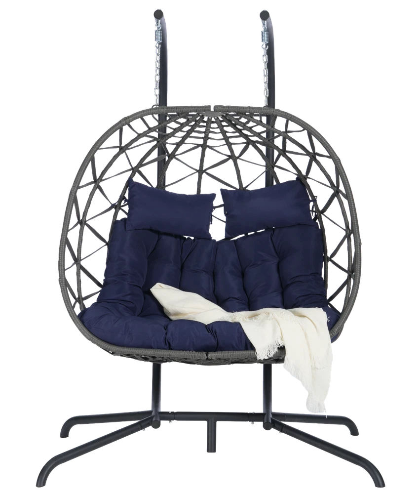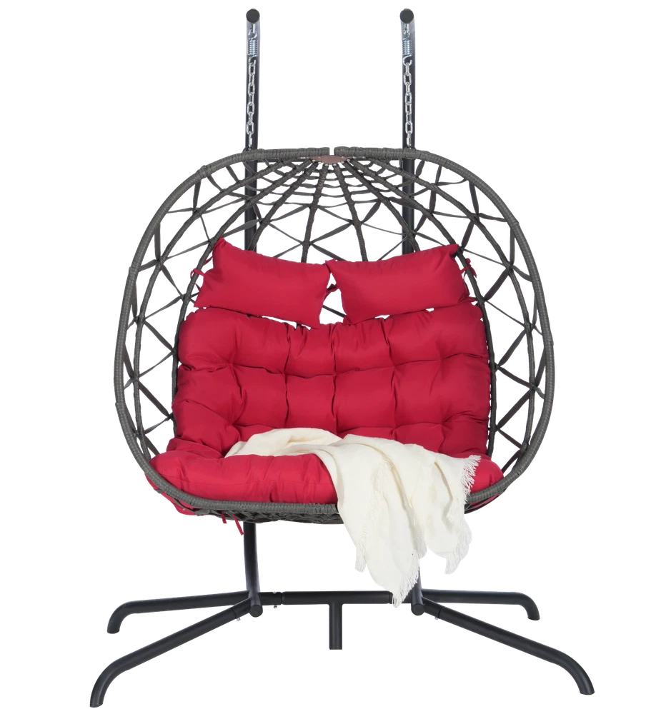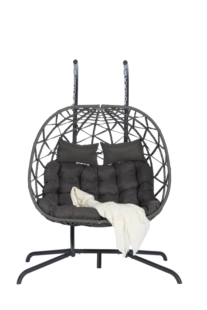 Description: This egg swing chair that fits 2 people comfortably was built to last in the outdoors with its strong durable iron frame it will be perfect for all weathers. Sit in luxurious comfort while surrounded by the peace and beauty of your backyard, or enjoy a good book indoors with this comfortable hanging chair. The seat cushions are made of premium polyester fabric and filled with cotton, it is soft and comfortable. The chair is crafted from wicker rattan, it is UV-Resistant, rust resistance and weather-resistant. Metal stand ensure the stability and safety for you and your family. Features: 1.High-quality durable iron frame, UV-Resistant, & rust resistance great for outdoor use 2.Hand-woven and handcrafted Wicker material by outstanding craftsmen 3.Cushion made from outdoor fabric and filled with soft Cotton, breathable design 4.Supported by a stand constructed from strong and durable iron 5.Fits 2 people and enough space for any position that you like 6.Iron Spreader Bar Included 7.Simple Assembly Required Specifications: Product Type: Egg Chair Style: Modern Seating Capacity: 2 Chair Frame Color: Dark Gray, Light Yellow Cushion Color: Dark Gray, Blue, Light Gray, Red, Khahi Frame Material: Iron Chair Material: Rattan With Stand: Yes Cushions Included:Yes Cushion Material: Polyester Fabric Seat Fill Material: Cotton Assembly Required: Yes Additional Tools Required: All Tools Included Est. Assembly Time: 30 Mins Weight Capacity: 600 lbs Dimension: 58.66"L x 38.18"W x 75.19"H Weight: 78 lb Number of Packages: 1 Package Included: 1x Egg Chair 2x Cushions 1x Stand 1x Hardware Bag 1x Instruction