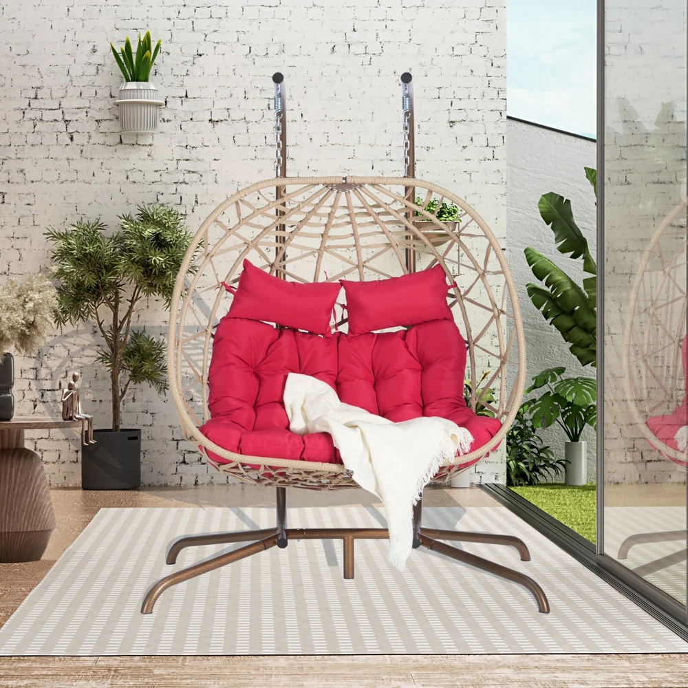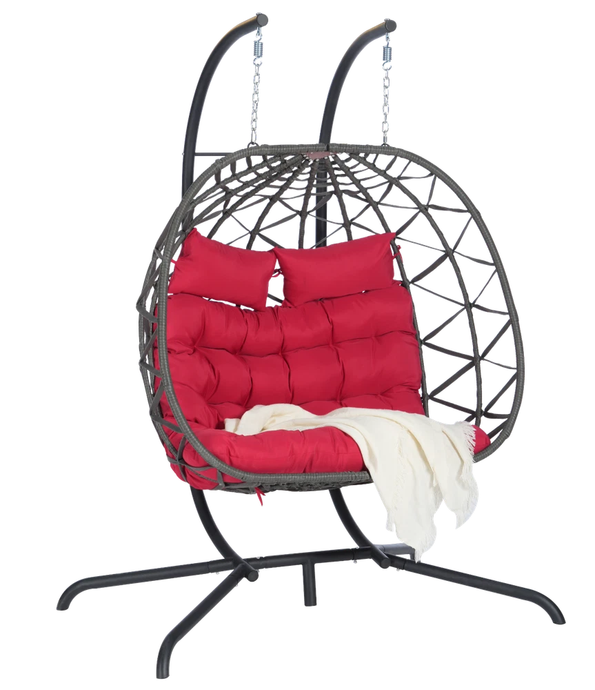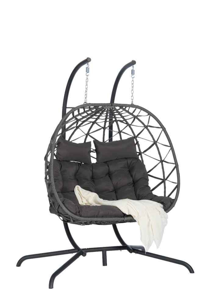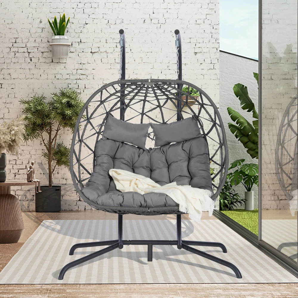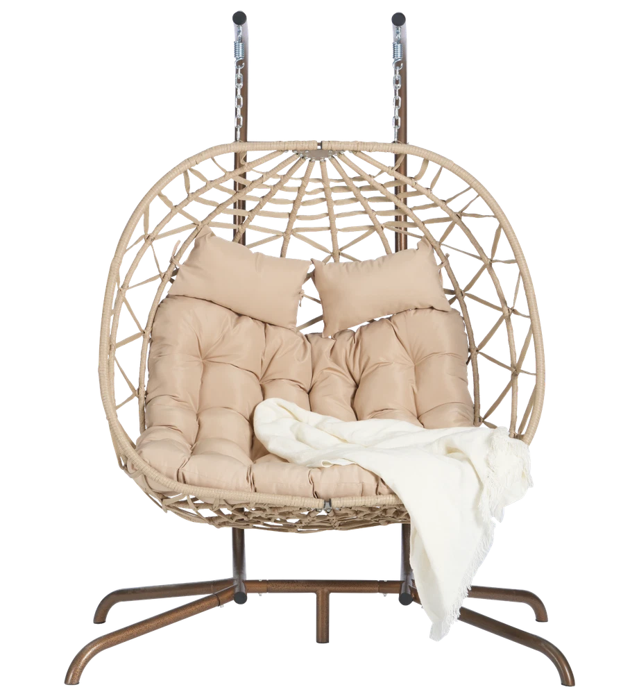 Description: This egg swing chair that fits 2 people comfortably was built to last in the outdoors with its strong durable iron frame it will be perfect for all weathers. Sit in luxurious comfort while surrounded by the peace and beauty of your backyard, or enjoy a good book indoors with this comfortable hanging chair. The seat cushions are made of premium polyester fabric and filled with cotton, it is soft and comfortable. The chair is crafted from wicker rattan, it is UV-Resistant, rust resistance and weather-resistant. Metal stand ensure the stability and safety for you and your family. Features: 1.High-quality durable iron frame, UV-Resistant, & rust resistance great for outdoor use 2.Hand-woven and handcrafted Wicker material by outstanding craftsmen 3.Cushion made from outdoor fabric and filled with soft Cotton, breathable design 4.Supported by a stand constructed from strong and durable iron 5.Fits 2 people and enough space for any position that you like 6.Iron Spreader Bar Included 7.Simple Assembly Required Specifications: Product Type: Egg Chair Style: Modern Seating Capacity: 2 Chair Frame Color: Dark Gray, Light Yellow Cushion Color: Dark Gray, Blue, Light Gray, Red, Khahi Frame Material: Iron Chair Material: Rattan With Stand: Yes Cushions Included:Yes Cushion Material: Polyester Fabric Seat Fill Material: Cotton Assembly Required: Yes Additional Tools Required: All Tools Included Est. Assembly Time: 30 Mins Weight Capacity: 600 lbs Dimension: 58.66"L x 38.18"W x 75.19"H Weight: 78 lb Number of Packages: 1 Package Included: 1x Egg Chair 2x Cushions 1x Stand 1x Hardware Bag 1x Instruction