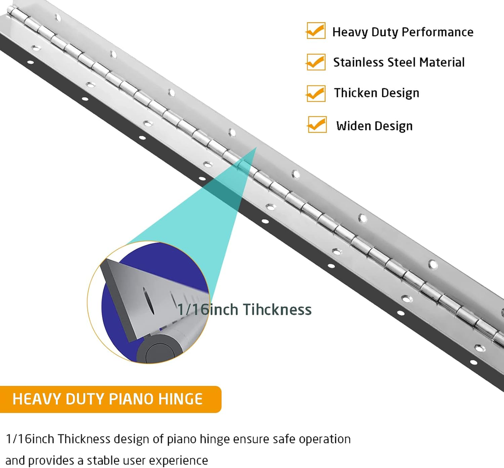 Store New Arrivals Add to Favorite View Feedback Contact 2 Piece 2" X 20" Stainless Steel Piano Hinge, 0.060" / 1/16" Thick Heavy Duty with Holes, Silver Continuous Hinges for Wood Furniture Mailbox Tool/Storage Boxes Cabinets Door Description Item model number AODESTINY Unit Count 2.0 Count Batteries Required? No Finish Unfinished Hole Count 80 Mounting Type Door Mount Part Number PIANOH-20SL-220625-MA Color Silver Brand AODESTINY Material Stainless Steel Item Weight 1.39 pounds Manufacturer AODESTINY Size 20Inch x 2Inch Finish Type Unfinished Product Dimensions 20"L x 2"W Number Of Pieces 2 PACKAGE: Includes 2 pieces 20 inch STAINLESS STEEL piano hinges with holes for quick installations; Note-screws are not included HEAVY DUTY PIANO HINGES: Stainless piano hinges are 0.060” thick, thicker than most other hinges on the market (0.035"-0.04" thick); Sliver hinges are made of high-quality stainless steel with a smooth finish for durability and strength CONTINUOUS HINGES SIZE: The stainless door hinge has 2 inch opening width, suit for hanging more heavy doors and fold-down seats; joined together by pins, the continuous piano hinges distribute weight evenly, minimizing stress while maintaining smooth function Easy To Cut: 20 inch stainless piano hinges can be easily cut to size to create multiple small piano hinges for your DIY projects, such as used tool boxes, electrical boxes, and barn doors; Countersunk screw holes every 2" ensure maximum strength; Continuous piano hinge produce less noise than normal door hinges and provides a high level of security and privacy Wide Applications: Piano hinges heavy duty has a wide variety of creative applications, such as support sheds, fold-down work benches or desks, cabinet doors, gift boxes and storage boxes, piano hinges can be used for similar purposes; Piano hinges provide additional support for doors, windows or other furniture that may be installed, and are also used in areas including furniture manufacturing, interior design and construction Product description AODESTINY 2Inch Width Heavy Duty Piano&Continuous Hinges Piano hinges can be used to support the lid of upright pianos; It also can be used for a variety of other applications. These types of hinges provide extra stability, strength and support while being highly durable, being ideal for wood furniture mailbox tool storage boxes cabinets door hinges 2Inch WIDENED DESIGN 2Inch/50mm Widened Design Provide Extra Stability & Strength Highly Durable & Good Supporting VARIOUS SIZE PIANO HINGES FOR YOUR CHOICE We Provides 2 Size Type of Piano Hinges 18Inch - 20Inch You Can Choice What Is The Size As You Want Such As Used Tool Boxes, Electrical Boxes & Barn Doors Stainless Steel Piano Hinges Can Be Easily Cut To Size To Create Multiple Small Piano Hinges For Your DIY Projects 1 WOODEN BOX 2 CABINETS DOOR 3 ELEGANT PIANO 4 FURNITURE BOXES MORE FEATURES OF PIANO HINGES VERSATILE TYPE OF PIANO HINGES FOR YOU Add to Cart Add to Cart Add to Cart Add to Cart Add to Cart Customer Reviews 4.4 out of 5 stars 267 4.4 out of 5 stars 267 4.4 out of 5 stars 267 4.4 out of 5 stars 267 4.2 out of 5 stars 23 4.4 out of 5 stars 267 Price $18.99 $ 18 . 99 $19.99 $ 19 . 99 $22.99 $ 22 . 99 $23.99 $ 23 . 99 — $24.99 $ 24 . 99 SIZE 18Inch 18Inch 20Inch 20Inch 12Inch 20Inch COLOR Silver Black Silver Black Black Black QUANTITY 2PCS 2PCS 2PCS 2PCS 4PCS 2PCS MATERIAL Stainless Steel Stainless Steel Stainless Steel Stainless Steel Stainless Steel Stainless Steel OPEN WIDTH 2Inch 2Inch 2Inch 2Inch 1.2Inch 2-1/2Inch THICKNESS 0.06Inch 0.06Inch 0.06Inch 0.06Inch 0.047Inch 0.06Inch ABOUT US We offer the best prices around on high quality products. Our E-store includes media such as books, movies, music and games while offering electronics, toys, sporting apparel, clothing, tools, general home, garden items and more. SHIPPING We are always working hard to ensure your package arrives as soon as possible. Please understand that some factors like weather, high postal traffic, and the performance of shipping companies are outside of our control. We offer free shipping to the lower 48 states and ship within 2 business days of payment, usually sooner. We do not accept P.O. Boxes. Please provide a physical address. RETURNS We offer a 30-Day Return Policy on items which you are not completely satisfied with. You have the option for a full-refund or an exchange of the item. No returns are available on items shipped outside of the USA. PAYMENT We accept PayPal. CONTACT US This page content is yet to come Please ad us to your favorite seller and visit again later Thank You CUSTOMER SATISFACTION We try our very best to make sure every customer is completely satisfied. If there's a problem, message us! We're happy to help.